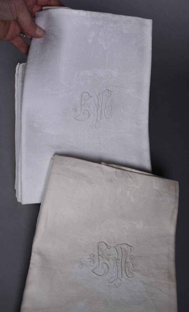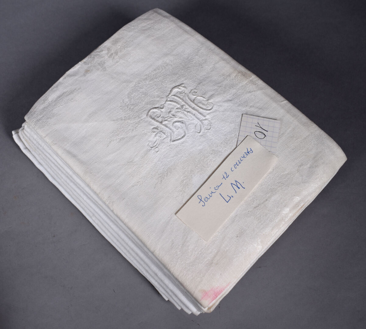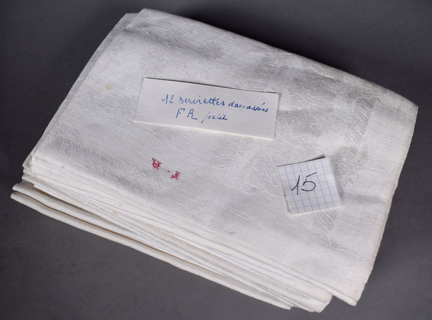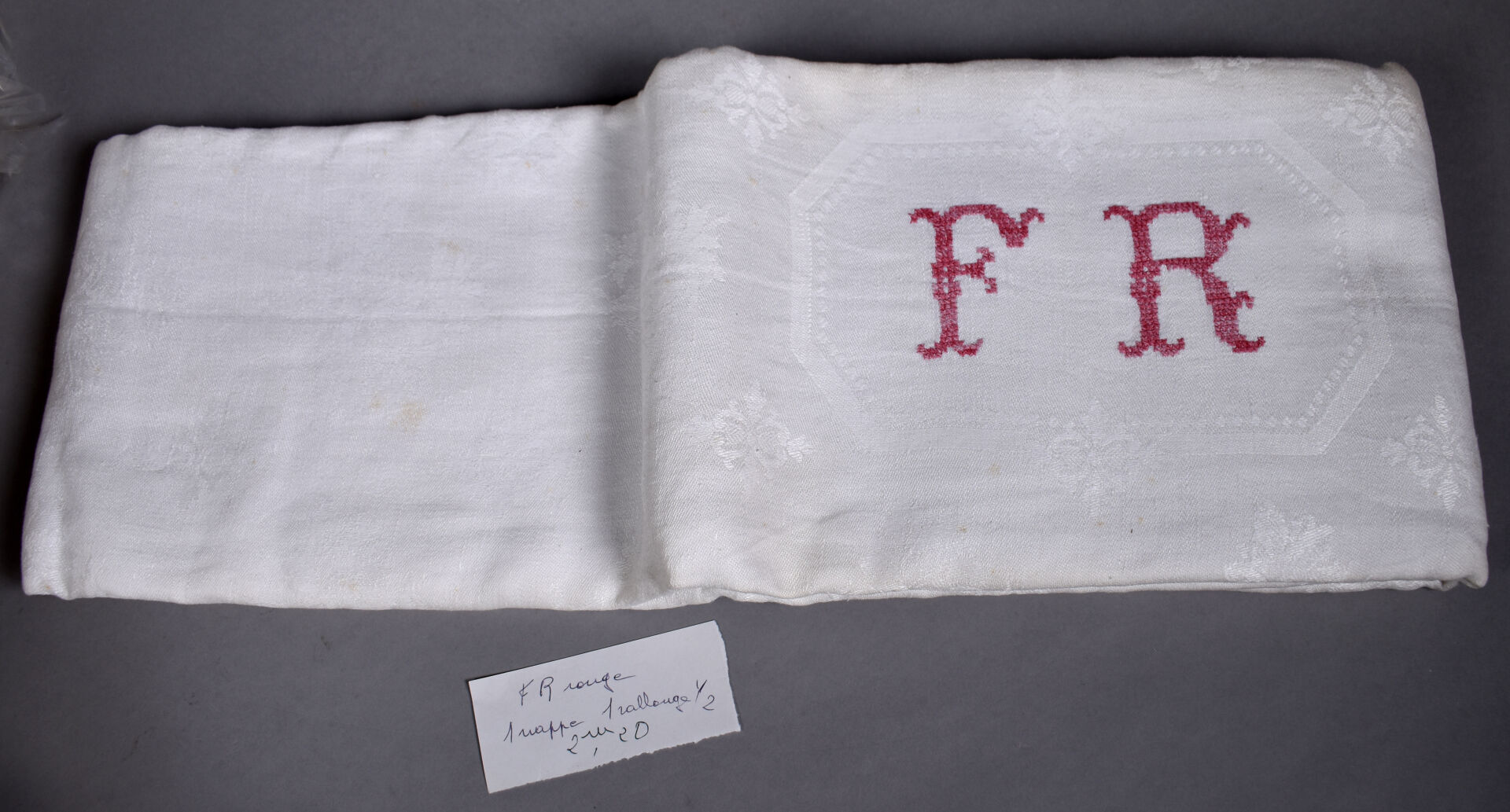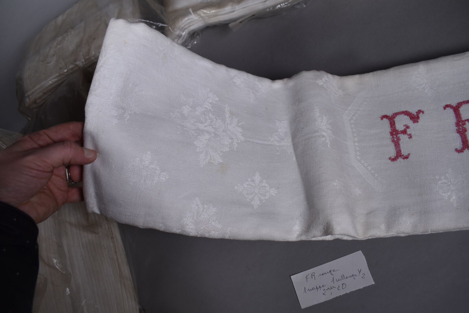 Ensemble de linge brodé (piqures) soit 10 serviettes brodées LM, 12 serviettes FR, 1 nappe FR, 1 nappe FR rouge, 12 serviettes damassées FR, 12 serviettes chiffrées CB, 12 serviettes RB, et une nappe brodée LR.