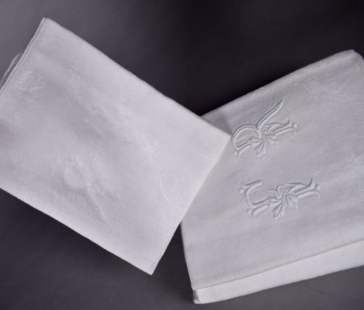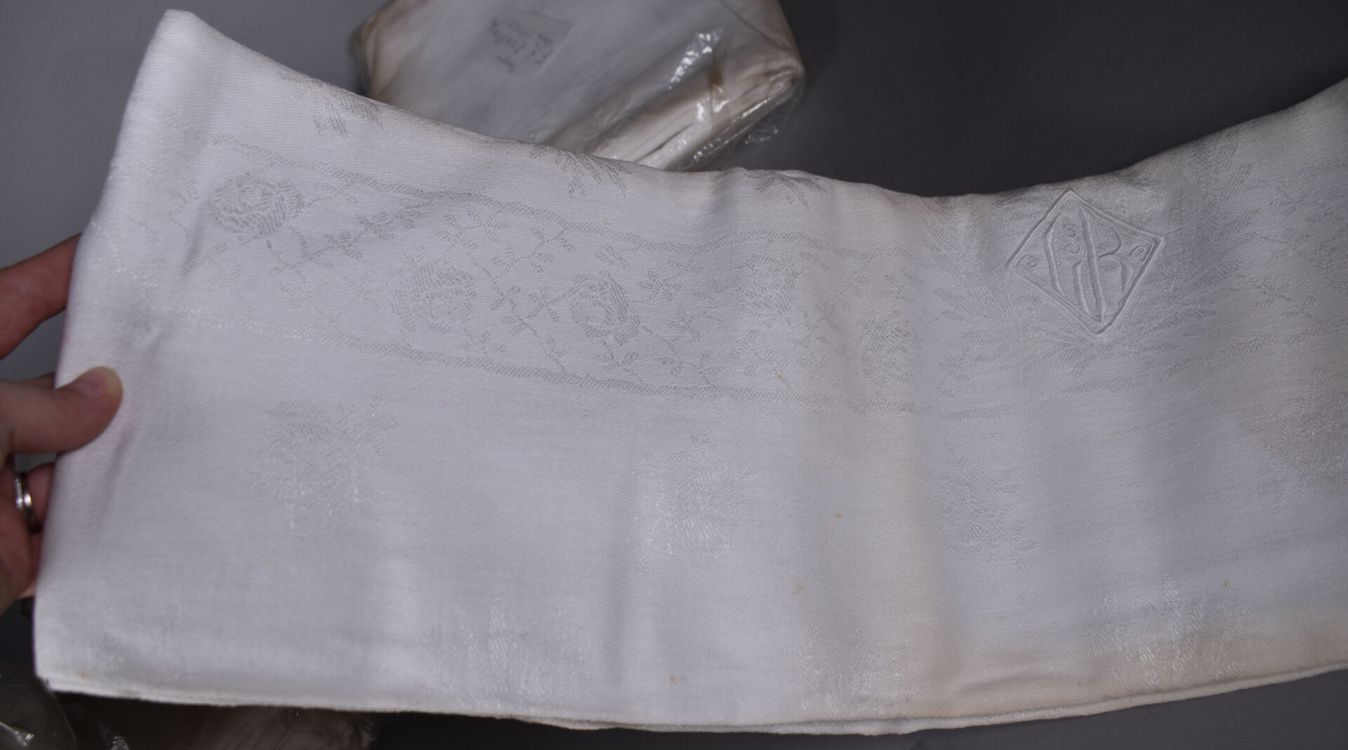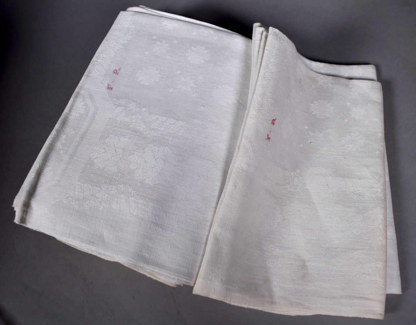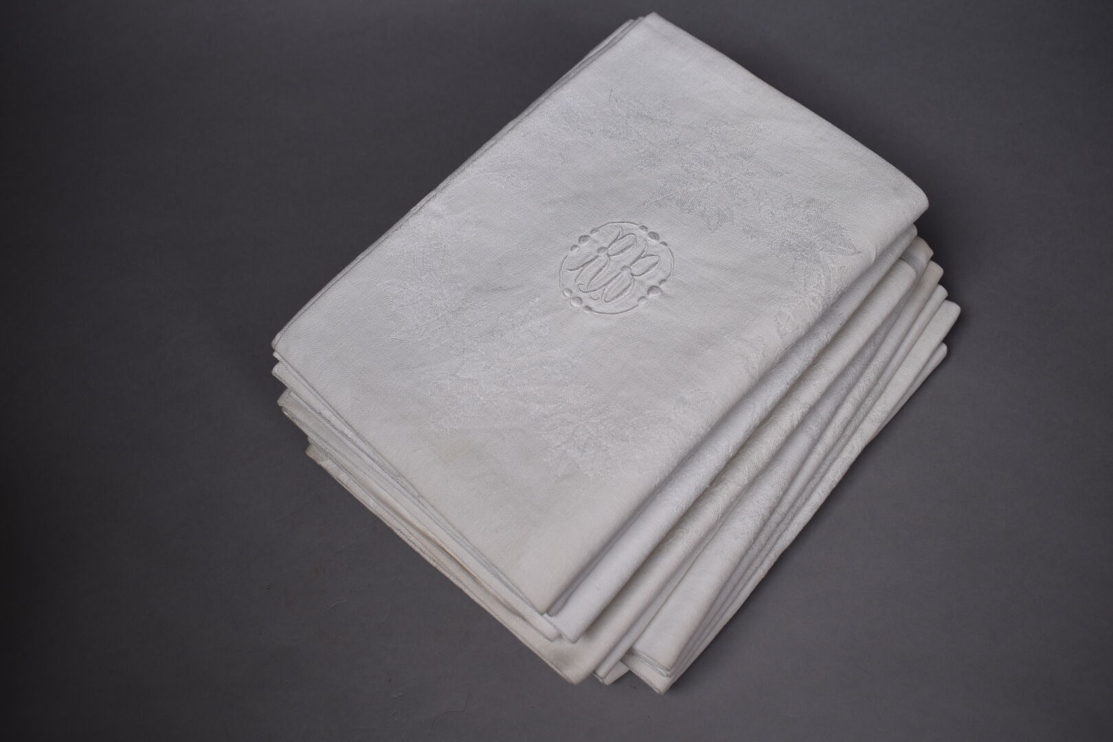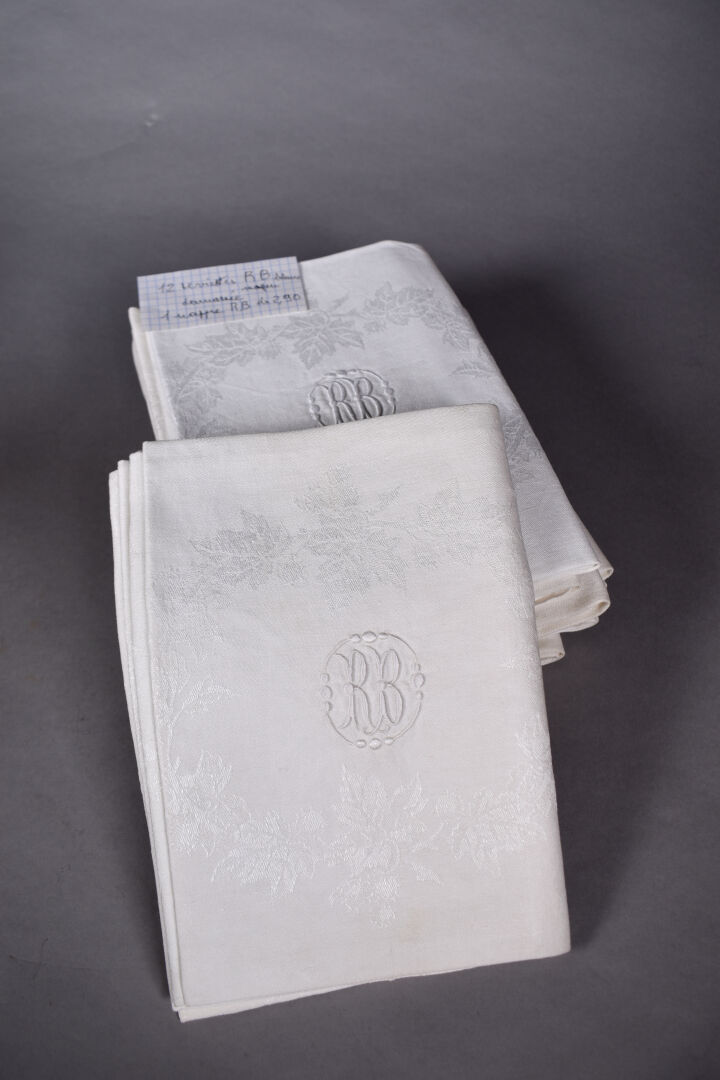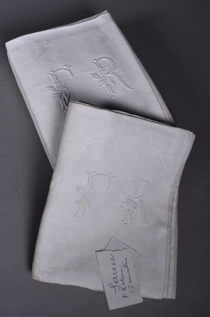 Ensemble de linge brodé (piqures) soit 10 serviettes brodées LM, 12 serviettes FR, 1 nappe FR, 1 nappe FR rouge, 12 serviettes damassées FR, 12 serviettes chiffrées CB, 12 serviettes RB, et une nappe brodée LR.