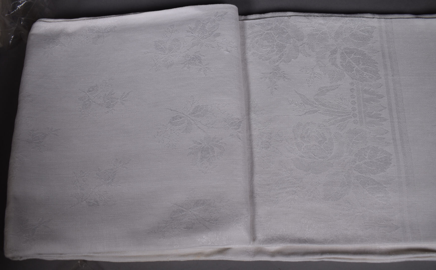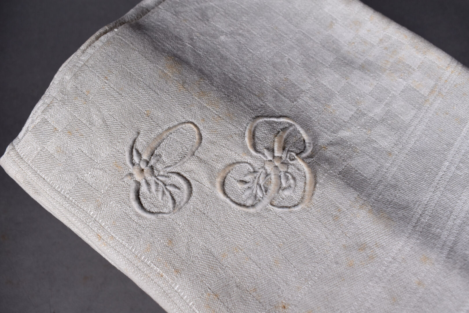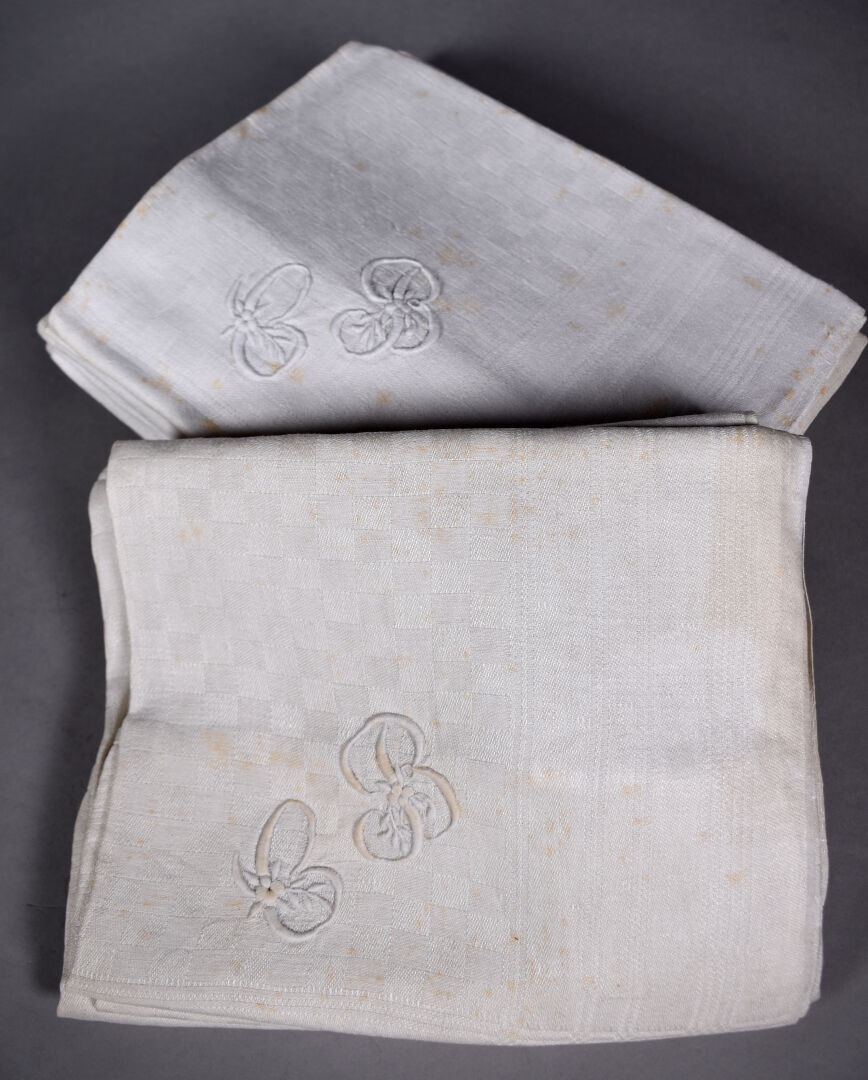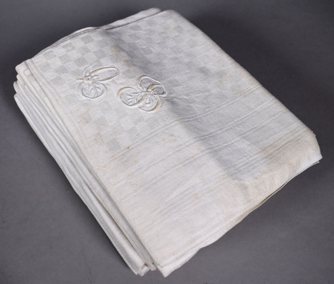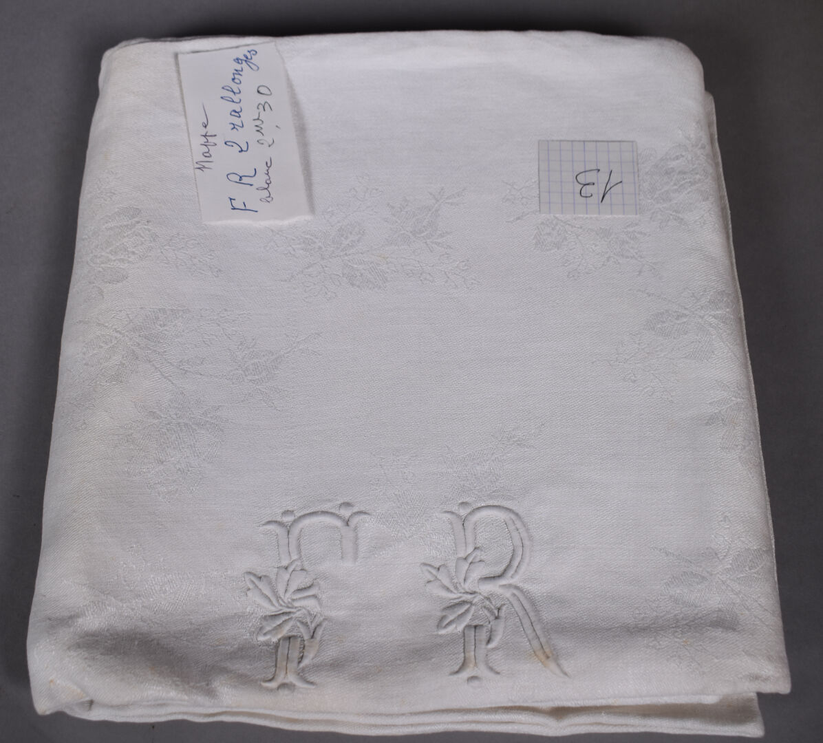 Ensemble de linge brodé (piqures) soit 10 serviettes brodées LM, 12 serviettes FR, 1 nappe FR, 1 nappe FR rouge, 12 serviettes damassées FR, 12 serviettes chiffrées CB, 12 serviettes RB, et une nappe brodée LR.