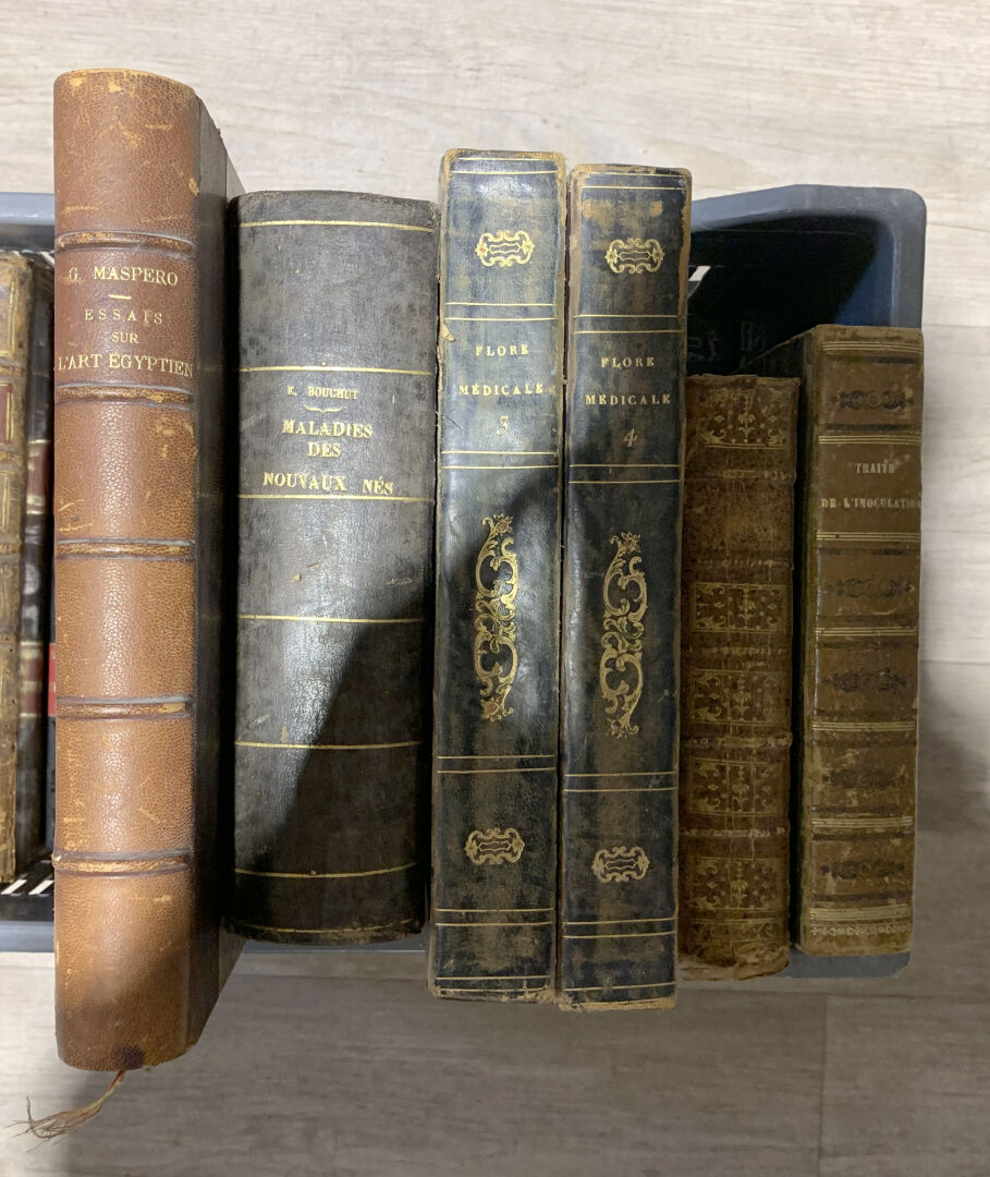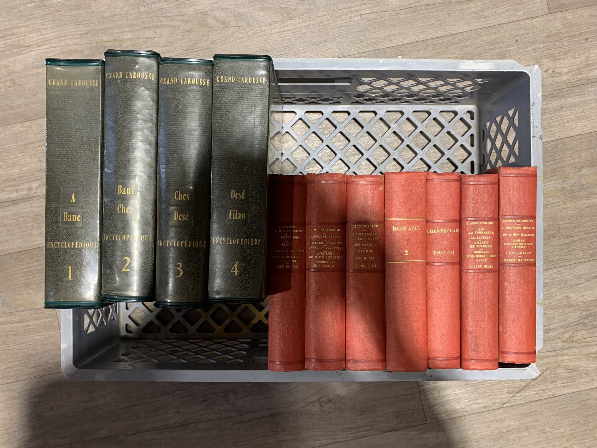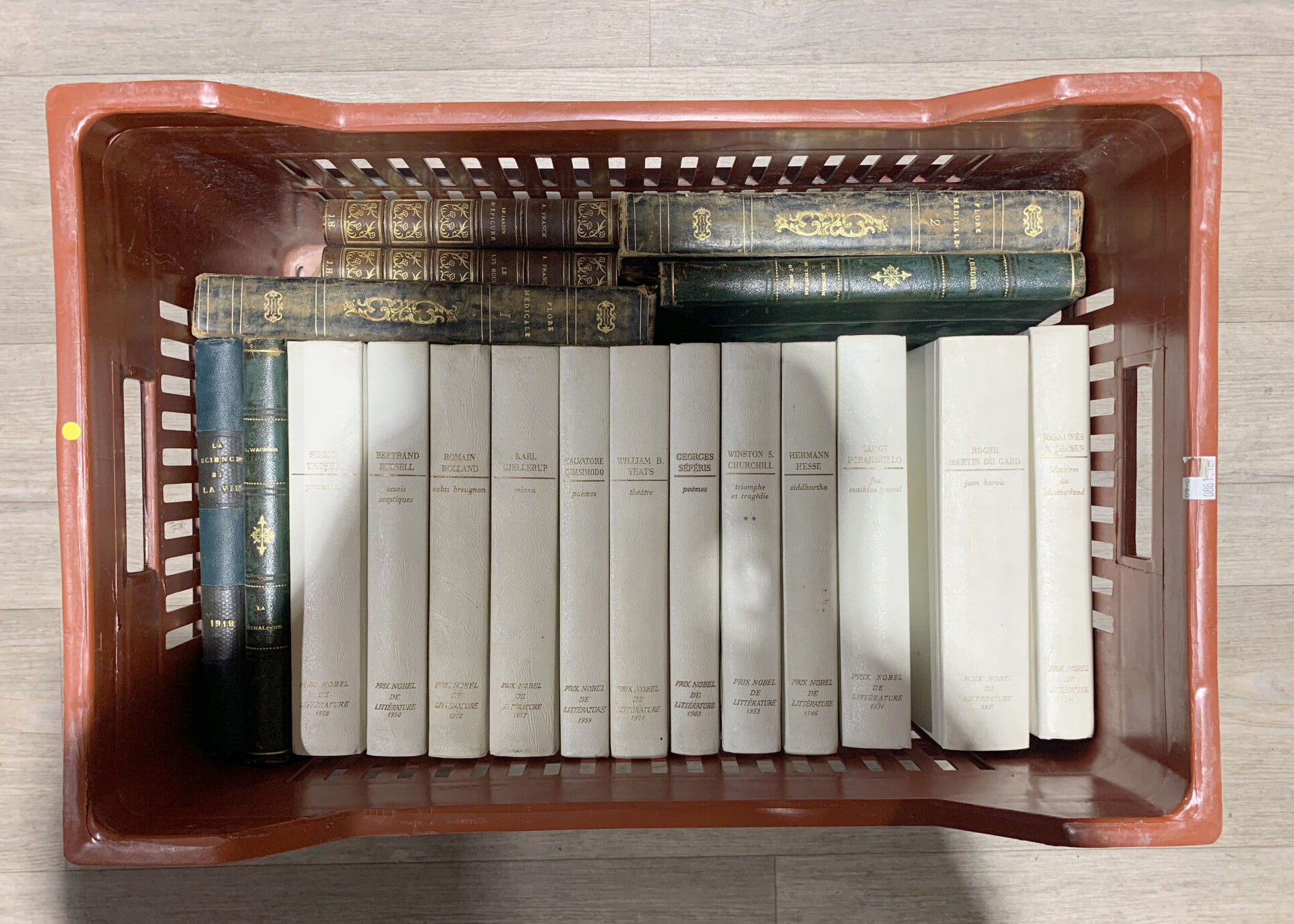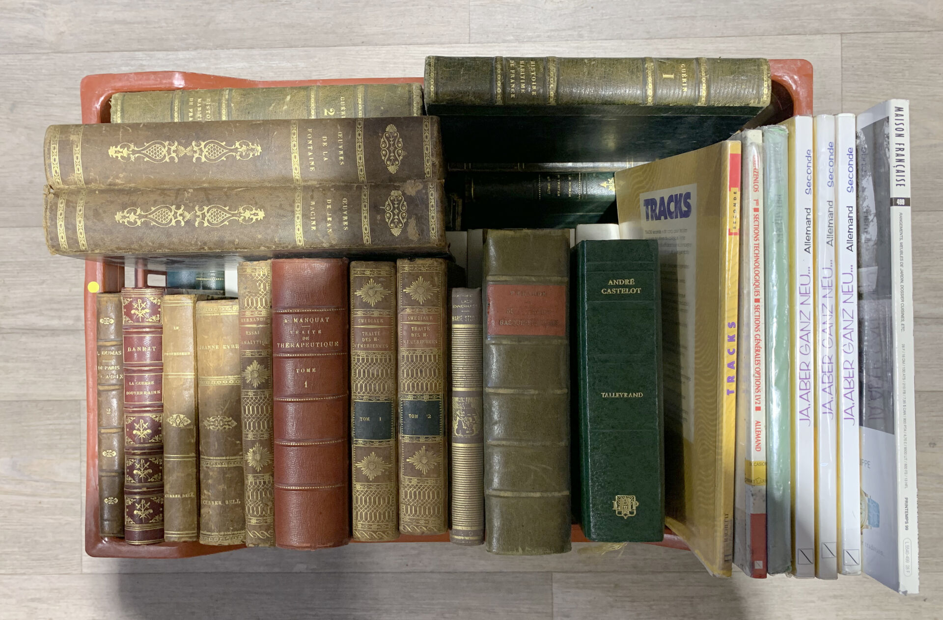 Ensemble de livres dont : Partie de la Collection des Prix Nobel de Littérature éditée sans le patronage de l’Acédémie Suédoise et de la Fondation Nobel, A. MANQUAT – Traité de Thérapeutique – 1900, A. CASTELOT – Talleyrand – 1980, F. DE SALES – Traité de l’Amour de Dieu – 1738, Père DE GONNELIEU – De la Présence de Dieu – 1739, Lettres intéressantes du Pape Clément XIX – 1776, Abbé de MONTIS – La Vie de Sœur de Foix – 1774 et divers (rousseurs, humidité, déchirures, incomplets et usures d’usage).
