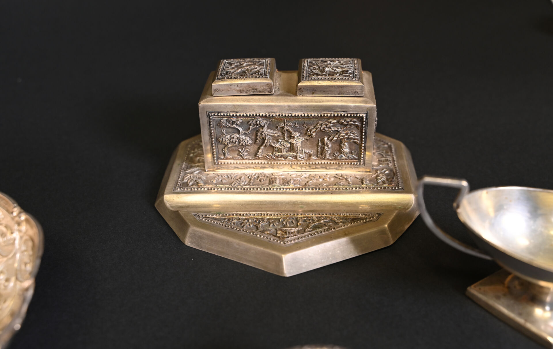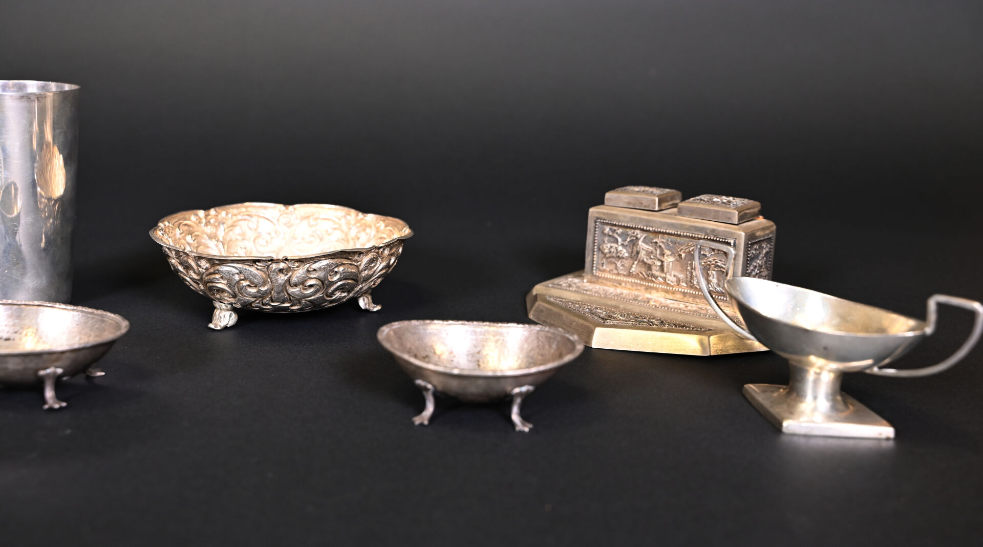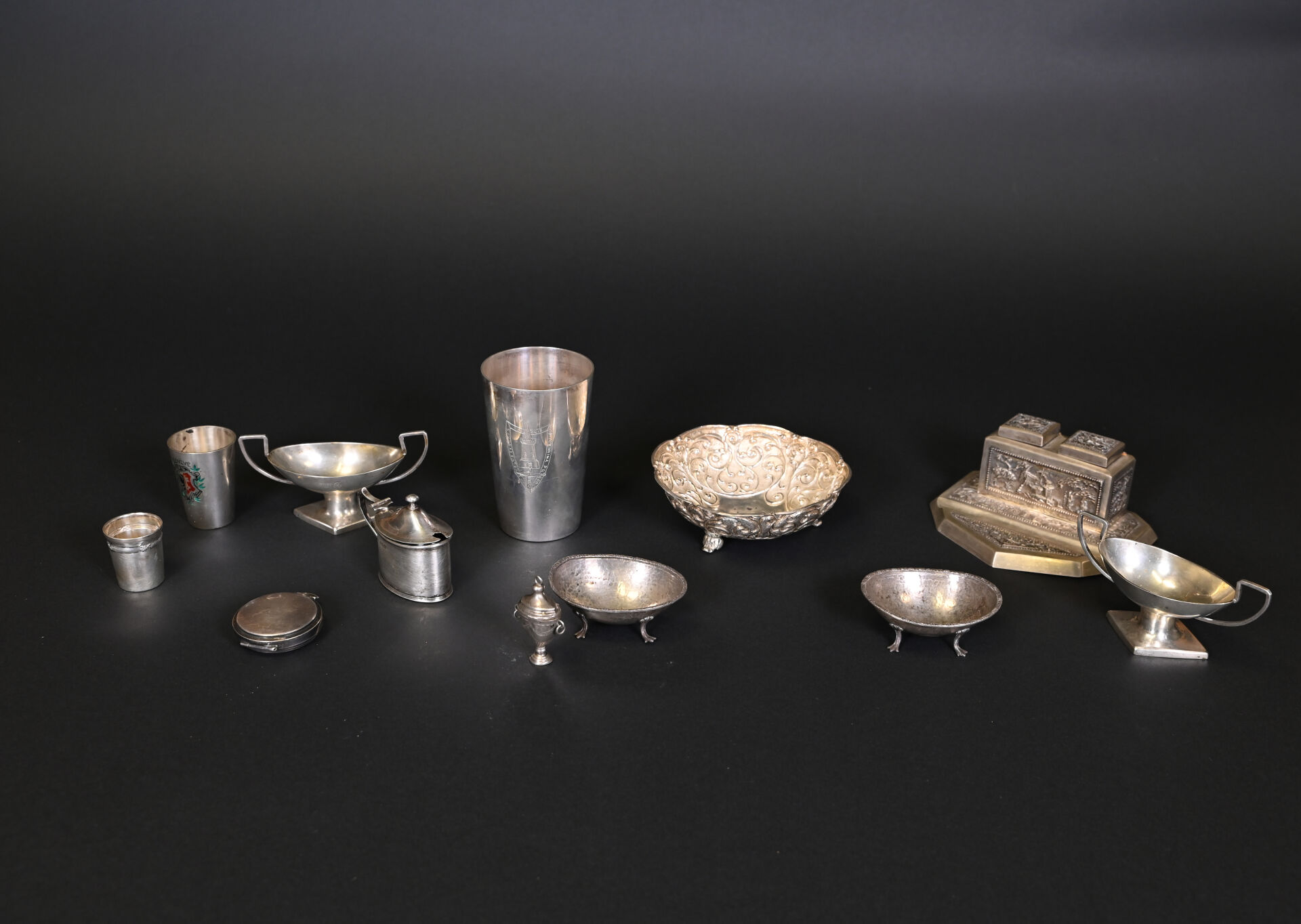 Ensemble de menus objets, boites, coupes, pommeaux de cannes, encrier, timbales et divers en argent 800/1000e dont travail étranger. Poids total. : 871 g. Un pommeau en argent représentant un col de cygne, les yeux en verre vert. Poids brut. : 31 g.