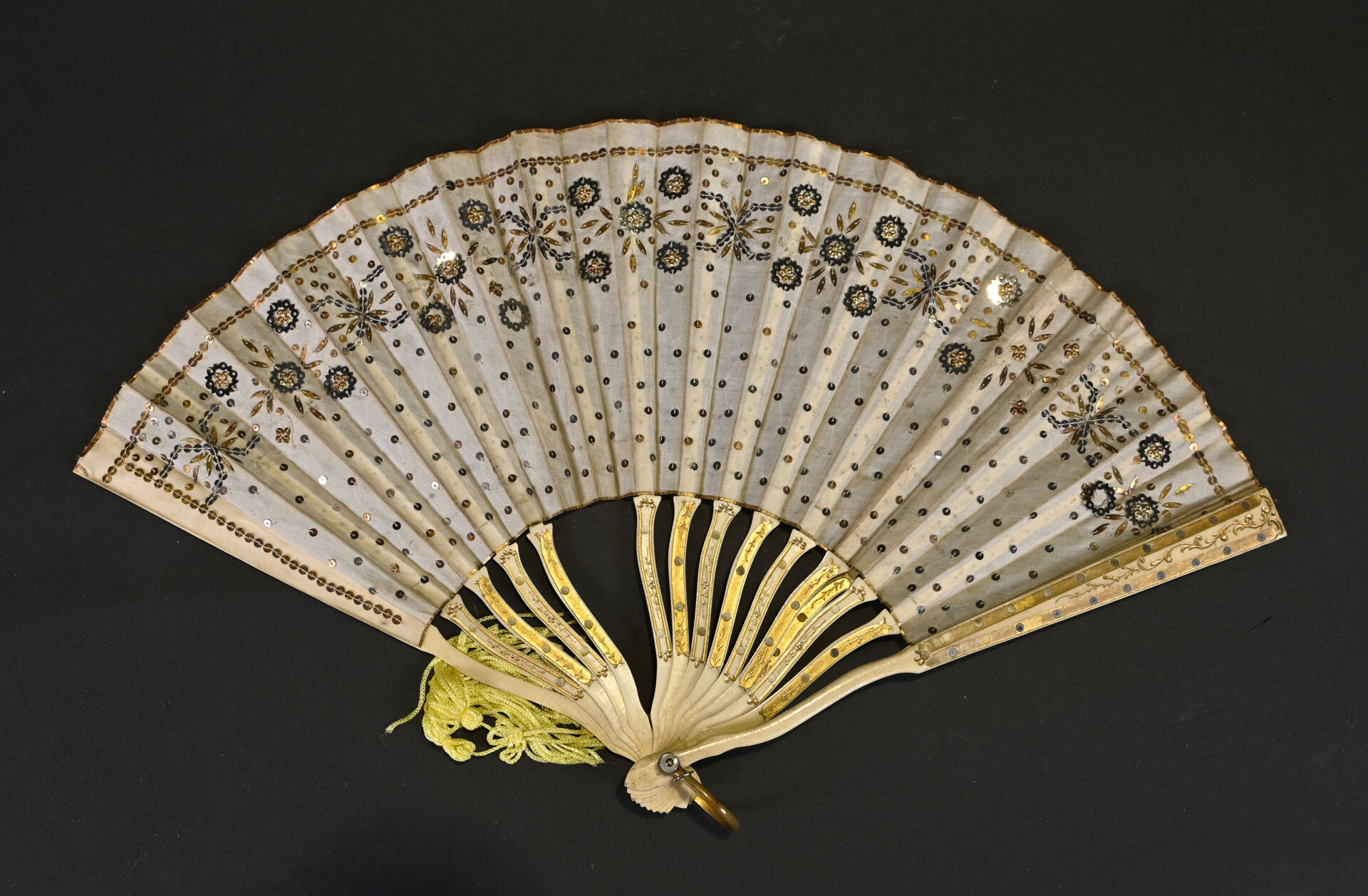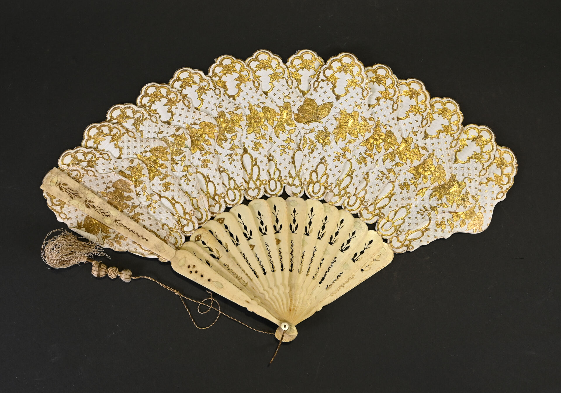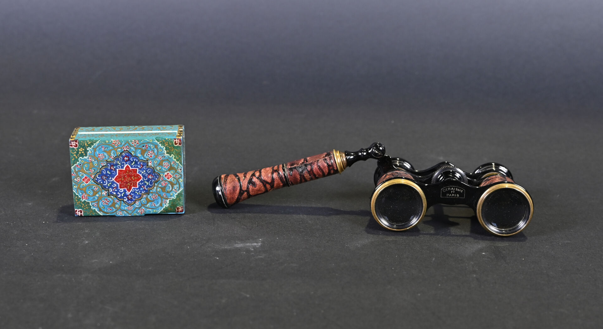 Ensemble de menus objets dont 6 éventails, une paire de jumelles de théâtre et une petite boite peinte dans le goût Perse (usures).