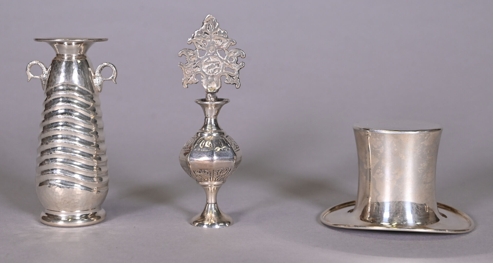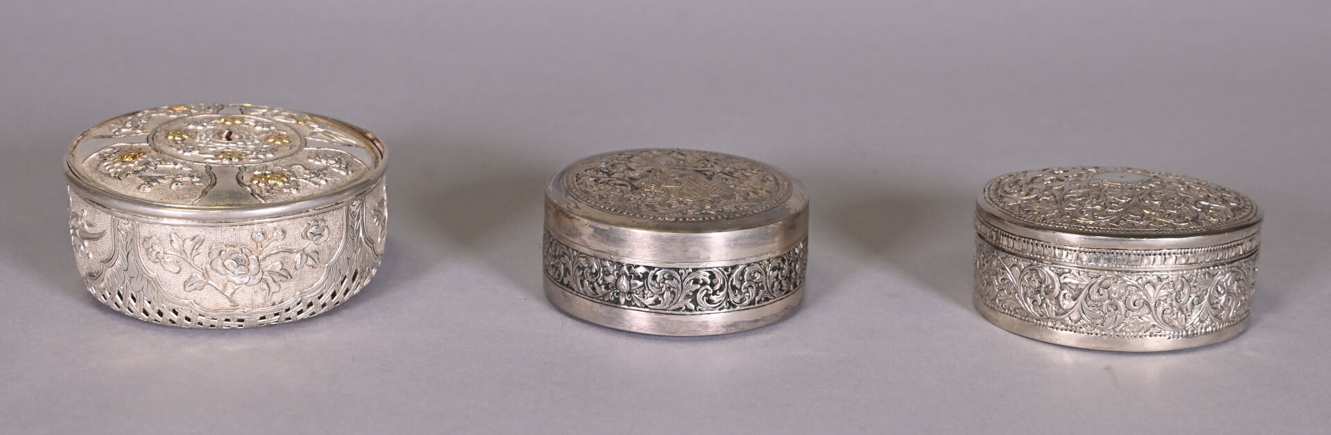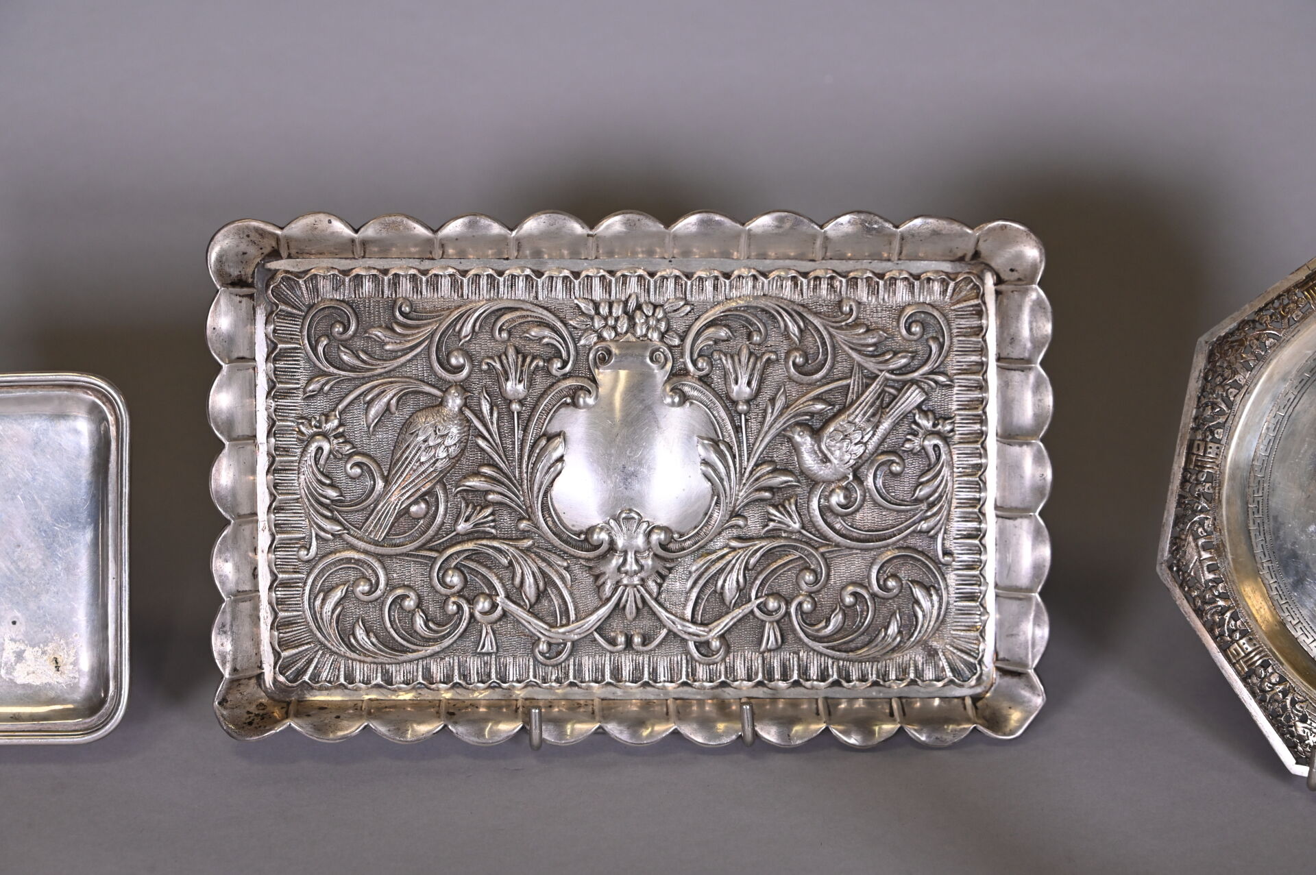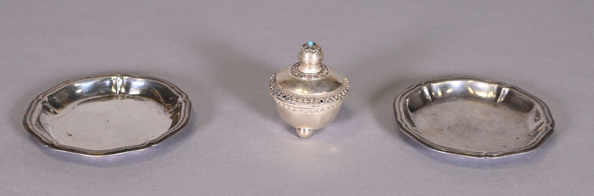 Ensemble de menus objets en argent 925/10000e et 800/1000e dont petits plateaux, tasses, boite à grillon et divers, en grande partie Perse et Asie (usures, enfoncements , trous). Poids total : 1641 g.