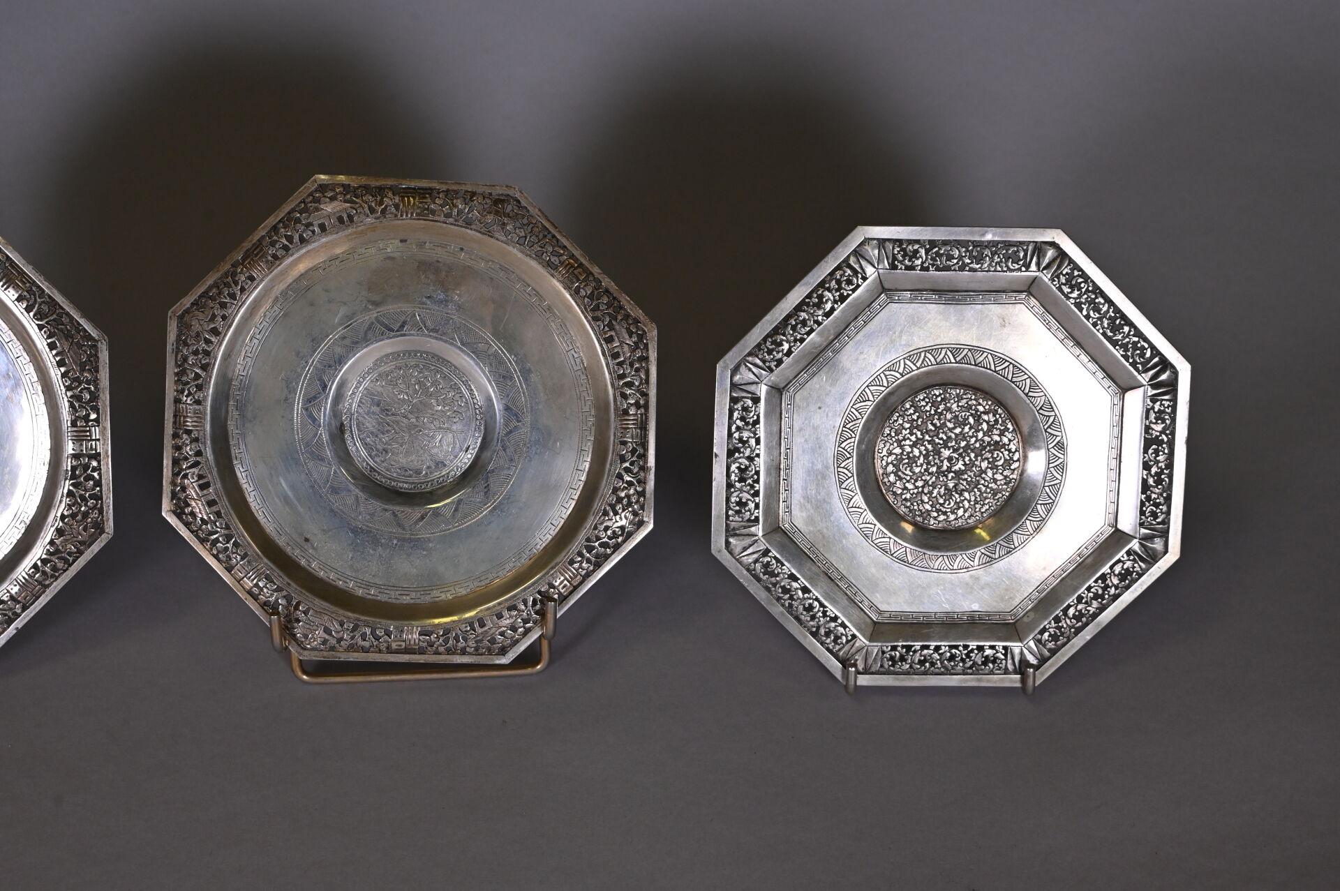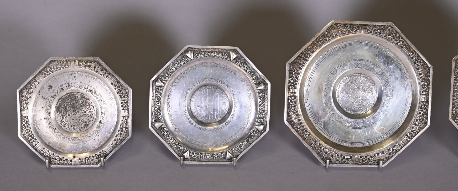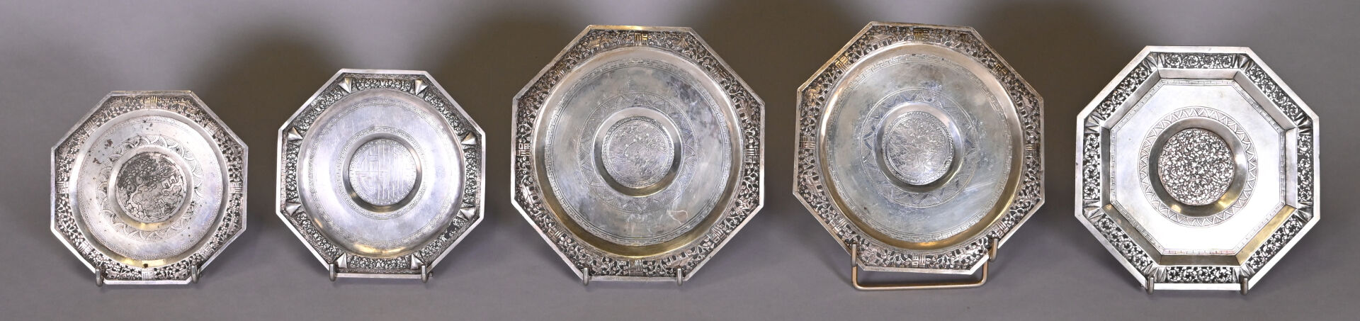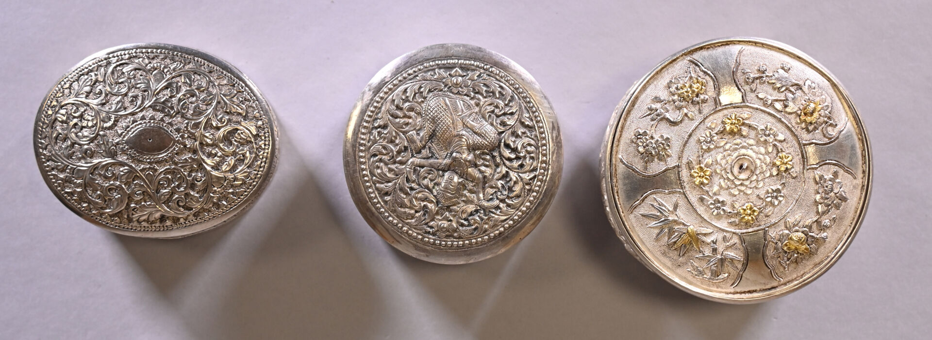 Ensemble de menus objets en argent 925/10000e et 800/1000e dont petits plateaux, tasses, boite à grillon et divers, en grande partie Perse et Asie (usures, enfoncements , trous). Poids total : 1641 g.