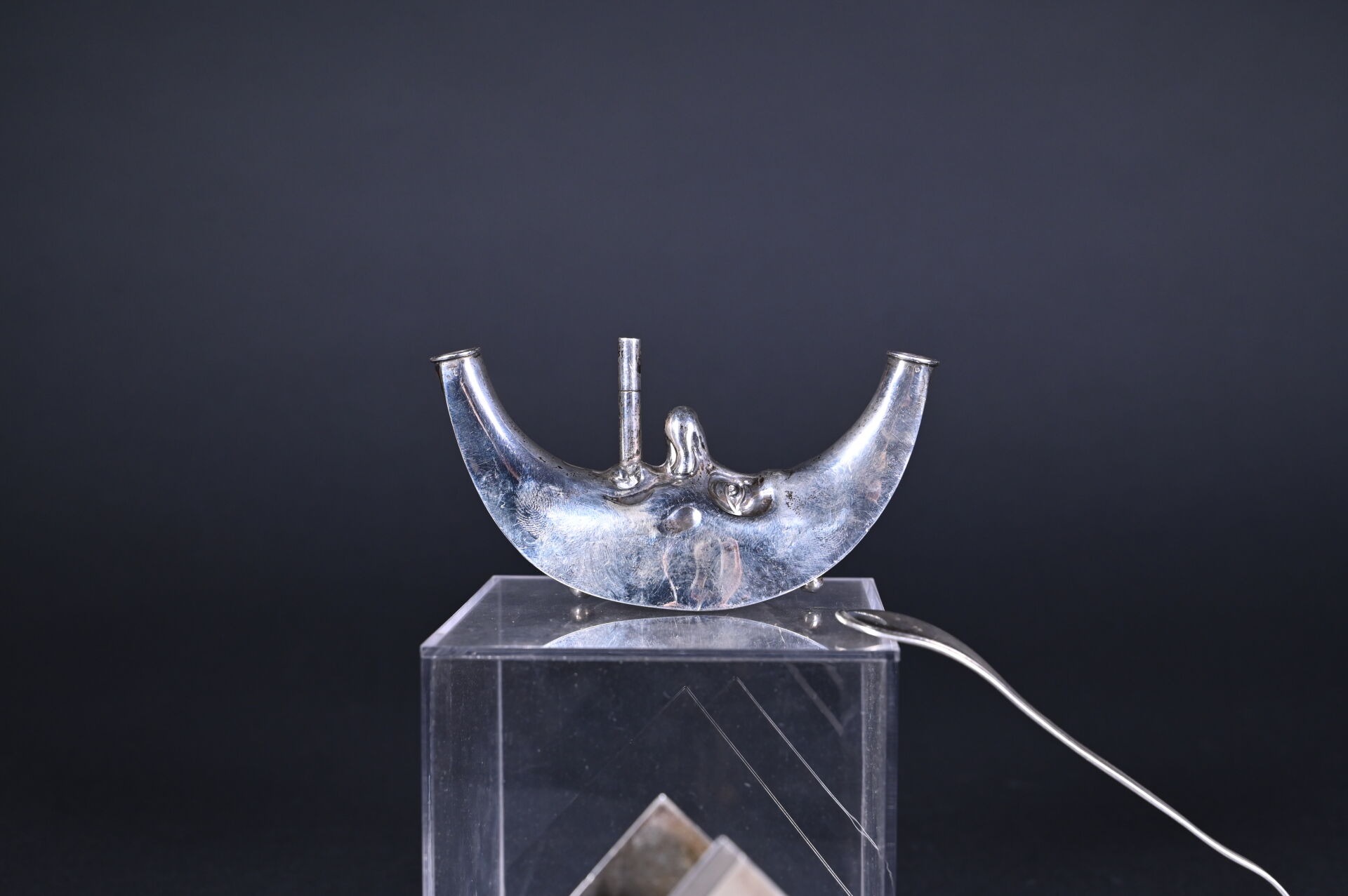 Ensemble de menus objets en argent 925/1000e et 800/1000e, un porte lettre soit une cuillère à sauce, deux piluliers, une broche oiseau à strass et une lune. Poids brut total : 309 g. A charge.