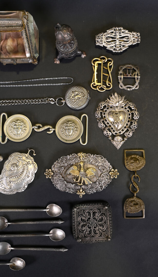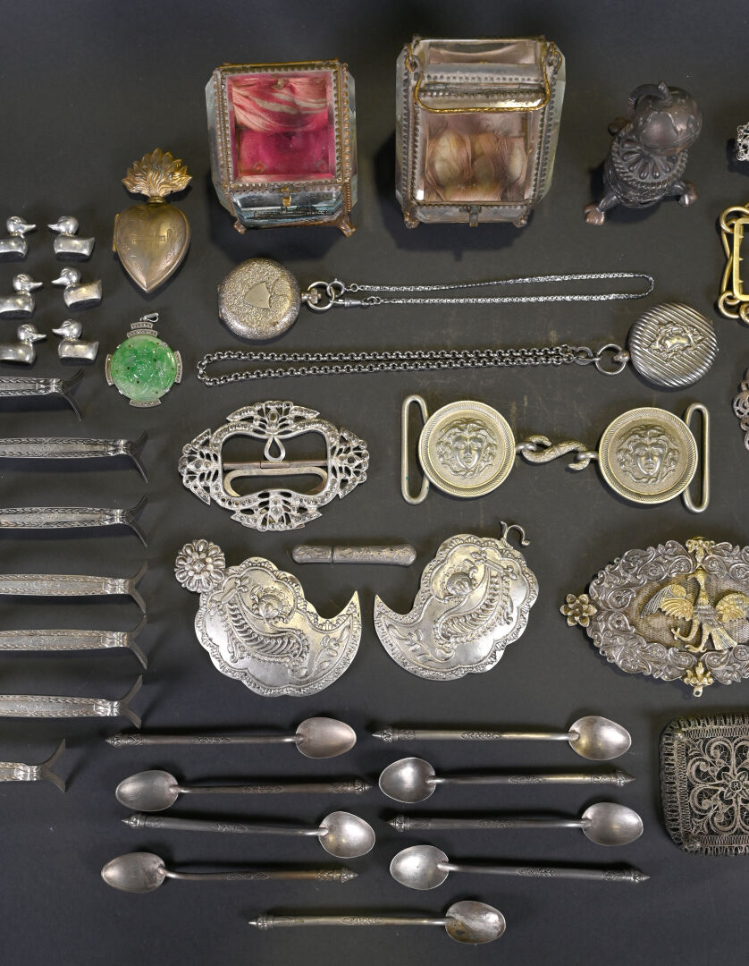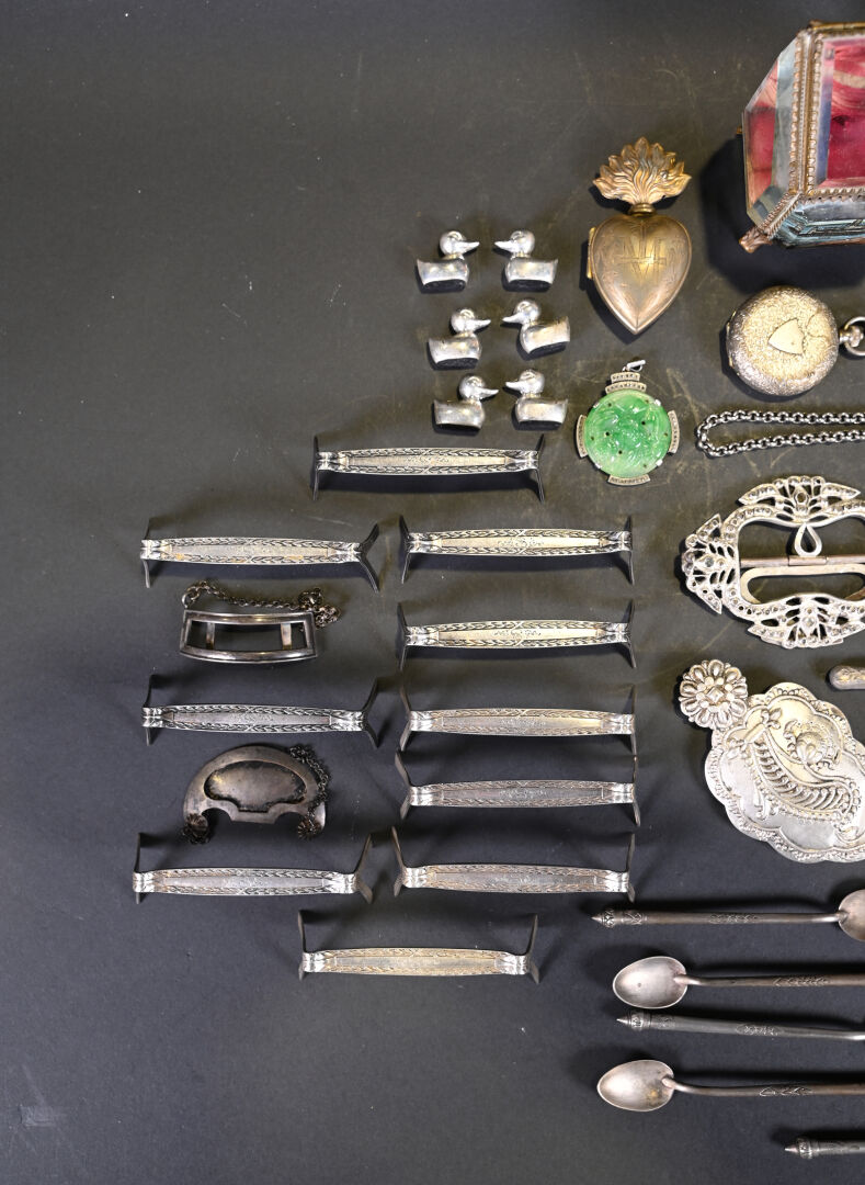 Ensemble de menus objets en métal, métal argenté dont repose-couteaux, boucles de ceinture, médaillon « coeur en flammes, petites cuillères, porte-montres avec montres de gousset et divers.