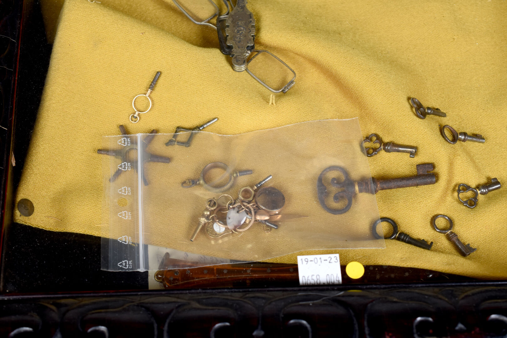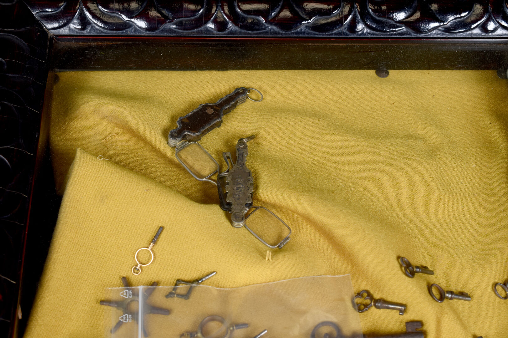 Ensemble de menus objets présentés dans un cadre à caisson soit des clés de coffrets, des clés de montres et remontoir en or jaune 18K 750/1000e et métal, pendentifs en or jaune 18K et métal, lunettes pliantes et divers. Poids brut or : 12 g.