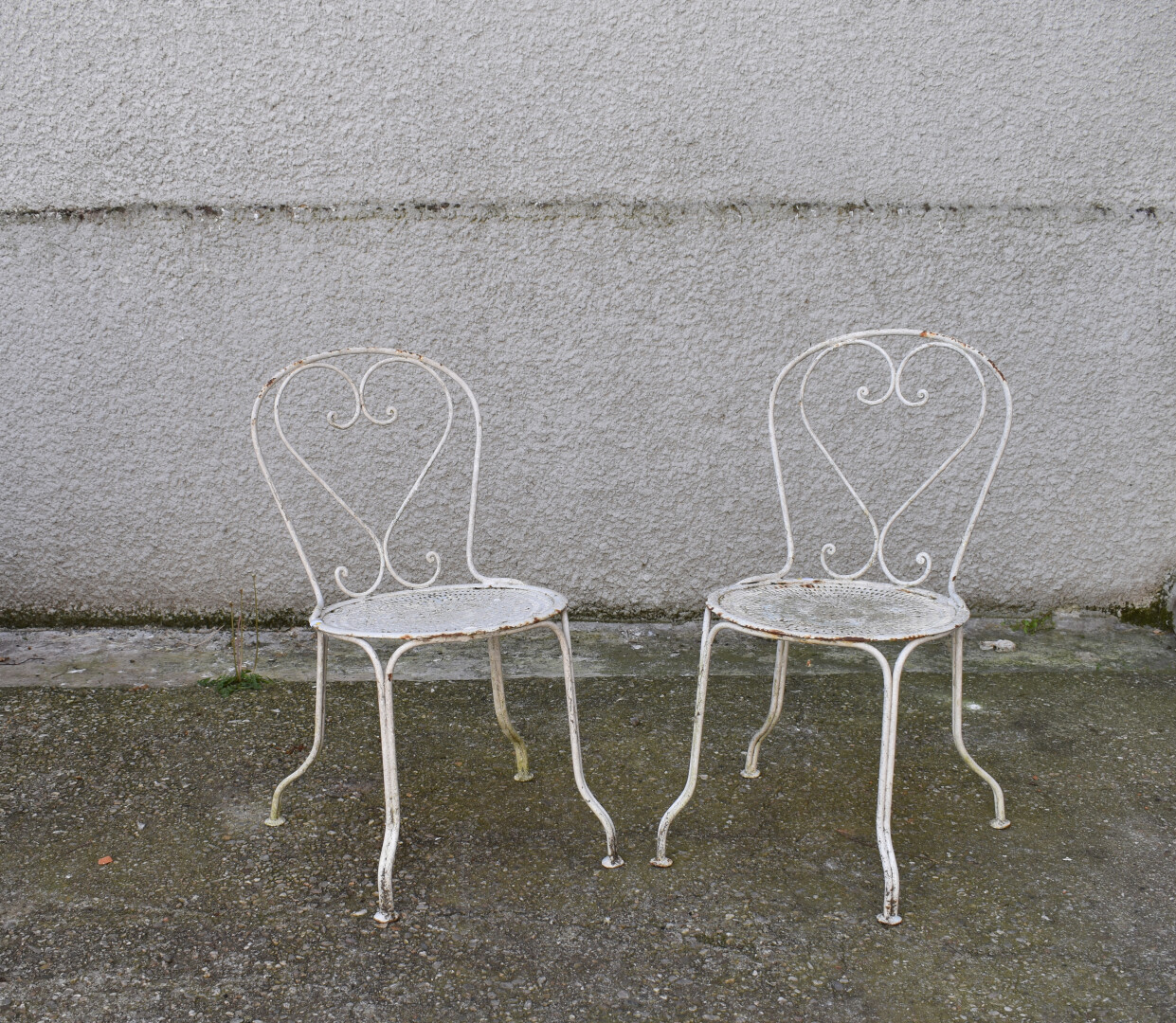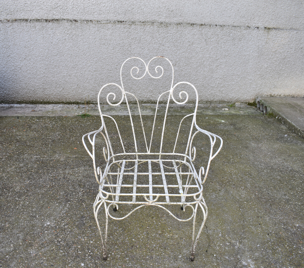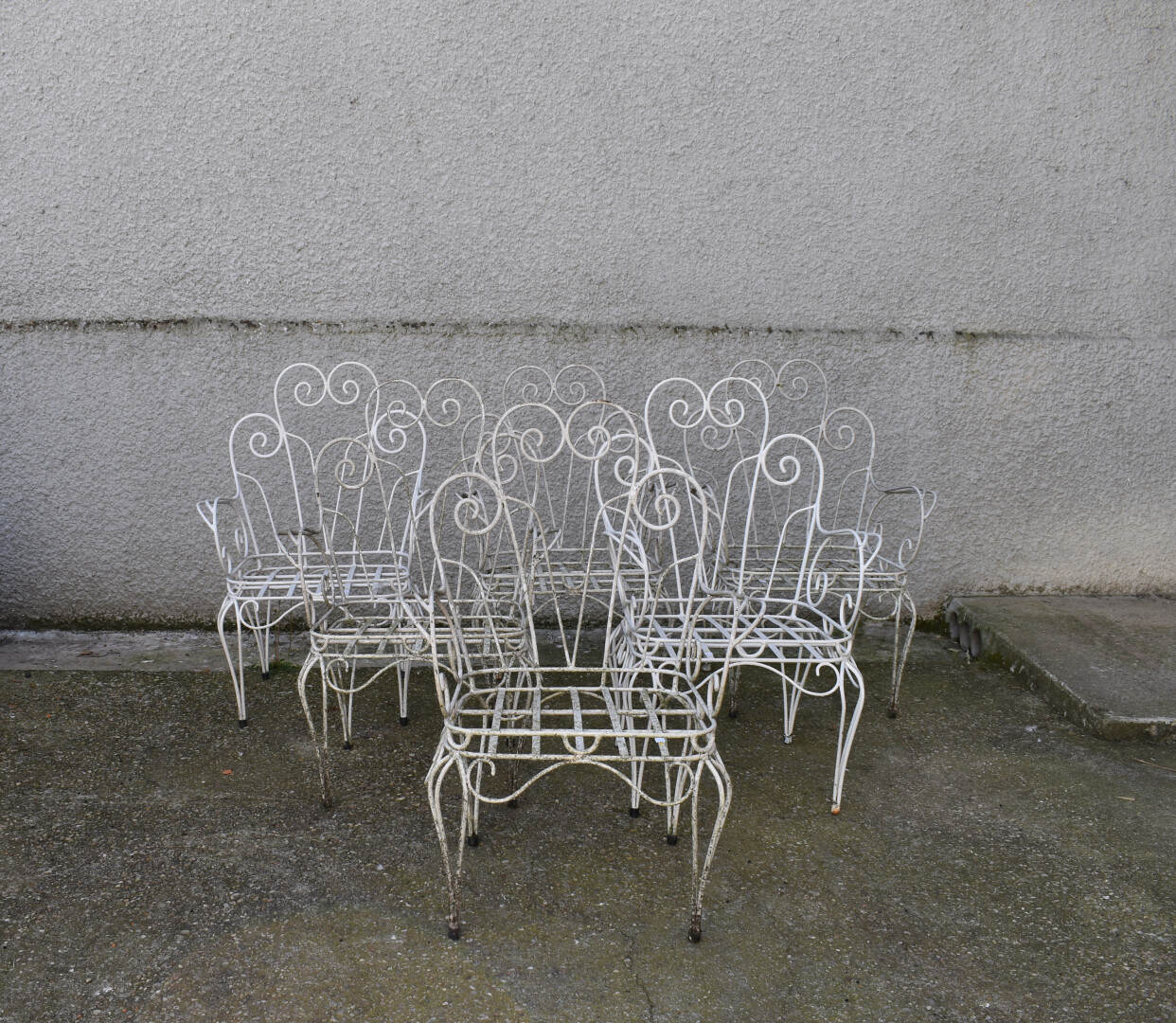 Ensemble de mobilier de jardin en fer forgé blanc soit 6 fauteuils, 2 chaises, et une grille (piqures et usures). Première moitié du XXe siècle. Dim grille : 224 x 117 cm Dim. d’un fauteuil : Haut. : 92 cm – Larg. : 69 cm – Prof. : 52 cm.