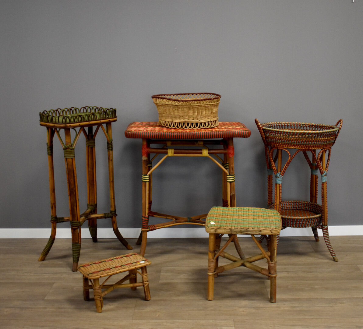 Ensemble de mobilier de jardin ou de terrasse en osier tressé (insolé, mouillures) soit 3 chaises, 2 paniers, 1 repose-pied, 4 selettes, 1 tabouret, le tout dépareillé.