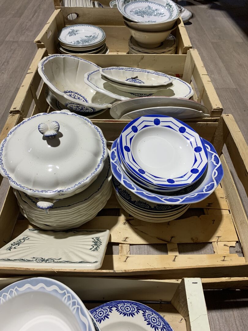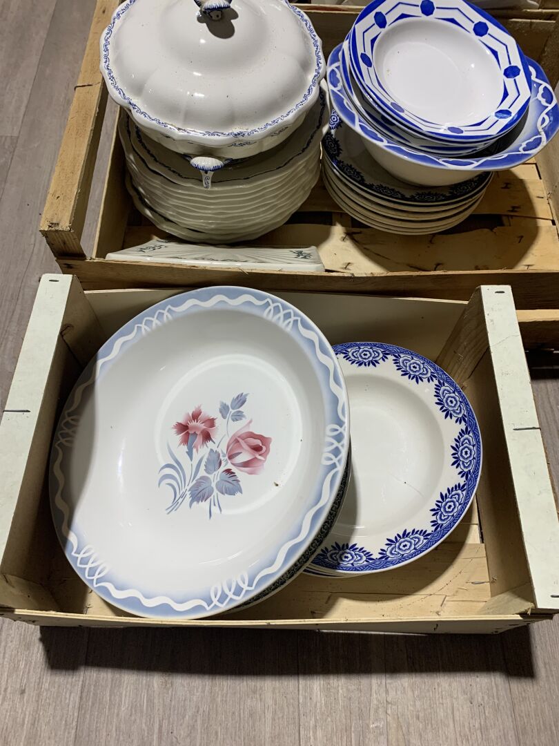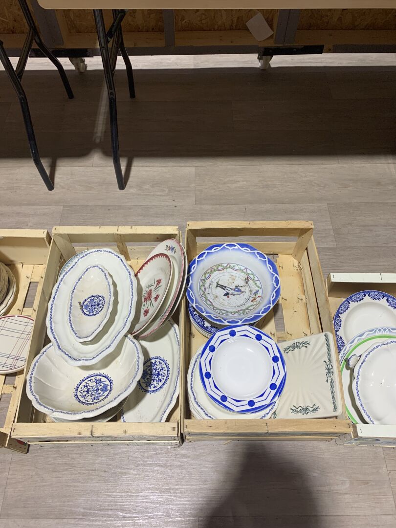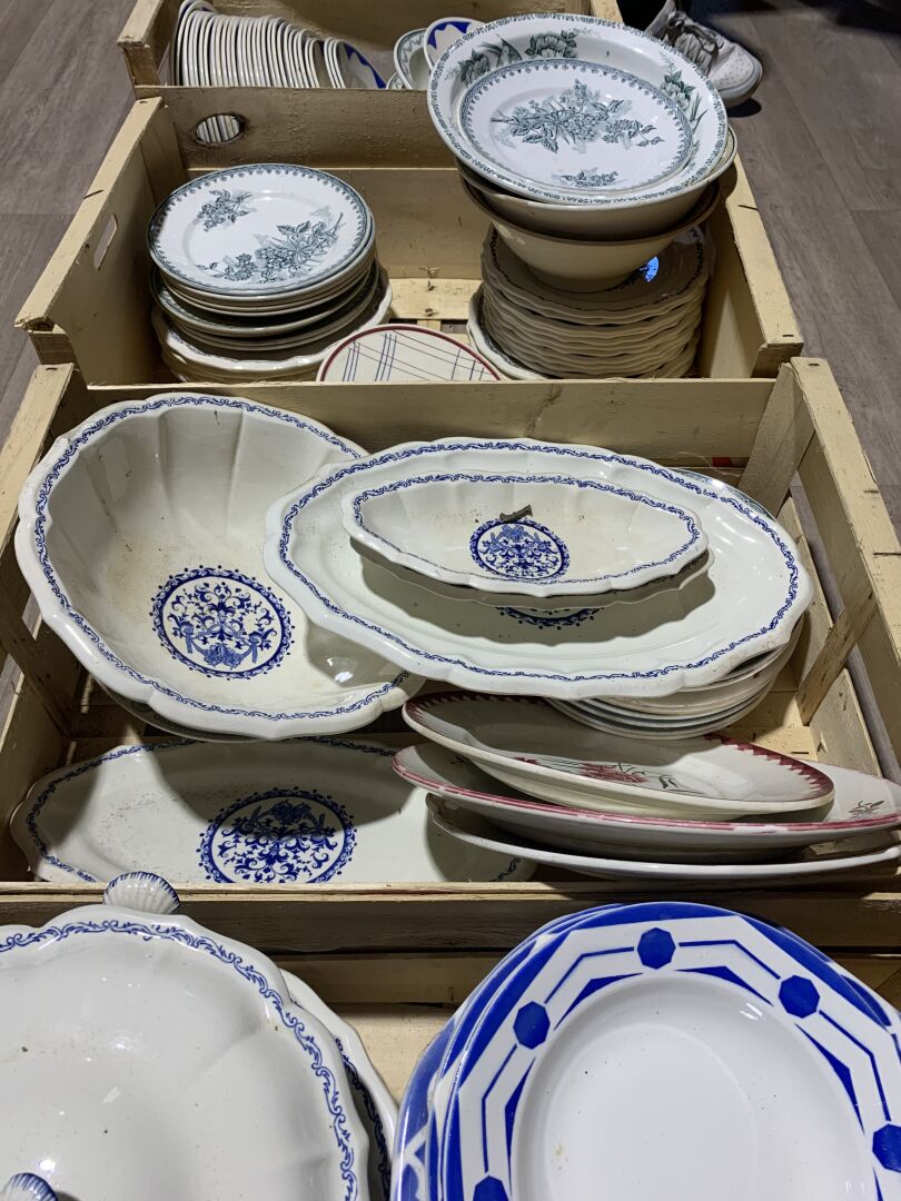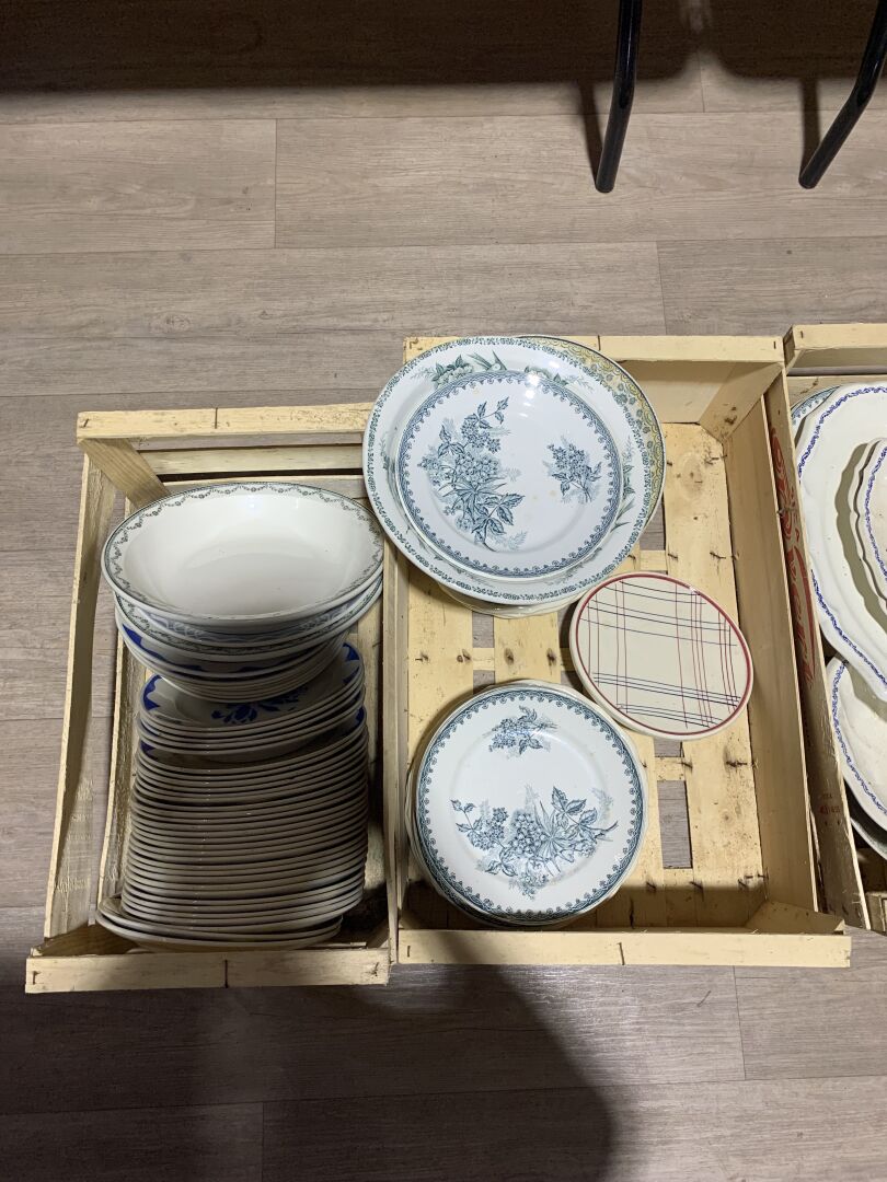 Ensemble de parties de services de table en faïence dont ST AMAND modèle « Margot », « Mésanges », GIEN, DIGOIN SARREGUEMINES « Marinette », QUIMPER… (usures, éclats, fèles) 5 caisses.