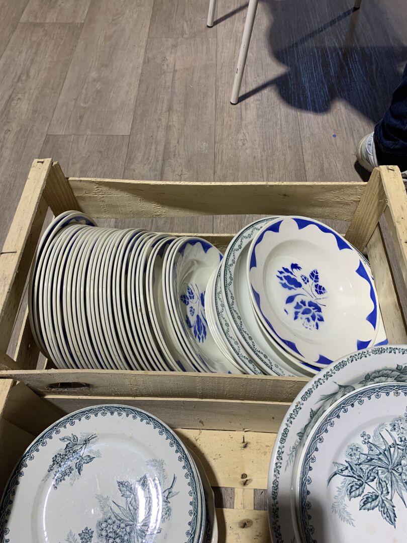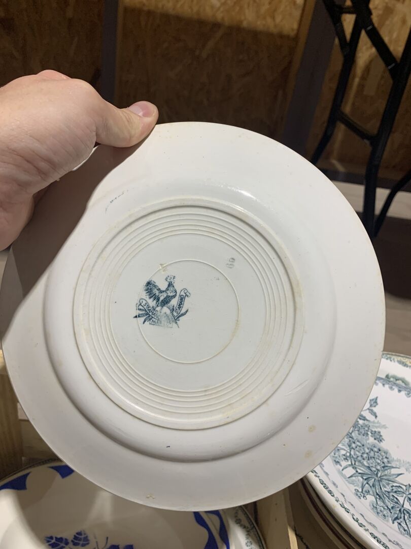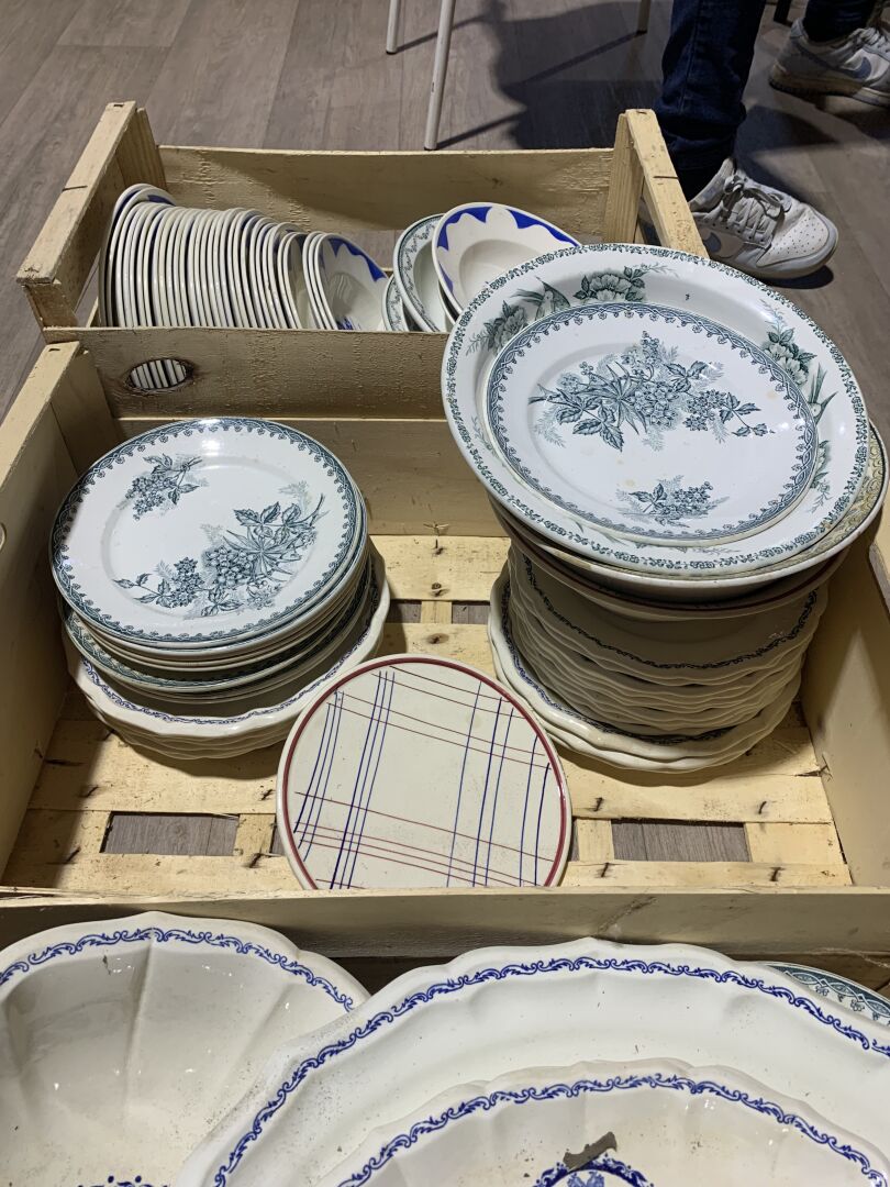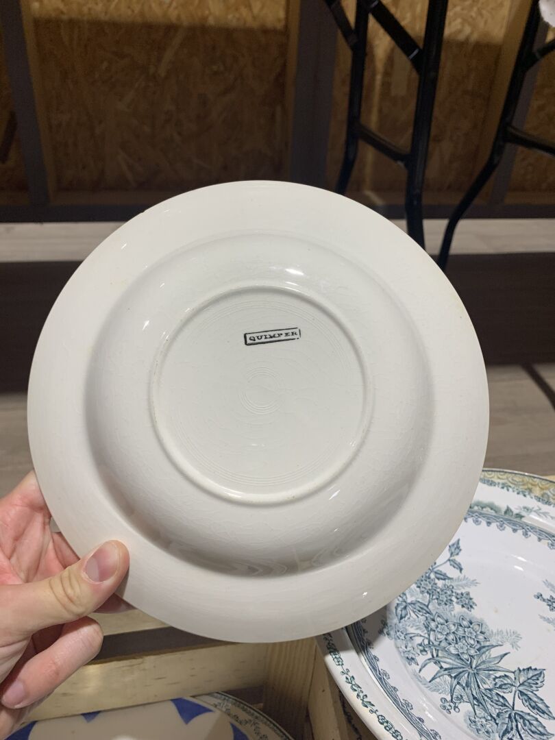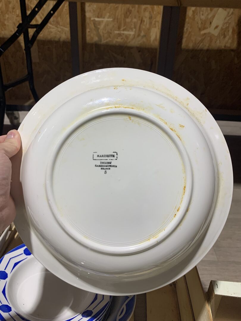 Ensemble de parties de services de table en faïence dont ST AMAND modèle « Margot », « Mésanges », GIEN, DIGOIN SARREGUEMINES « Marinette », QUIMPER… (usures, éclats, fèles) 5 caisses.