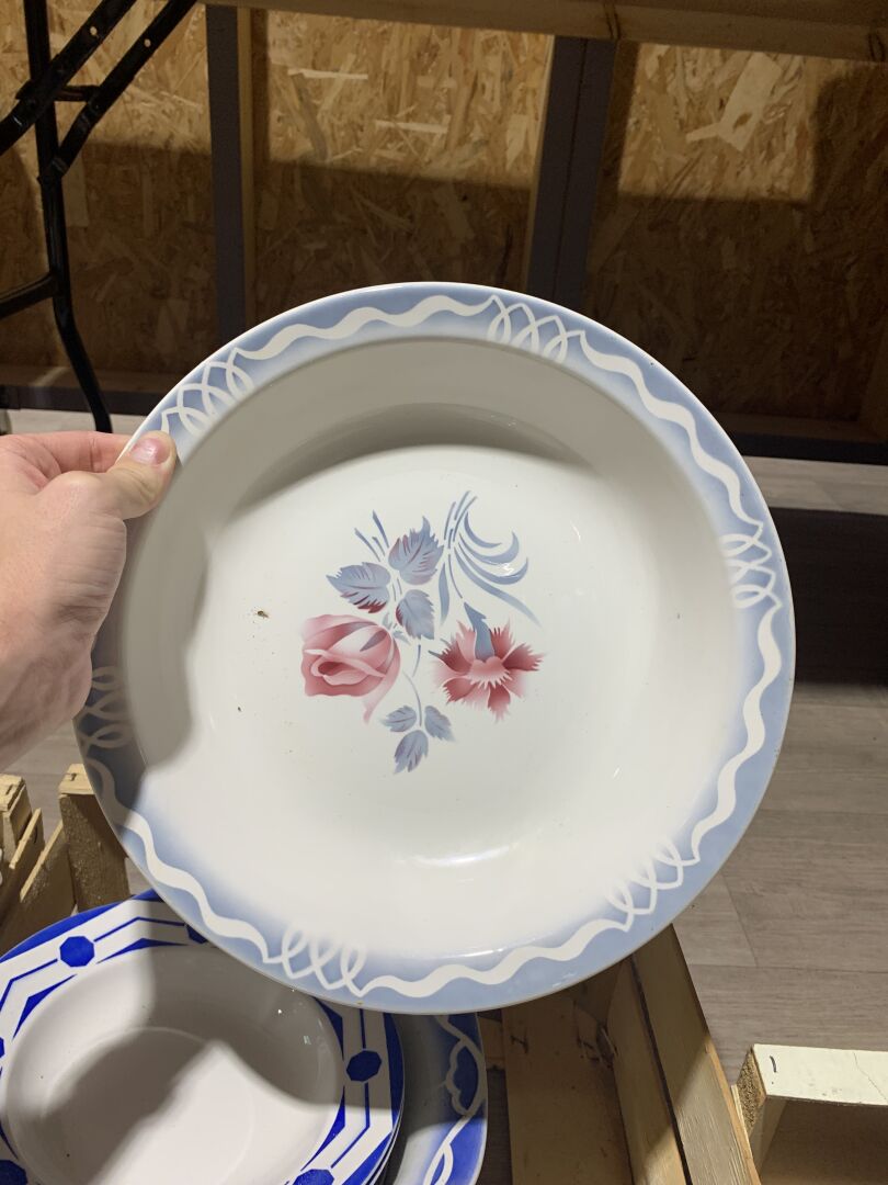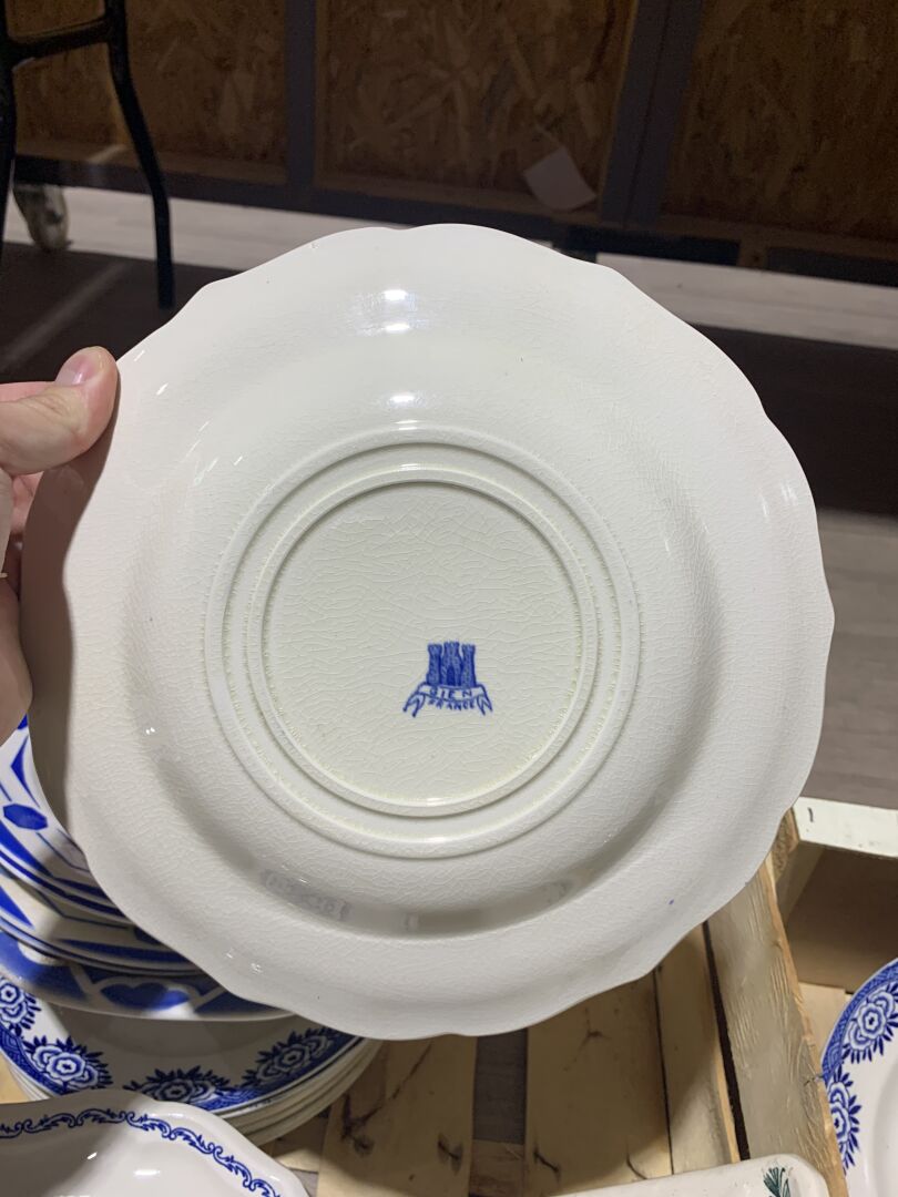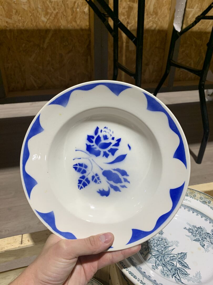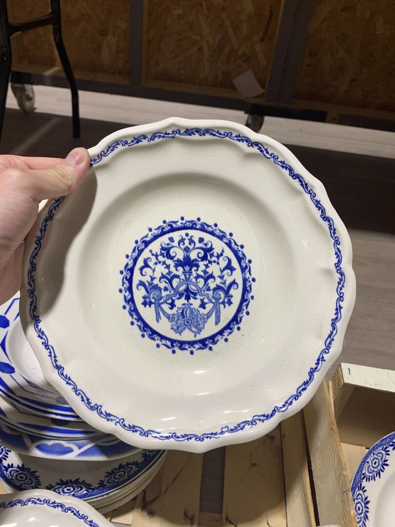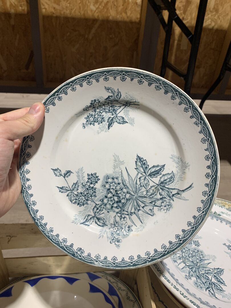 Ensemble de parties de services de table en faïence dont ST AMAND modèle « Margot », « Mésanges », GIEN, DIGOIN SARREGUEMINES « Marinette », QUIMPER… (usures, éclats, fèles) 5 caisses.