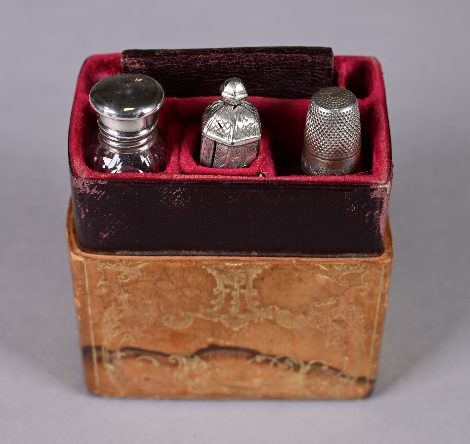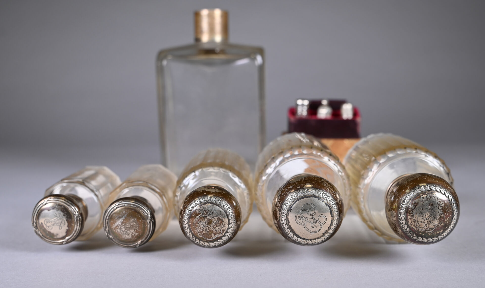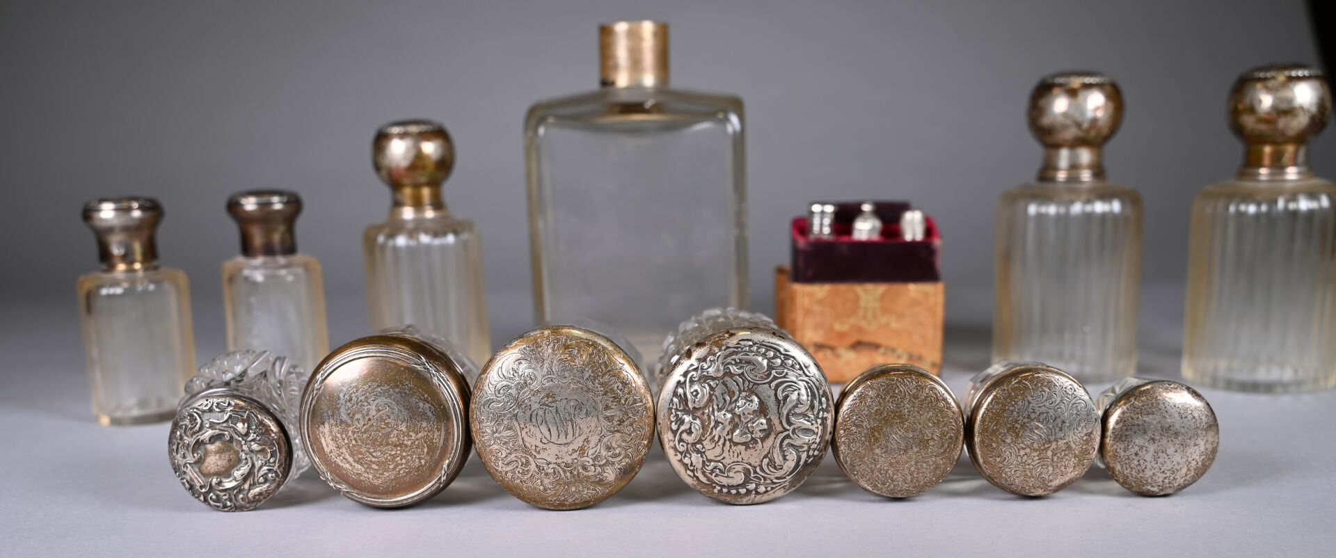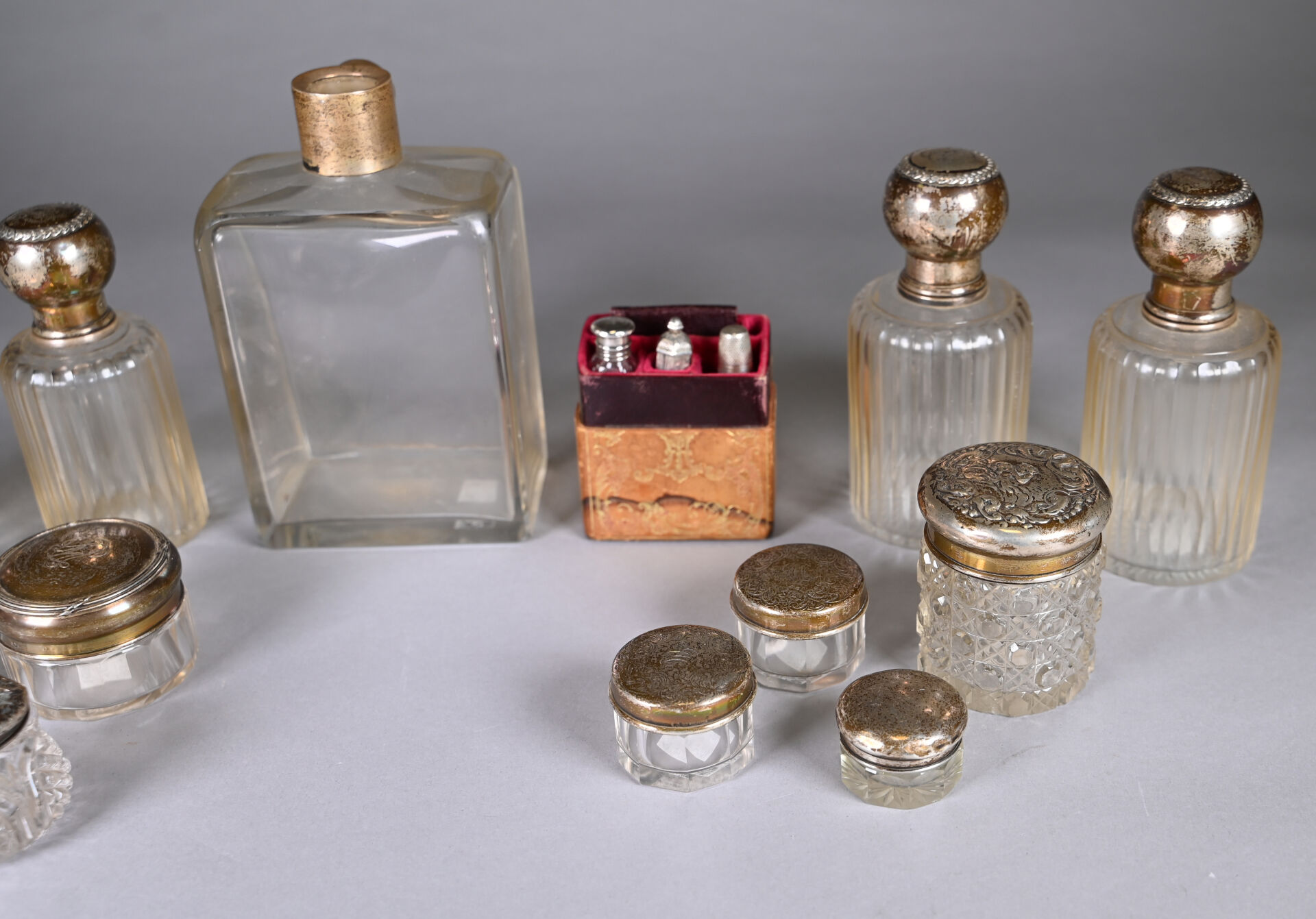 Ensemble de parties de services de toilette en cristal, verre à col ou bouchons en argent 925/1000e et 800/1000e et partie de nécessaire de couture. Poids net de bouchons et éléments divers : 296 g. Poids brut (principalement des cols) : 2304 g. (usures et égrenures).