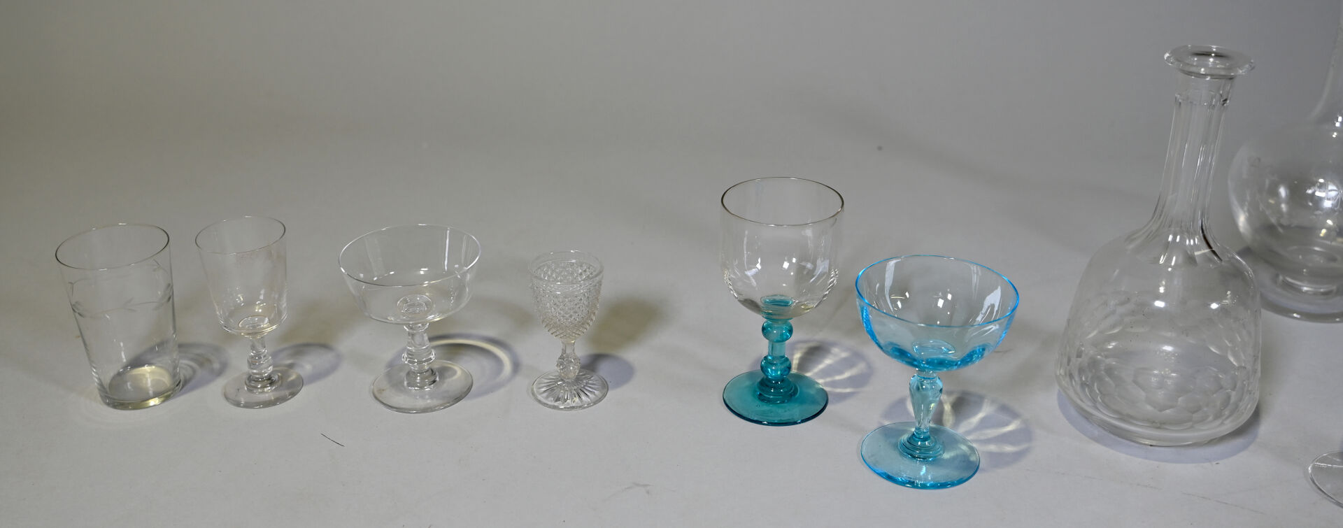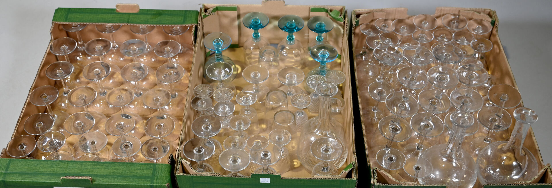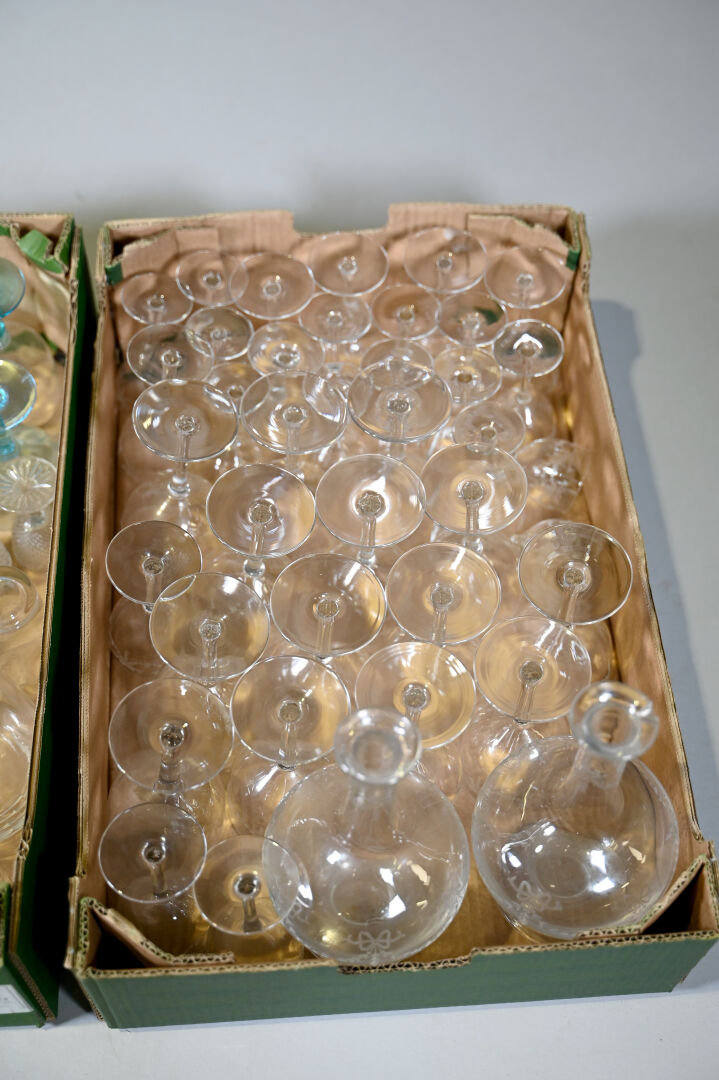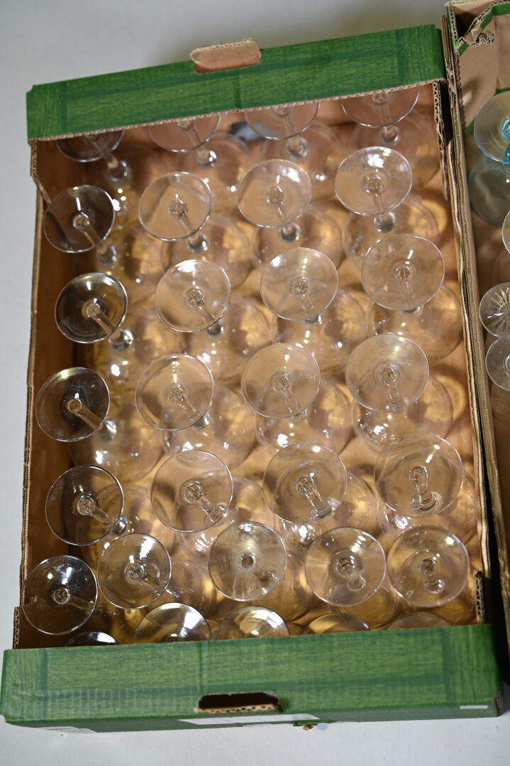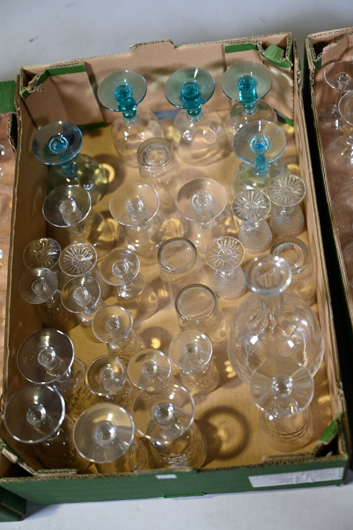 Ensemble de parties de services de verre et verre et cristal dont 3 carafes, coupes à champagne, verres à pied bleu (égrenures et usures). 3 cartons.