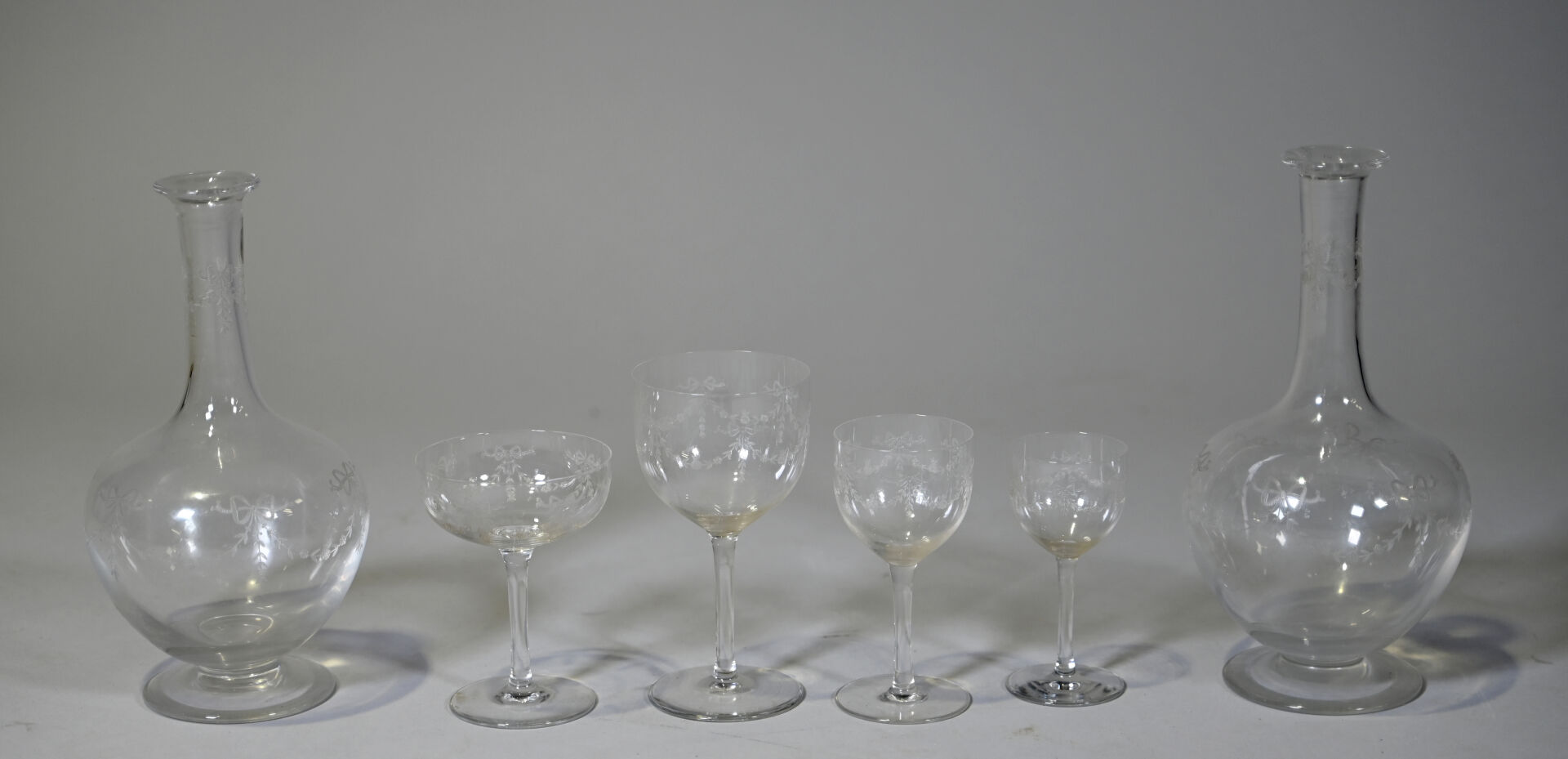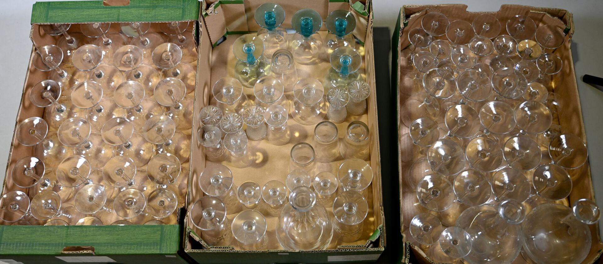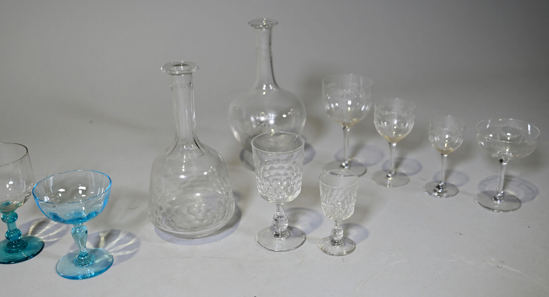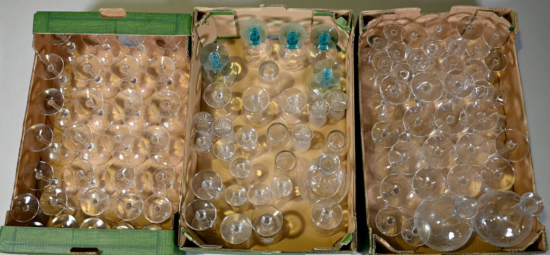 Ensemble de parties de services de verre et verre et cristal dont 3 carafes, coupes à champagne, verres à pied bleu (égrenures et usures). 3 cartons.