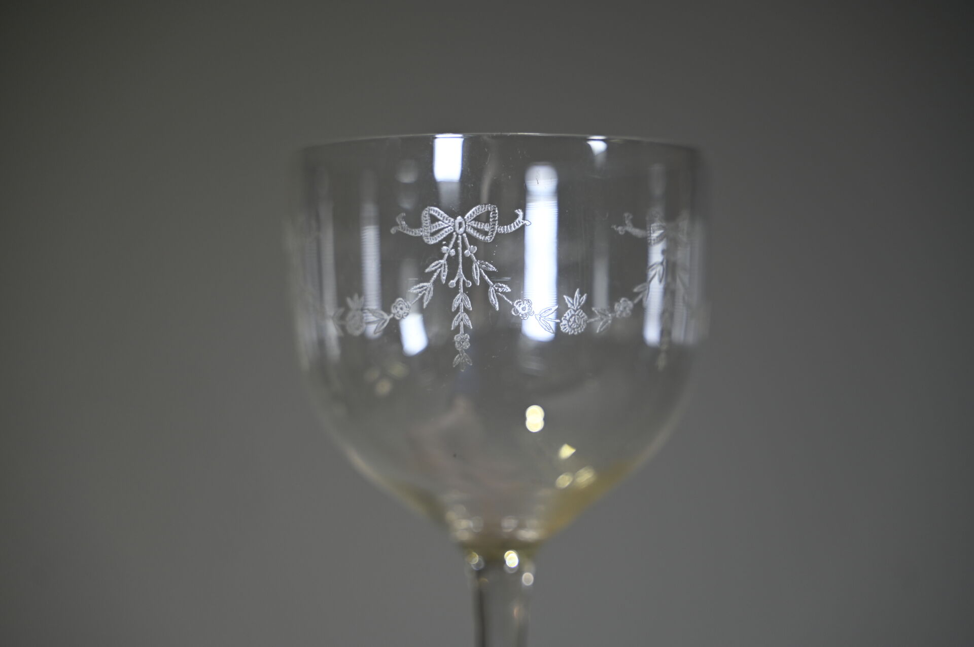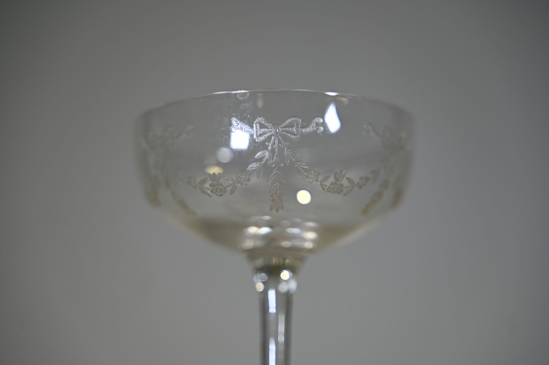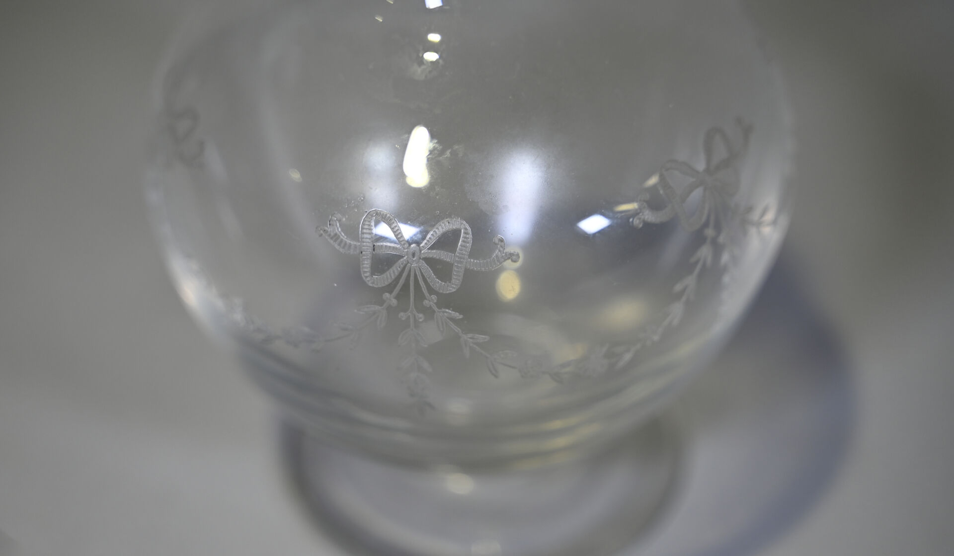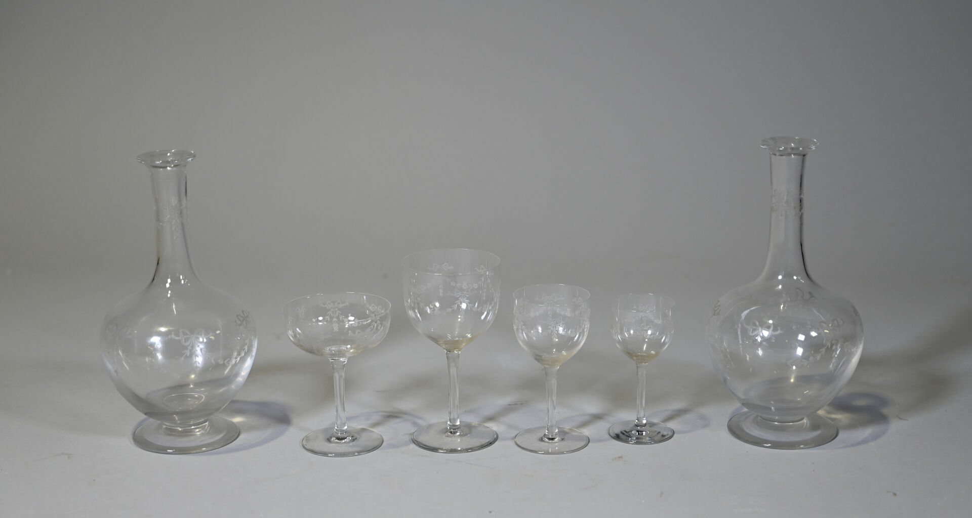 Ensemble de parties de services de verre et verre et cristal dont 3 carafes, coupes à champagne, verres à pied bleu (égrenures et usures). 3 cartons.