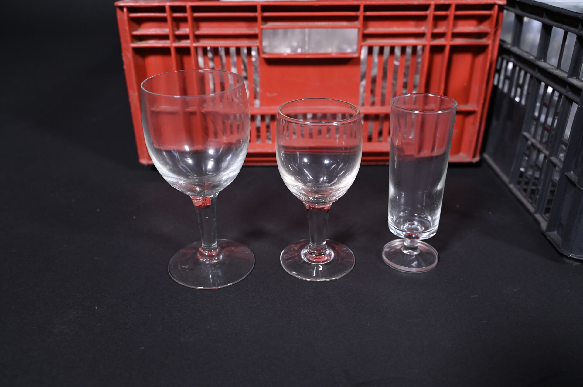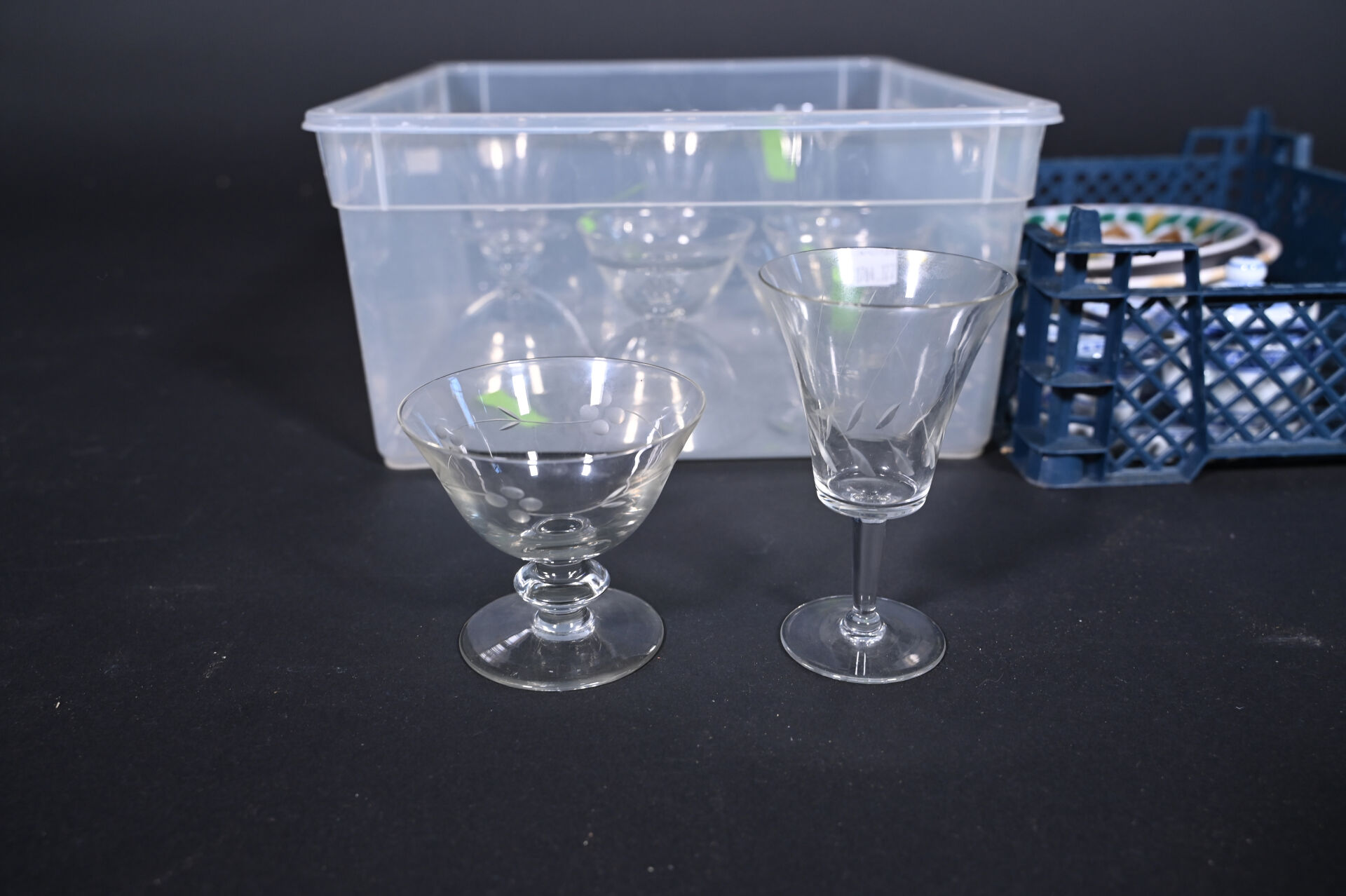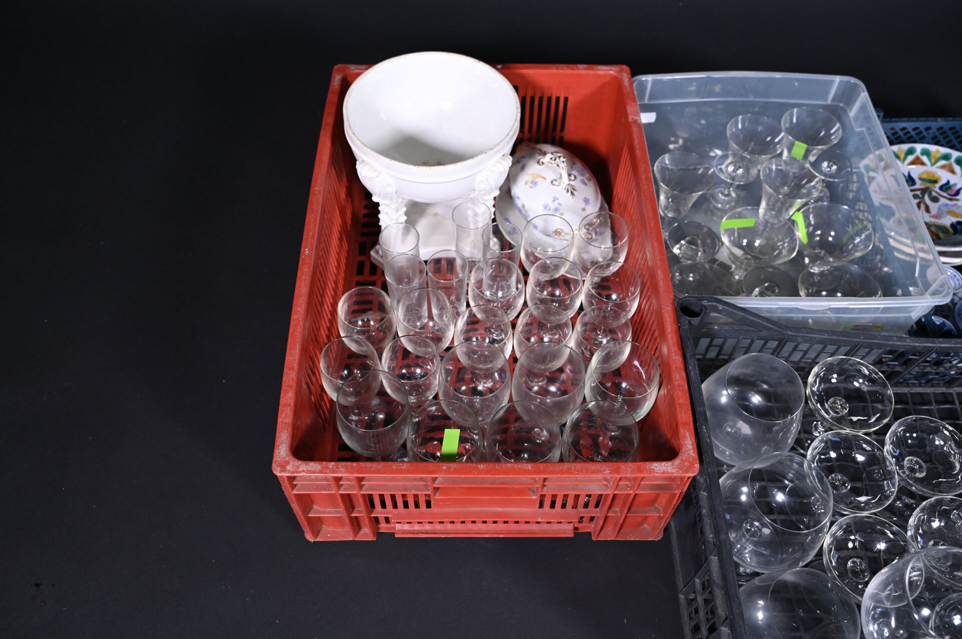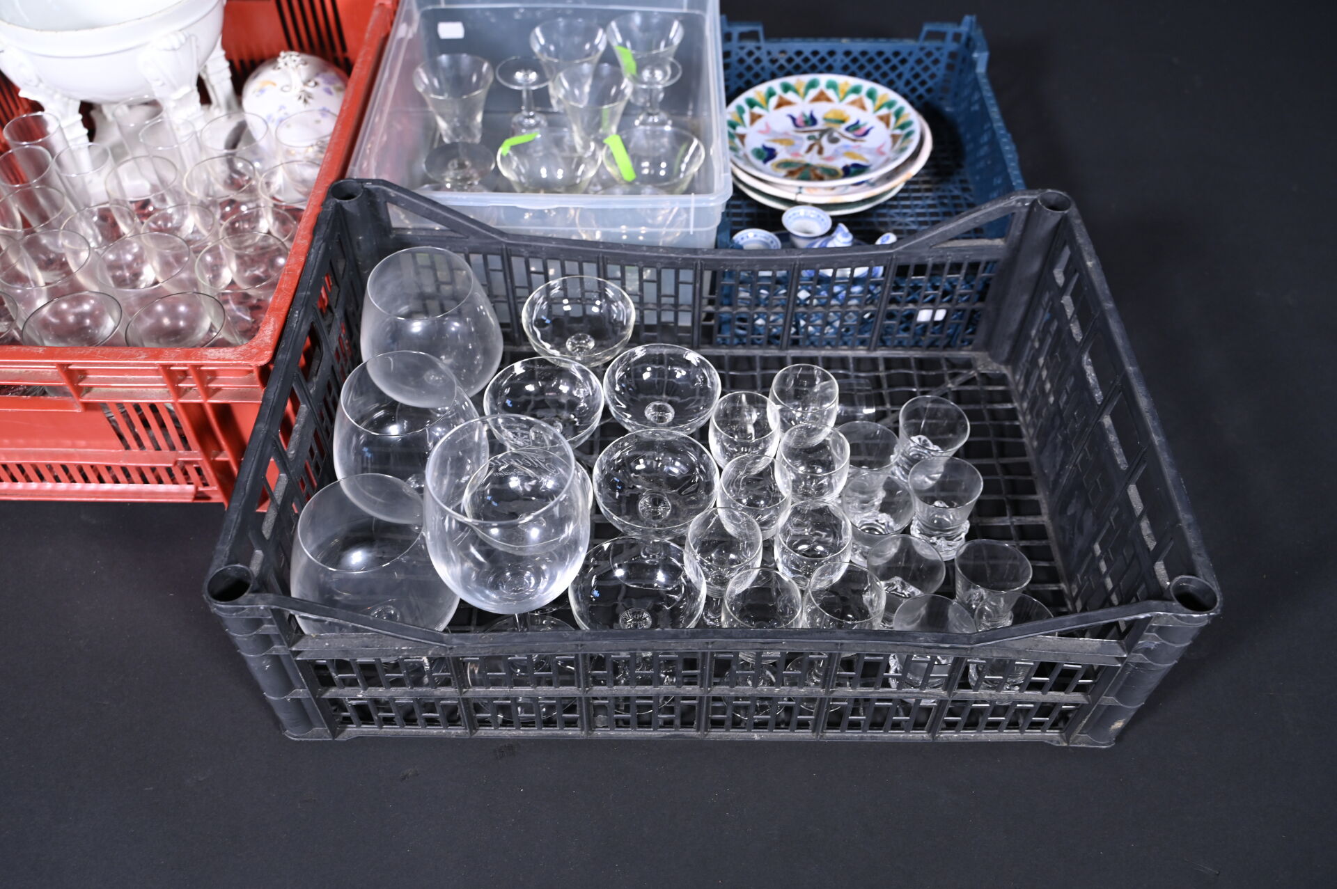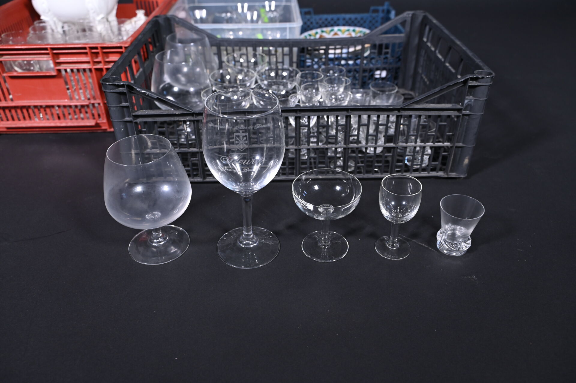 Ensemble de parties de services de verres à pied en verre et cristal dont 8 petits verres DAUM France, coupes à champagne, carafes, saucière en porcelaine, assiettes en céramique et divers.