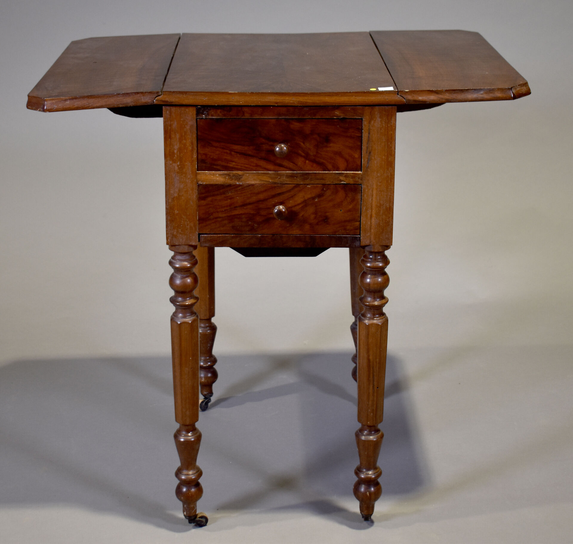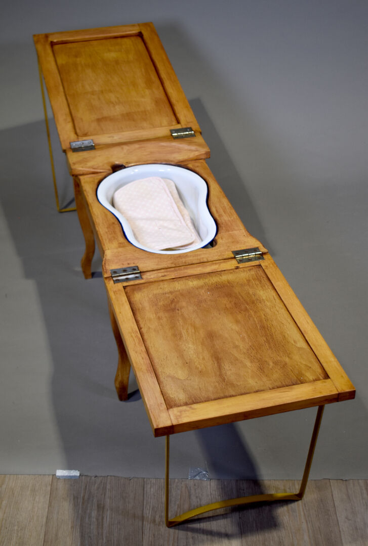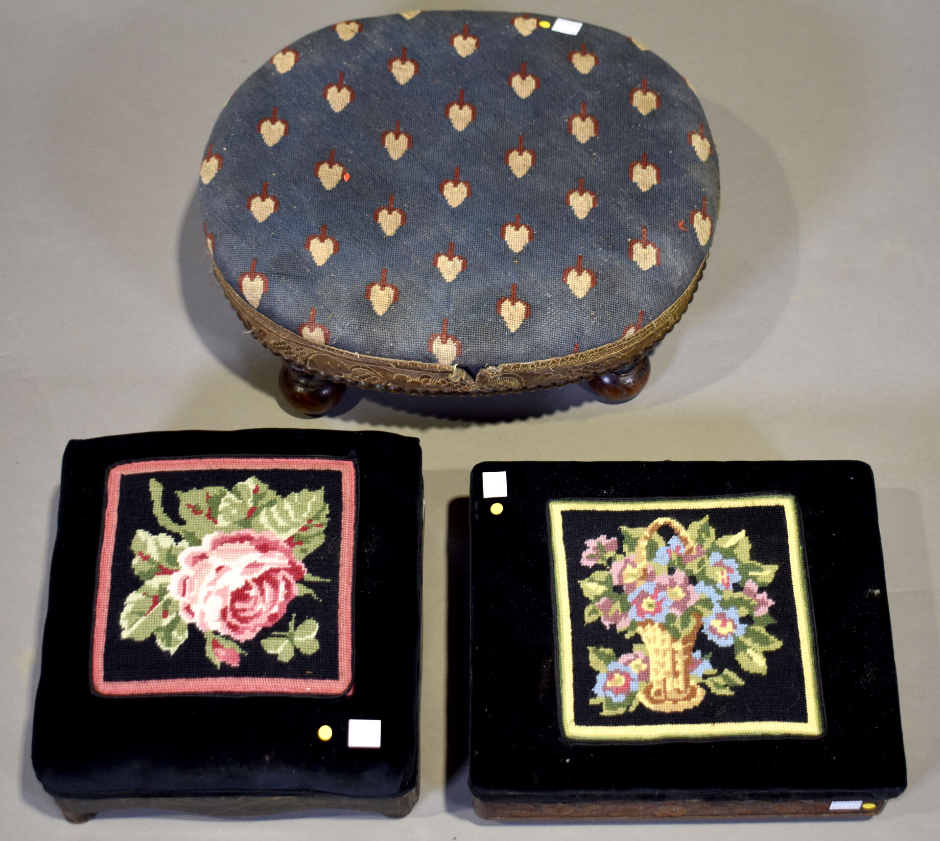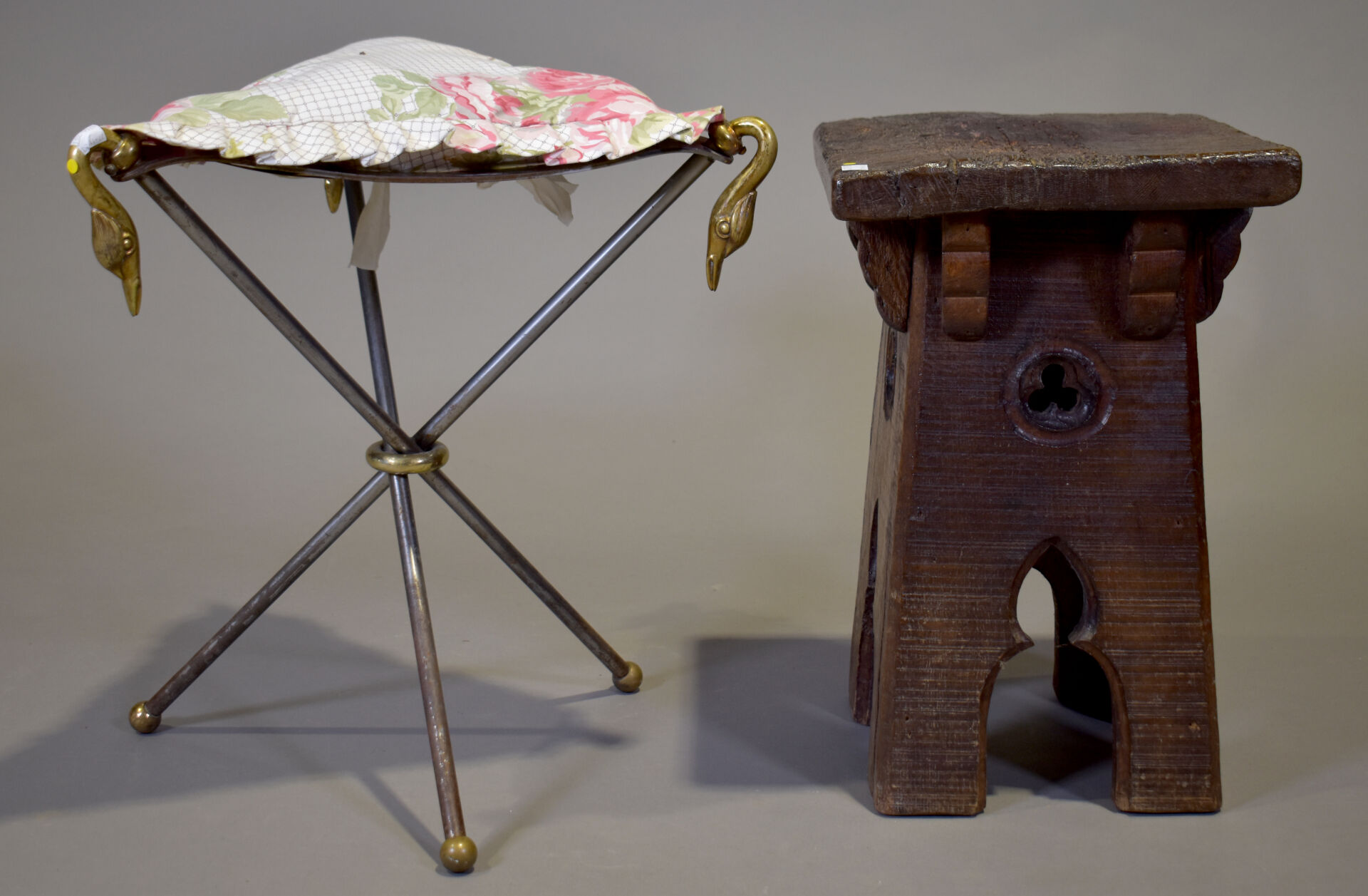 Ensemble de petits meubles soit un petit tabouret en métal à col de cygne, une travailleuse en noyer, un tabouret, deux repose-pied et un banc de toilette (le tout avec usures et manques). Haut. de la travailleuse : 69 cm.