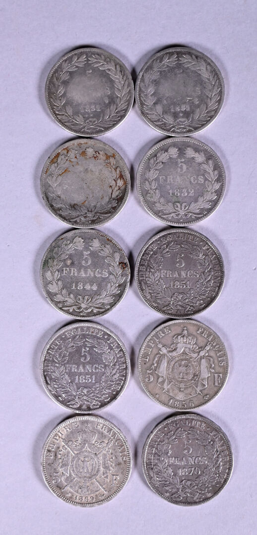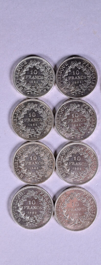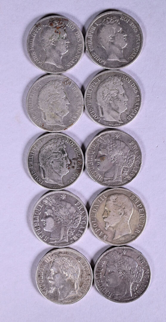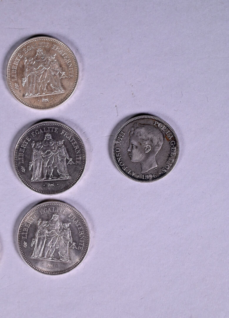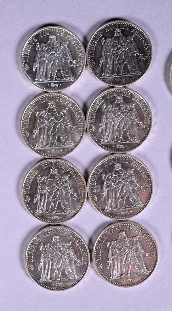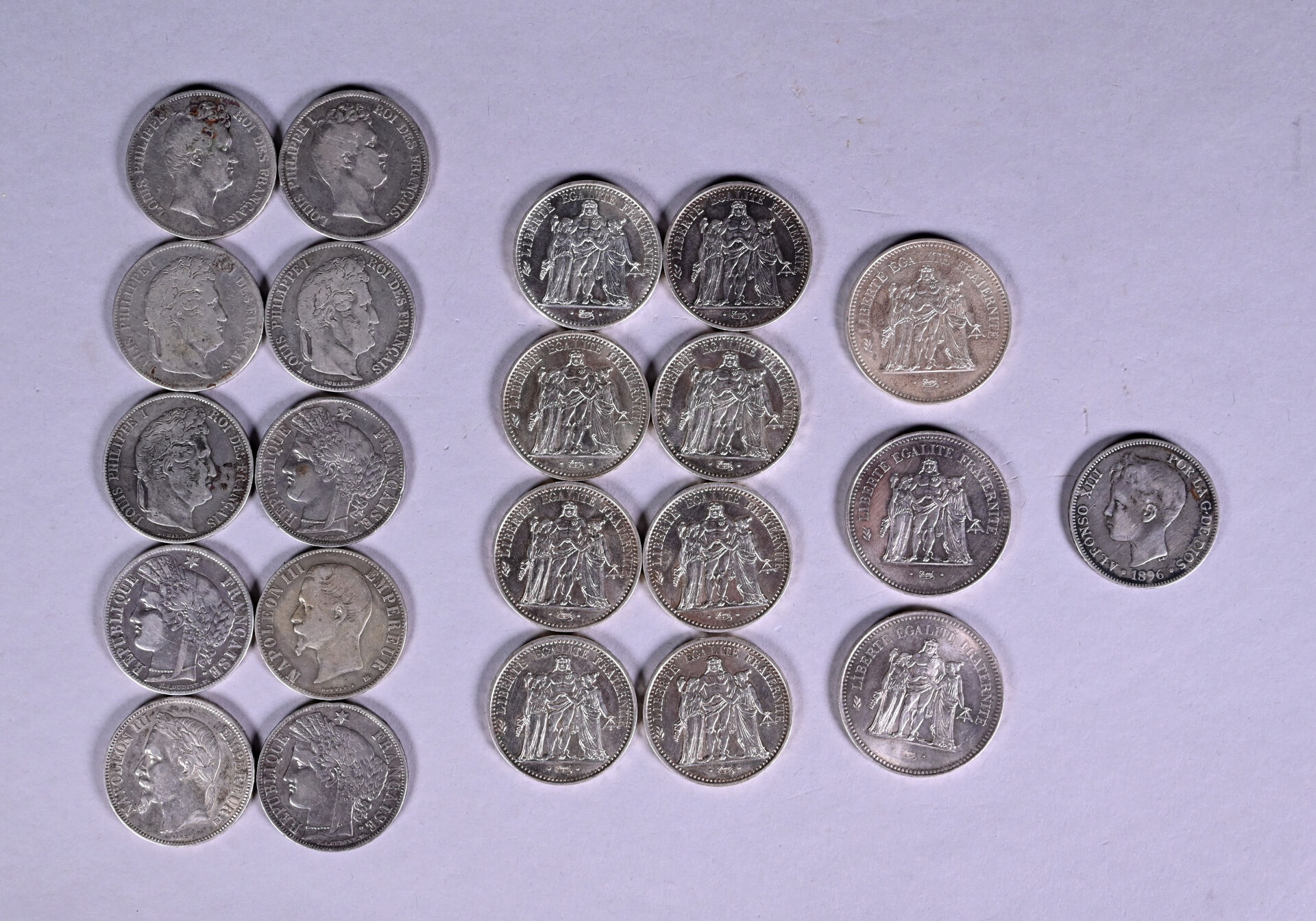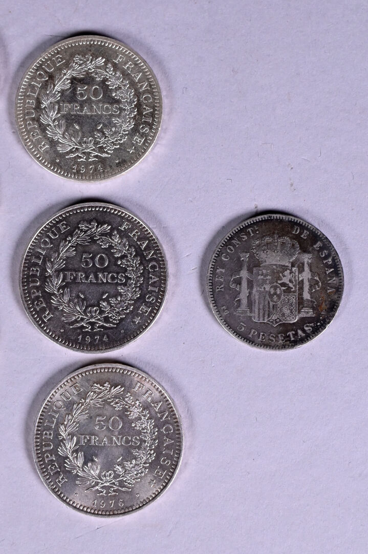 Ensemble de pièces en argent soit 3 de 50 Francs, 10 de 5 francs, 8 de 10 Francs et une de 5 Pesetas. Poids total : 562 g.