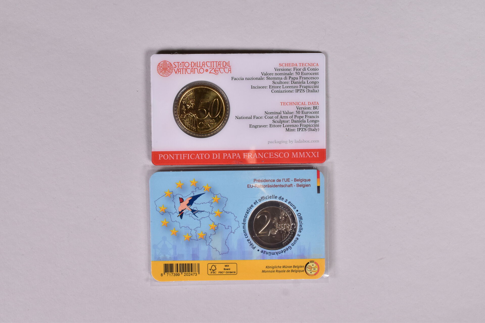 – Monnaie Royale de Belgique : monnaie de 2€ commémorant la Présidence du Conseil de l’Union Européenne par la Belgique. Cartelette scellée.