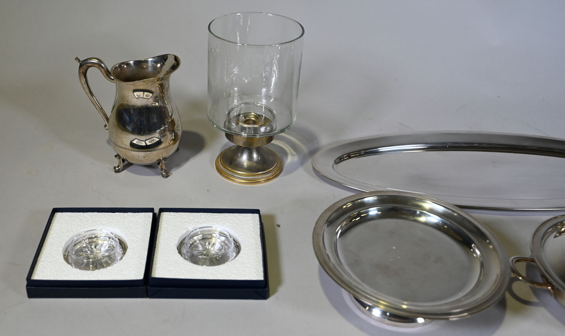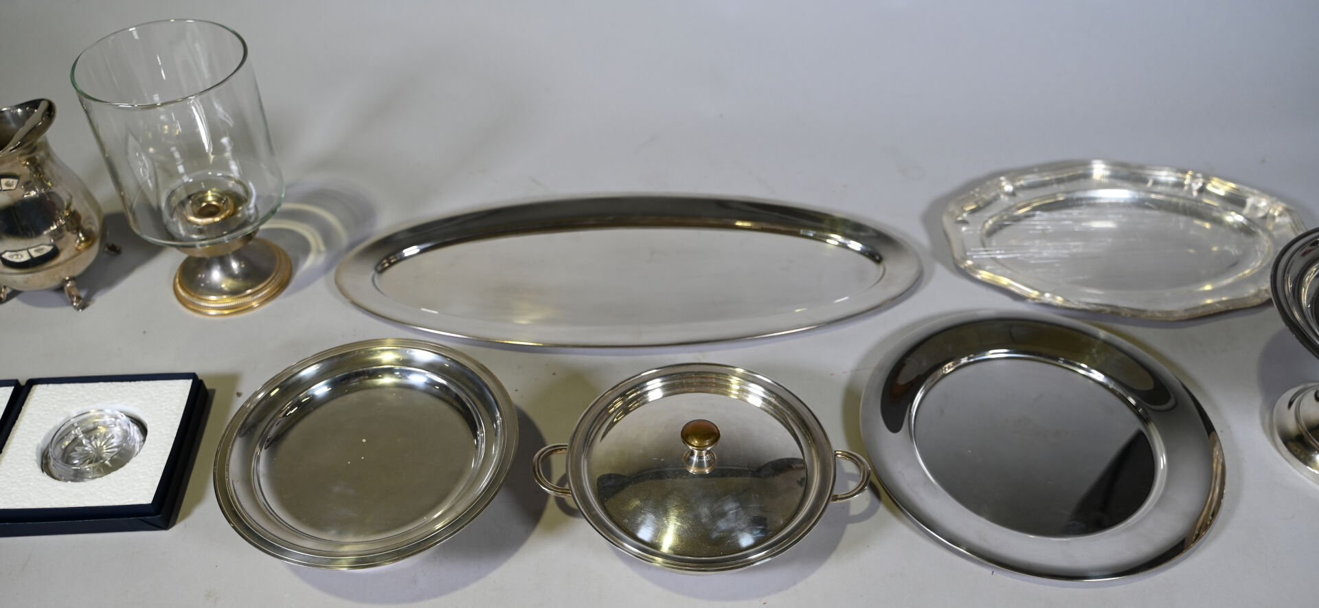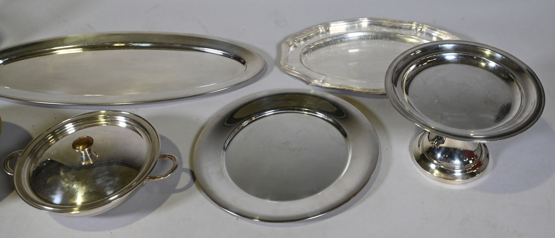 Ensemble de plats de service, pichet et divers en métal argenté.