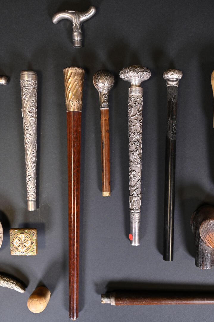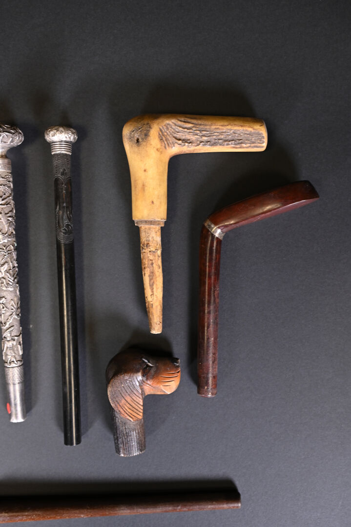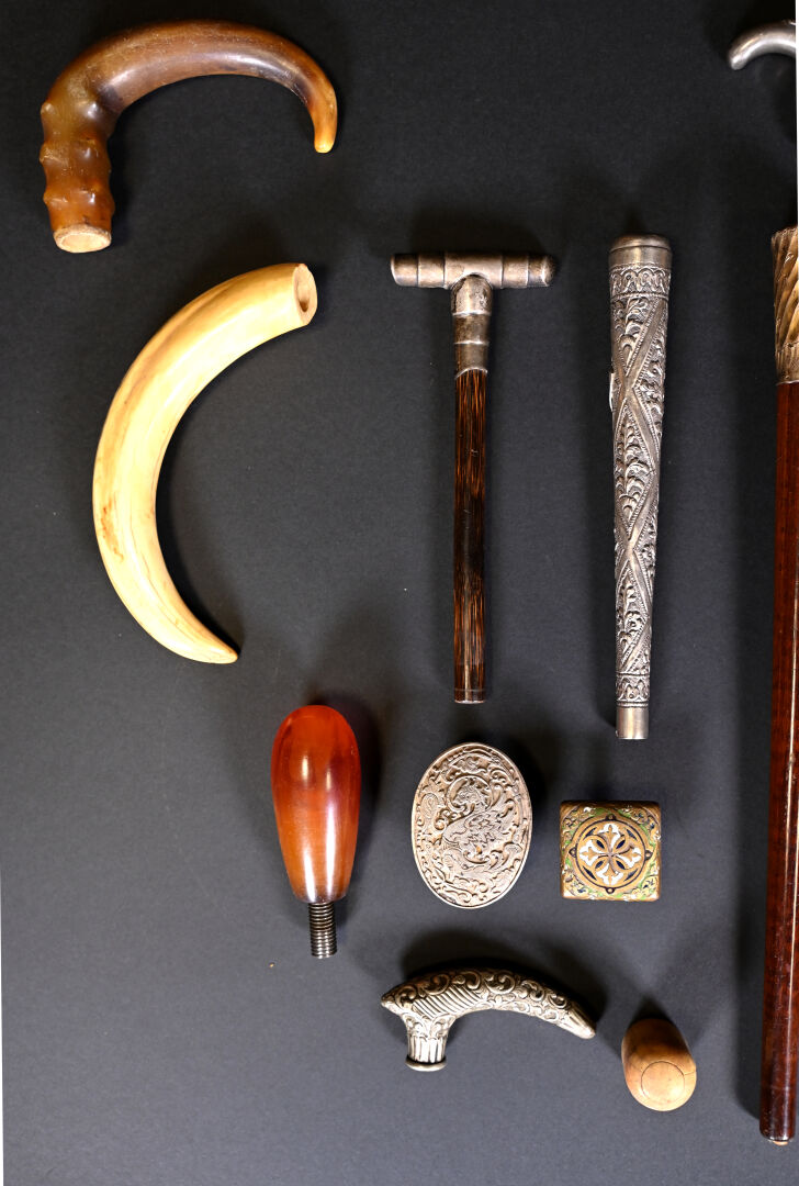 Ensemble de pommeaux et manches de cannes dont argent et argent fourré dent de phacochère, résine, bois, métal, corne argent fourré. Poids argent : 199 g. Poids brut argent fourré : 225 g.