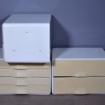 Ensemble de quatre casiers à assembler selon son goût en fibre de verre crème (insolés, petits éclats, craquelures). Deux ouvrant à 2 tiroirs et deux à quatre. Travail des années 1970. Dim. d’un module : Haut. : 36 cm – Larg. : 58 cm – Prof. : 44 cm.