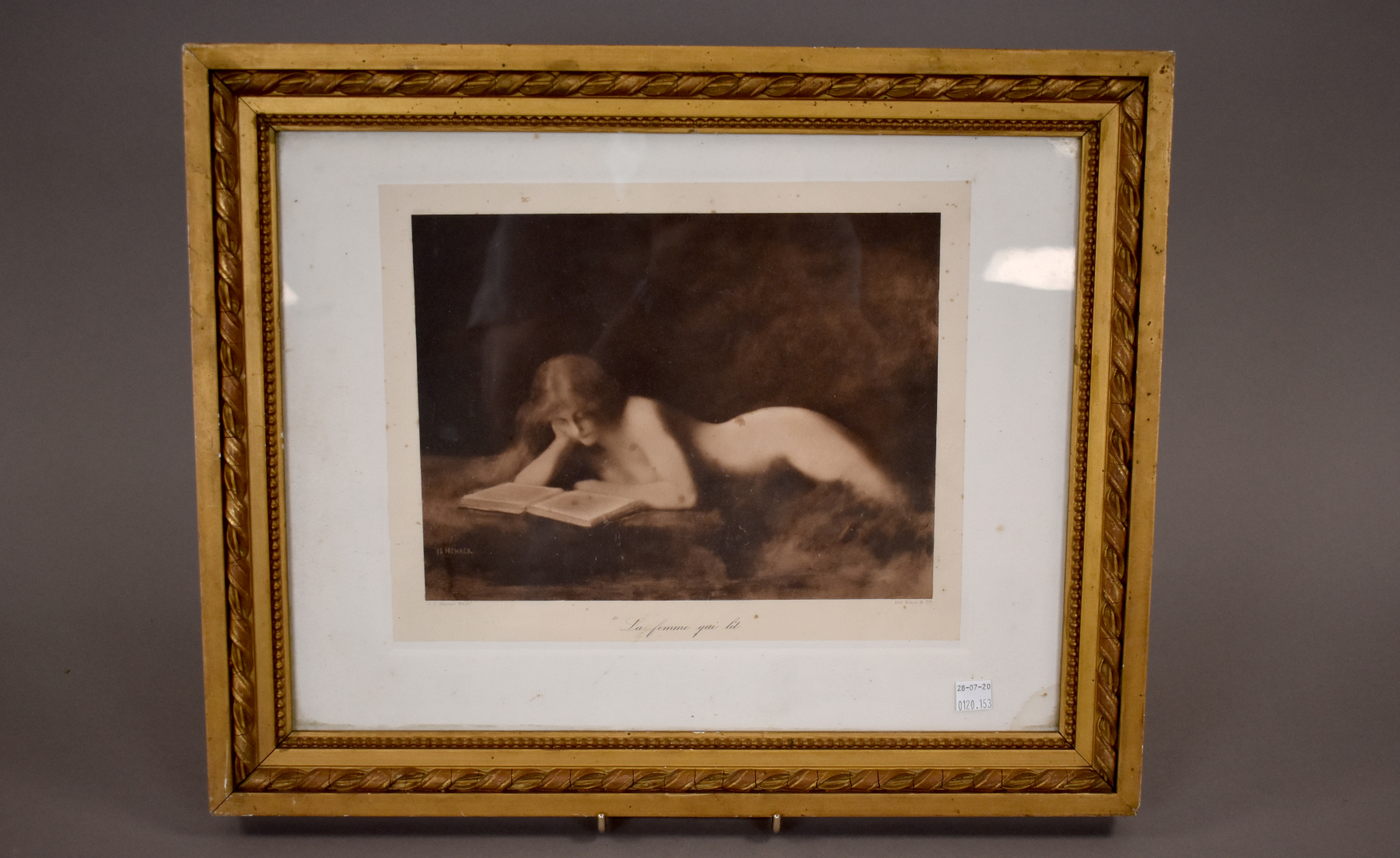 Ensemble de quatre pièces encadrées soit un panneau moulé d’étain (Pierrot), une aquarelle représentant une nature morte, deux gravures d’après Henner.