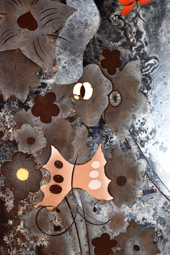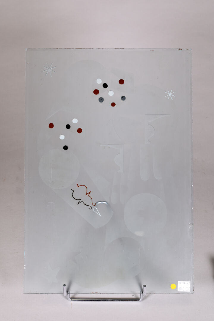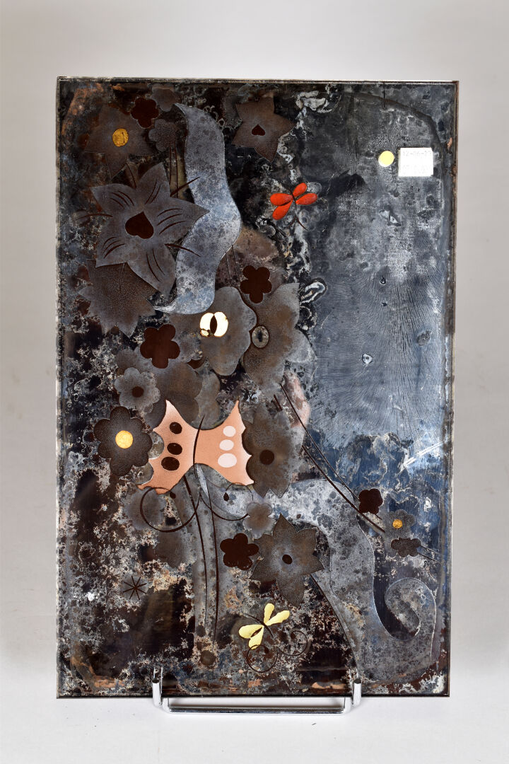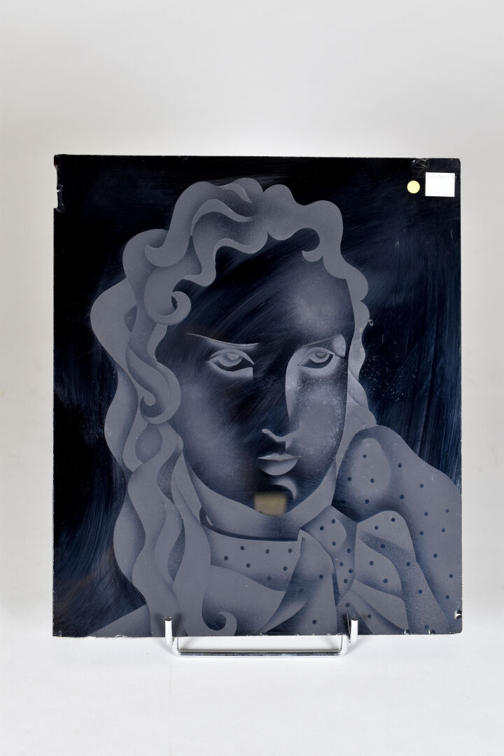 Ensemble de quatre plaques en verre gravé et verre églomisé (éclats, piqures). Probablement Murano, XXe siècle. Dim. moyenne : 39 x 26 cm.