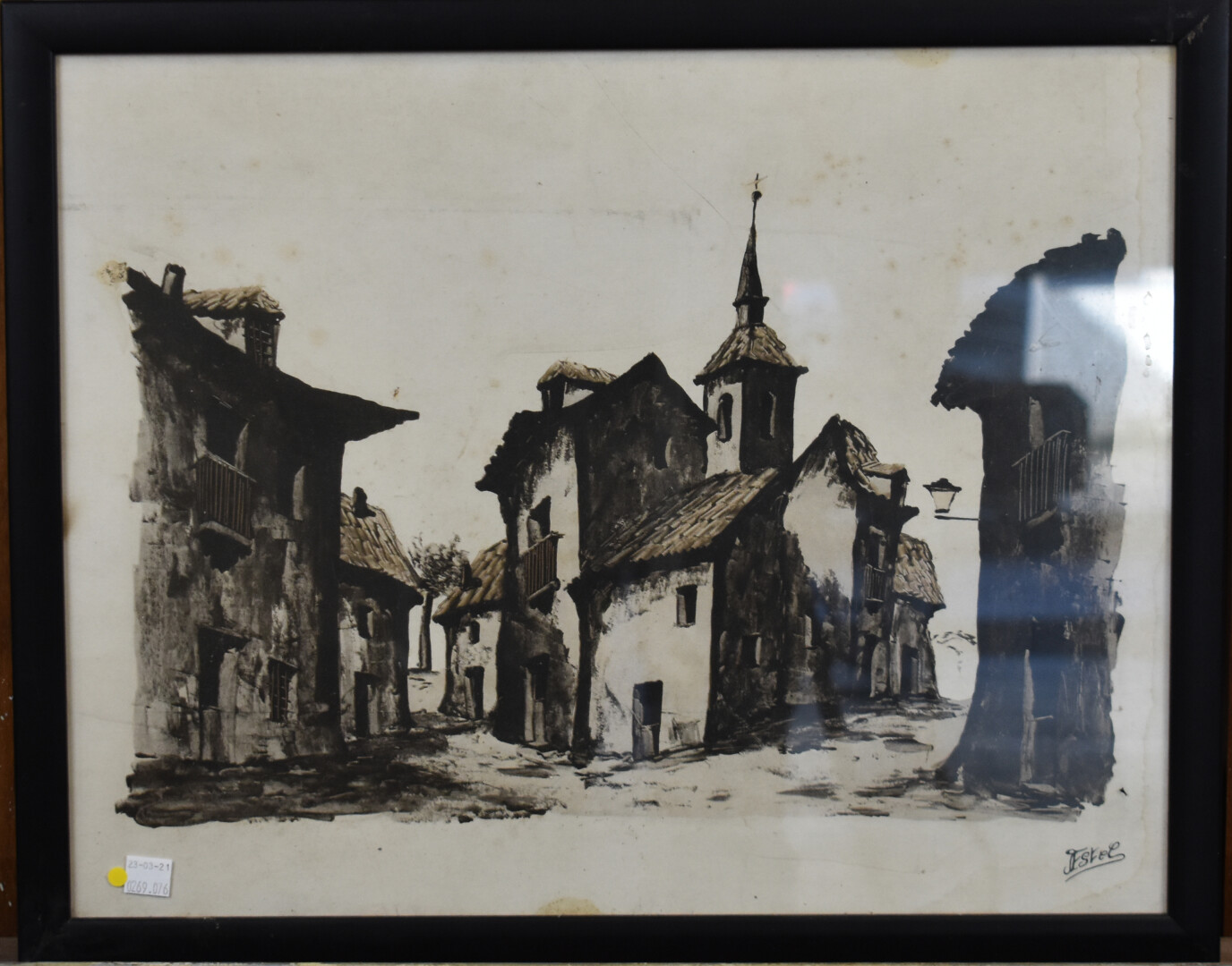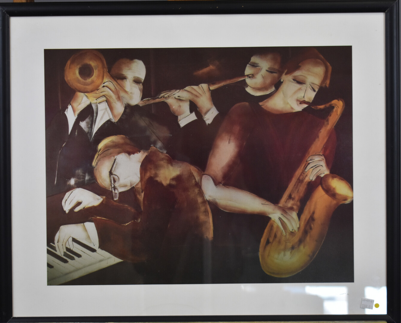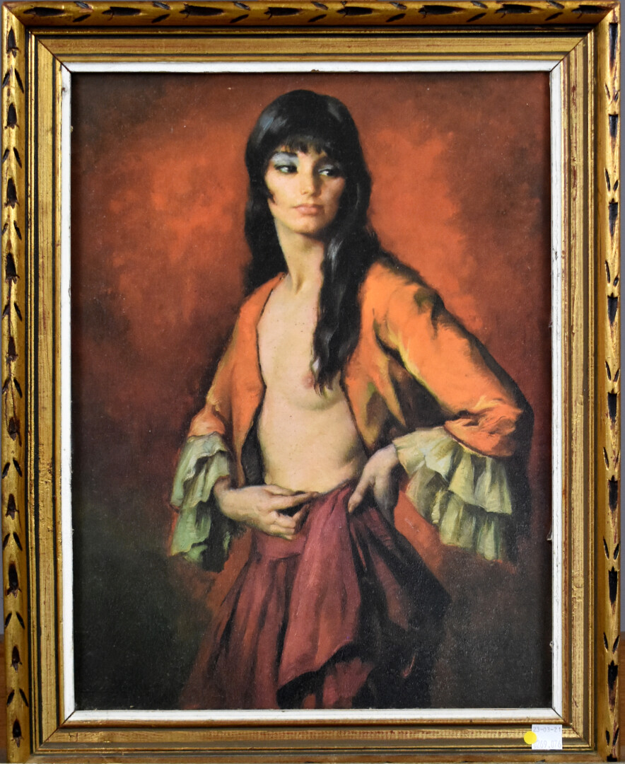Ensemble de quatre reproductions encadrées, une reproduction d’huile sur toile représentant une femme brune vêtue à l’espagnole, deux reproductions de lithographies d’après Estelle et une dernière représentant un orchestre.