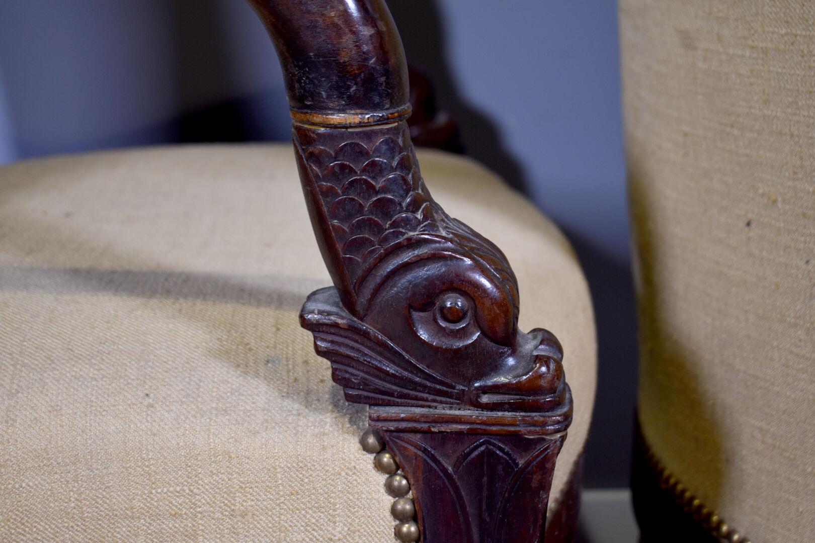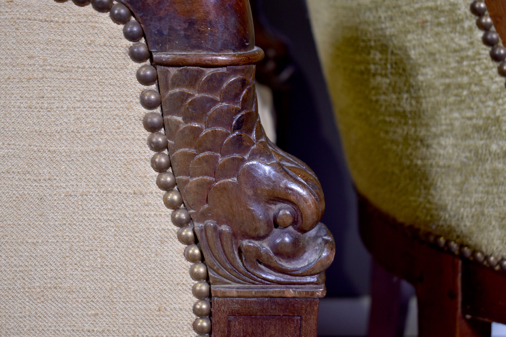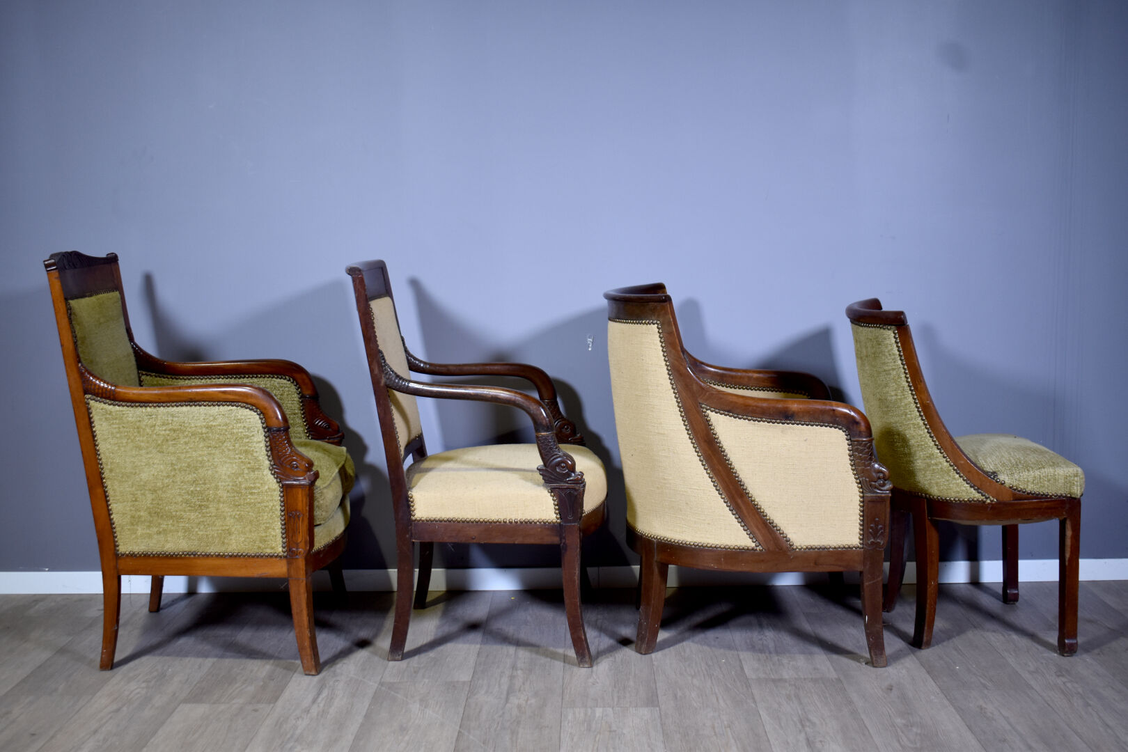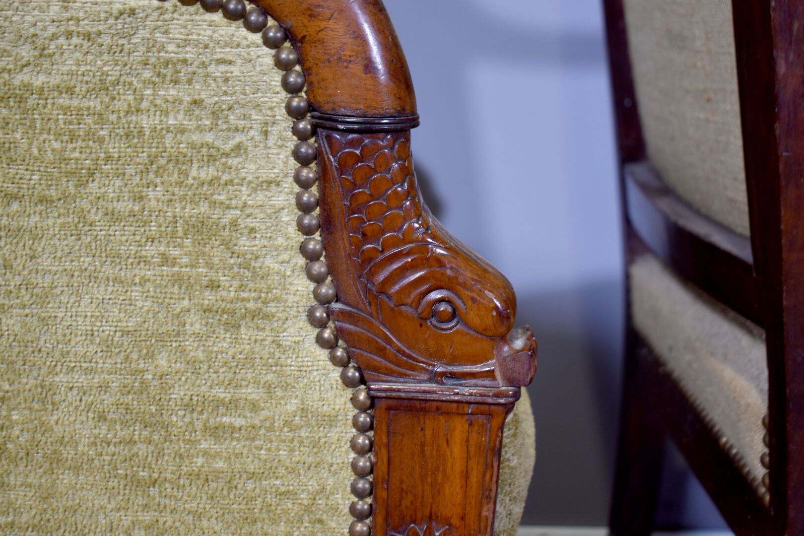 Ensemble de quatre sièges, les accotoirs sculptés de dauphins soit deux bergères, une chaise et un fauteuil. Epoque Restauration. Garnitures de velours beige et vert (usures). Haut. de la bergère : 93 cm.