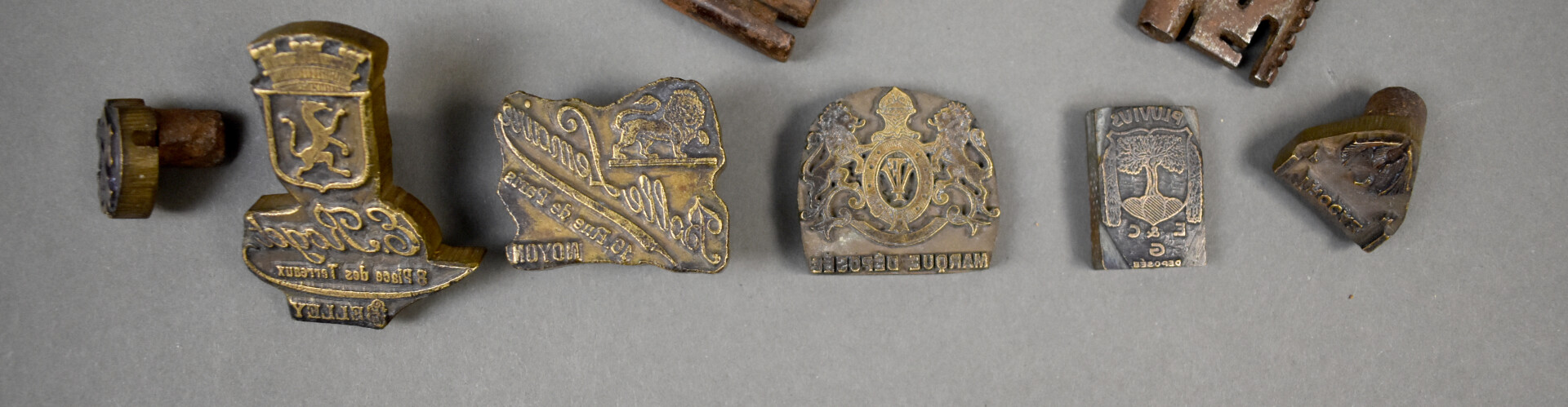 Ensemble de sept clés anciennes et 6 plaques pour ancienne imprimerie.