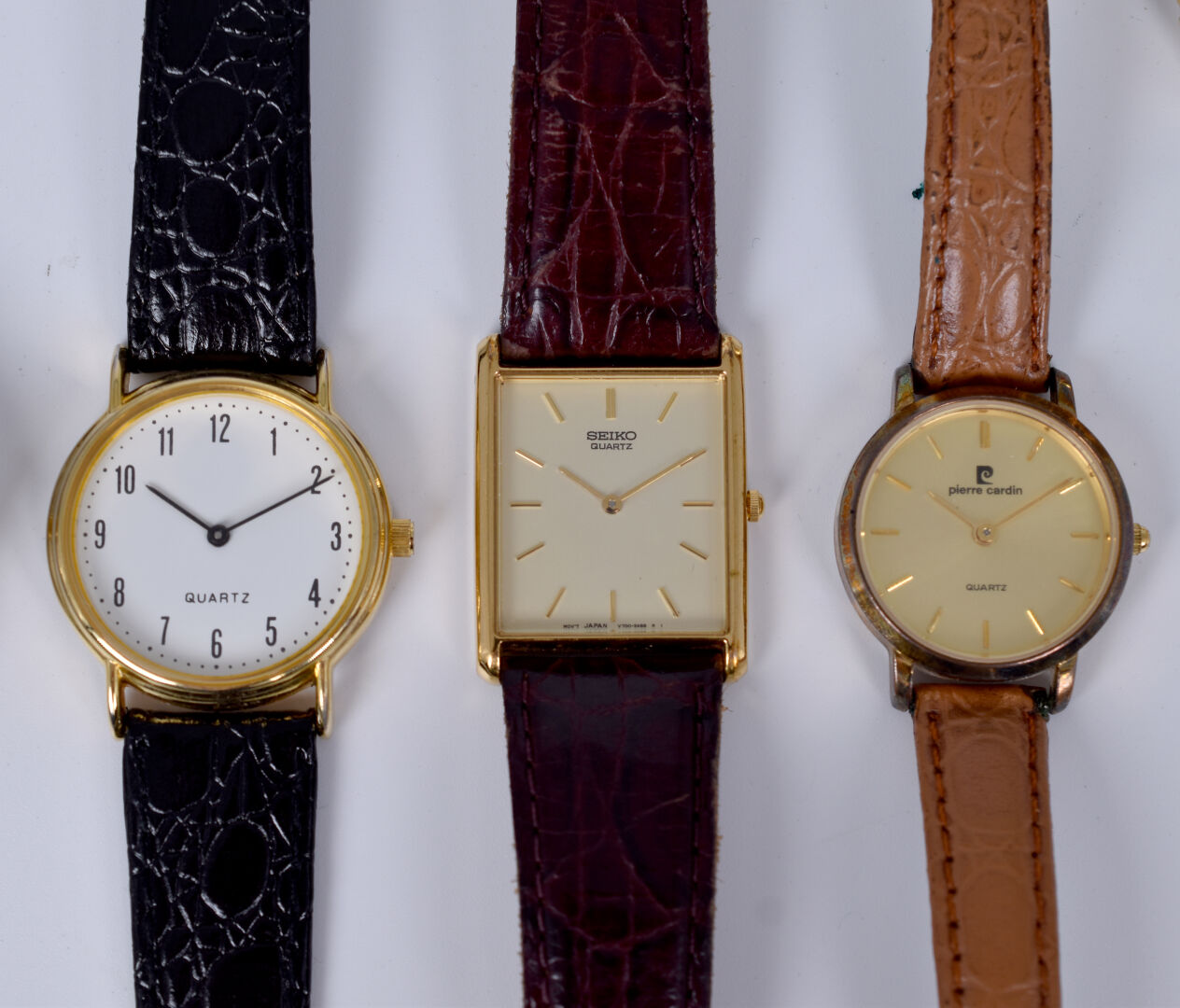 Ensemble de sept montres fantaisie dont SEIKO, CASIO et PIERRE CARDIN. Etat de marche non garanti. Usures d’usage.