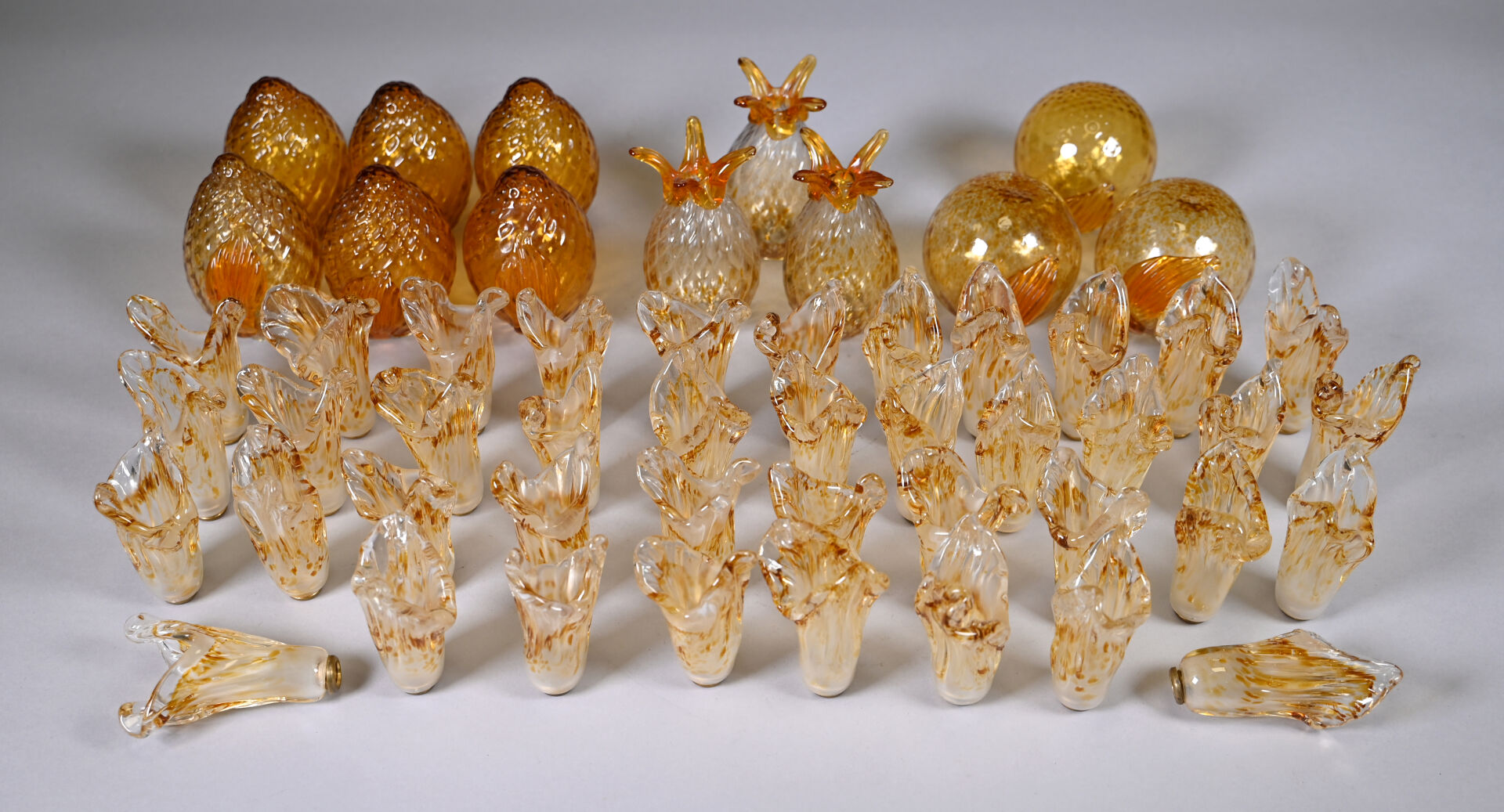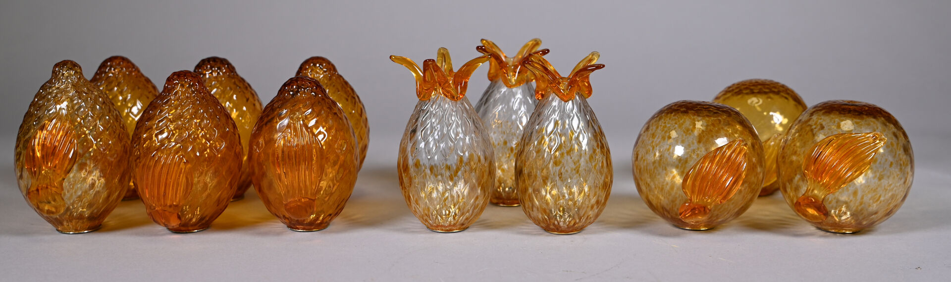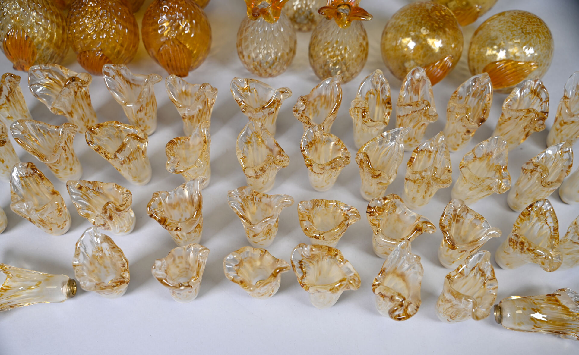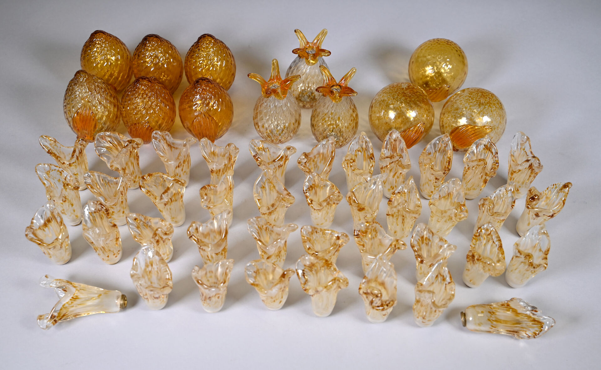 Ensemble de sphères, achantes et fruits en verre soufflé et appliqué partiellement ambré, probablement éléments de lustre. Murano, XXe siècle. (1 carton).