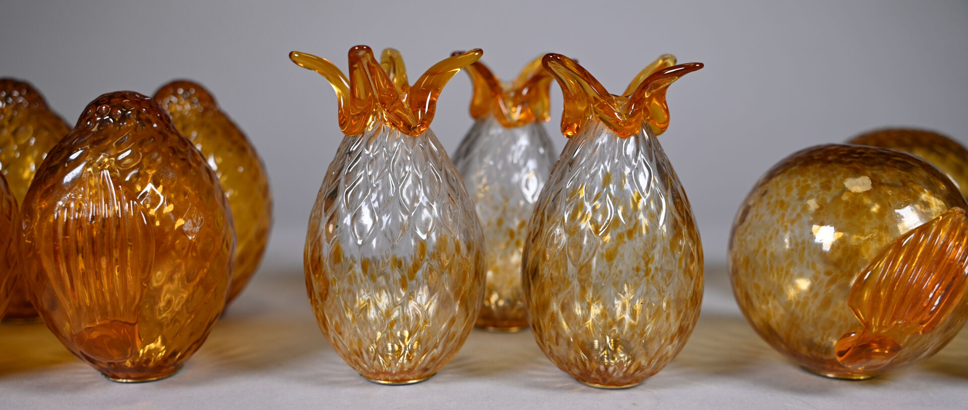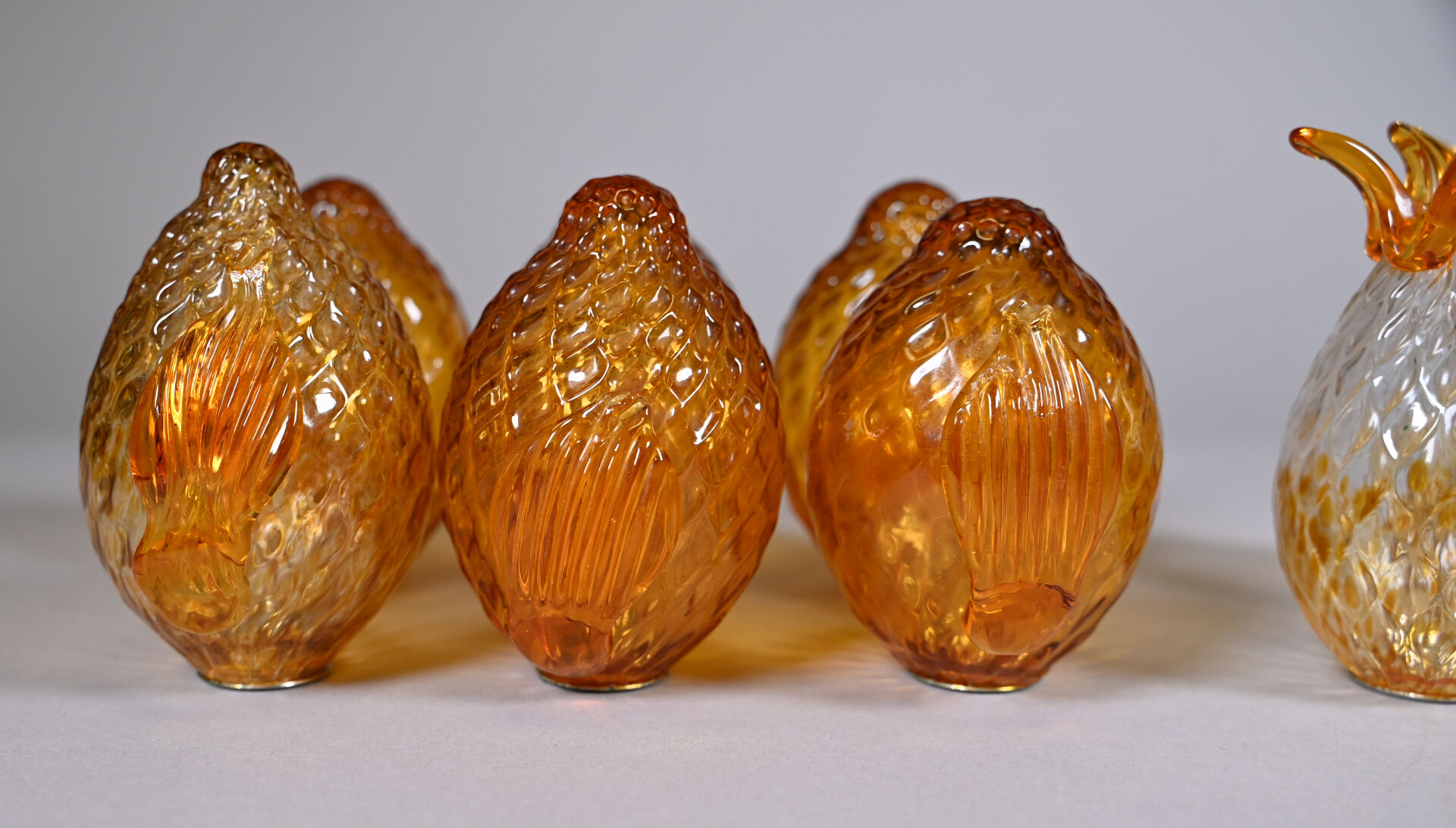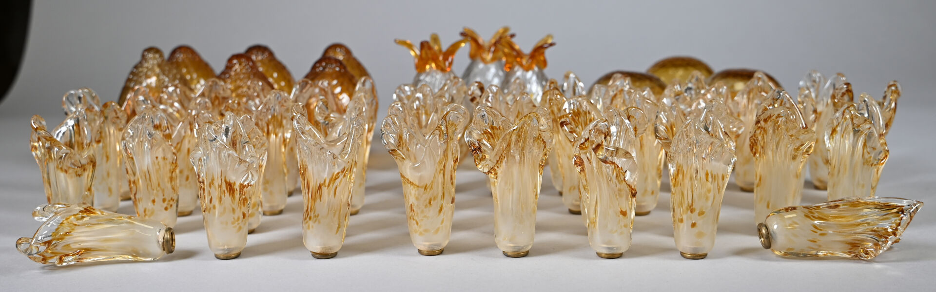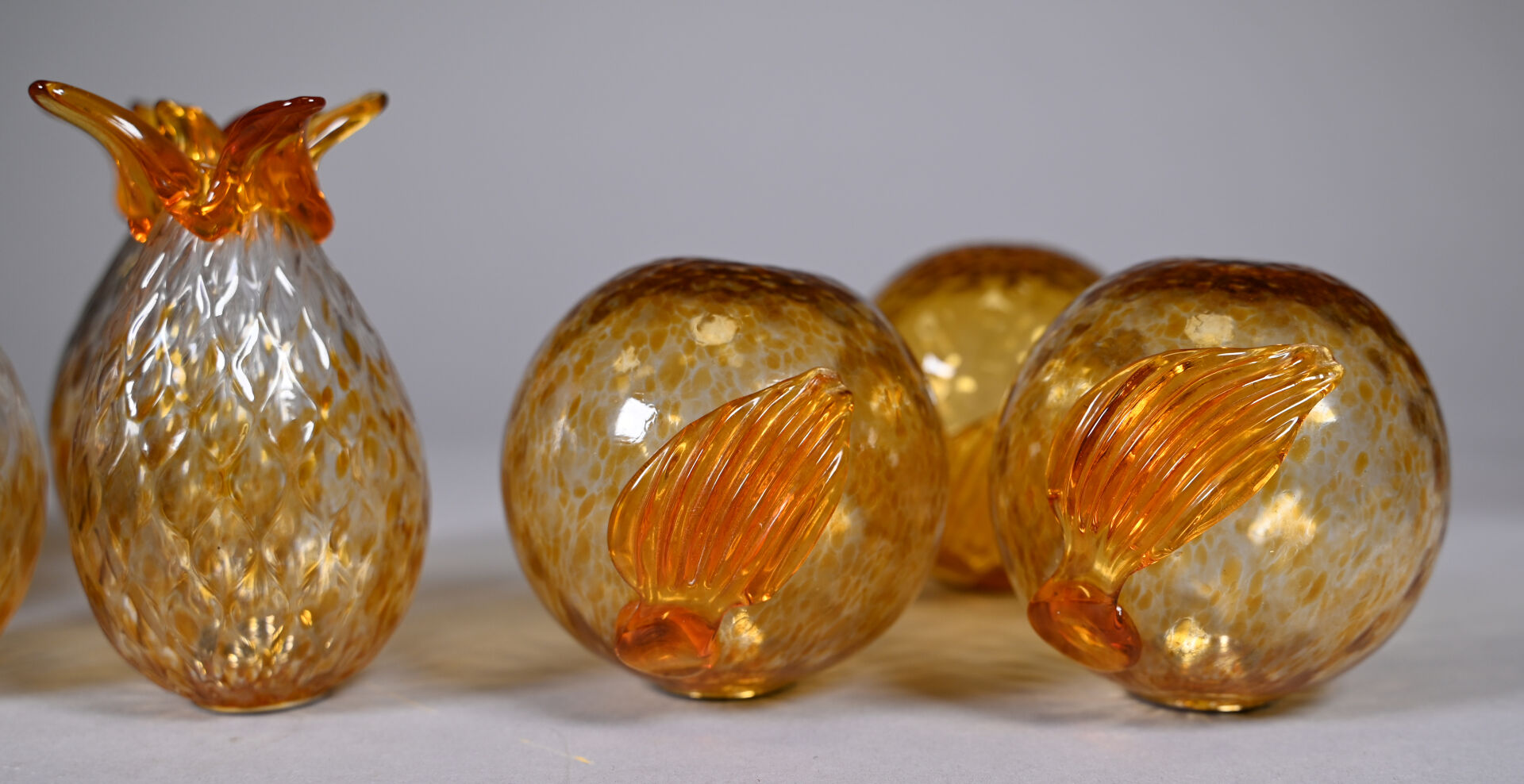 Ensemble de sphères, achantes et fruits en verre soufflé et appliqué partiellement ambré, probablement éléments de lustre. Murano, XXe siècle. (1 carton).