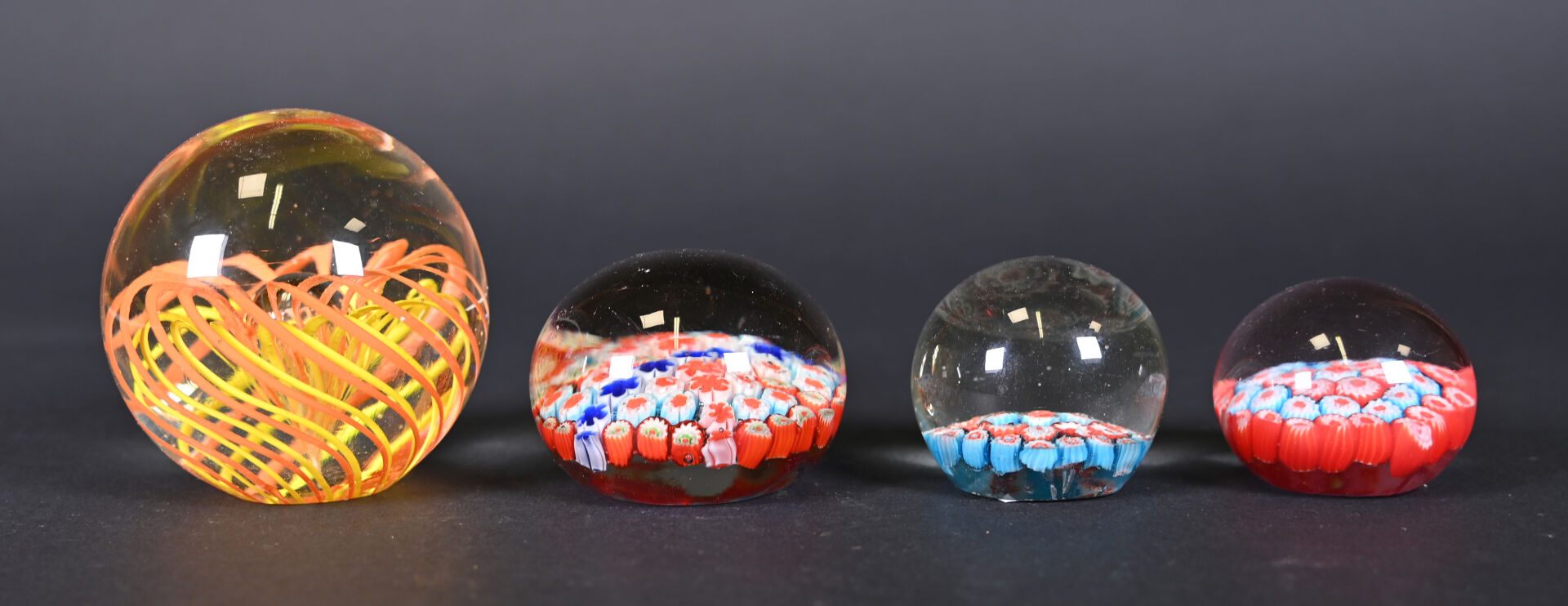 Ensemble de sulfures modernes, soit 3 millefiori et une à filigrannes jaune et orange. Haut. de la plus grande. : 9 cm.
