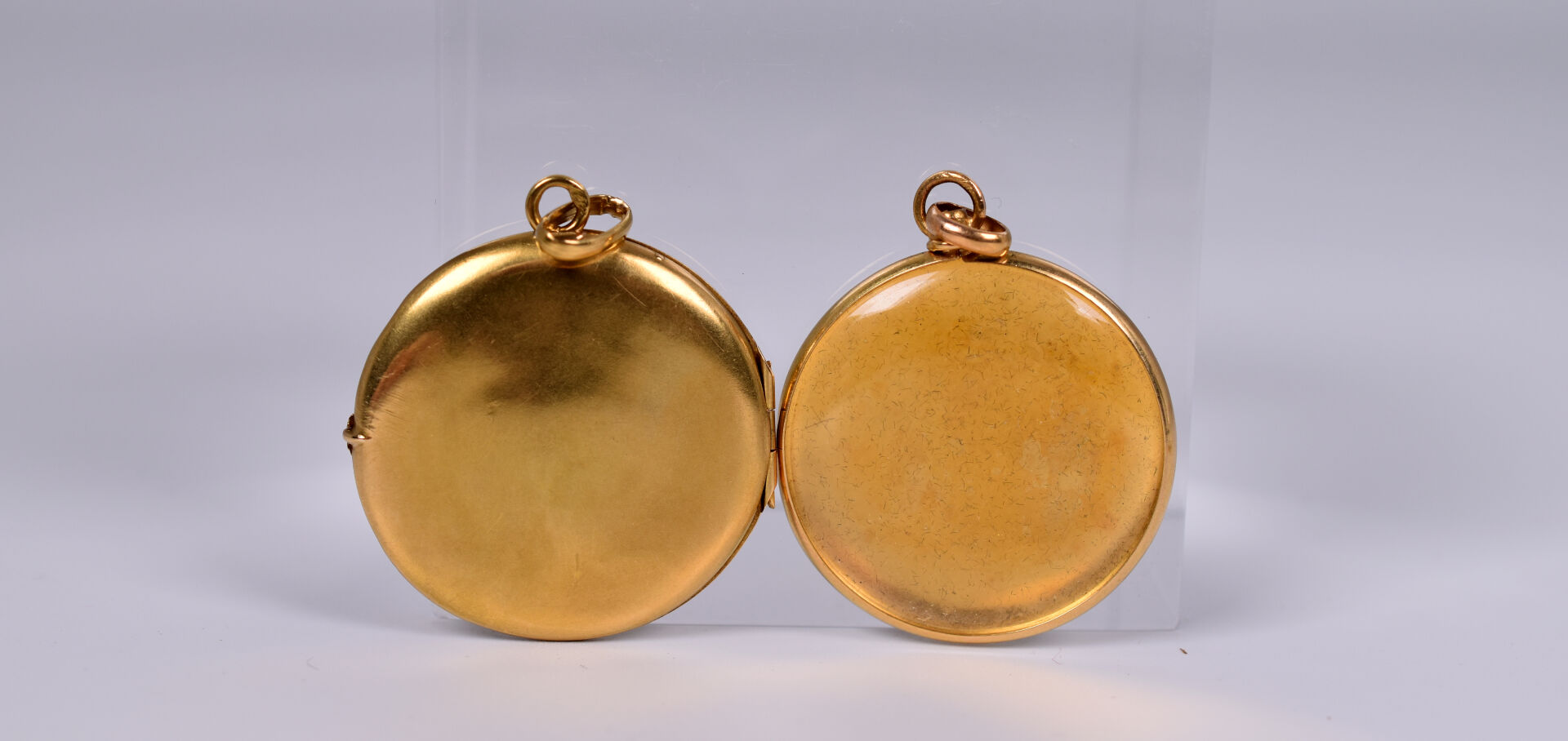 Ensemble de trois pendentifs porte-photos en or jaune 18K 750/1000e, deux avec verres, un orné d’un petit diamant de taille ancienne d’environ 0,05 carat. Poids brut total : 12,17 g.