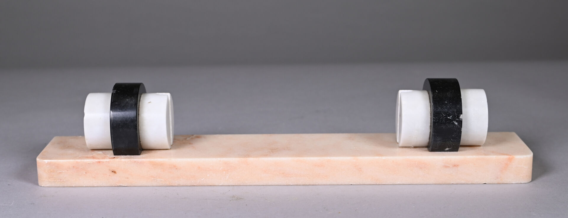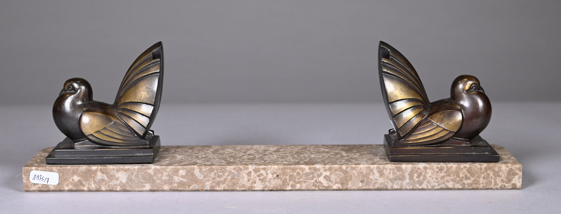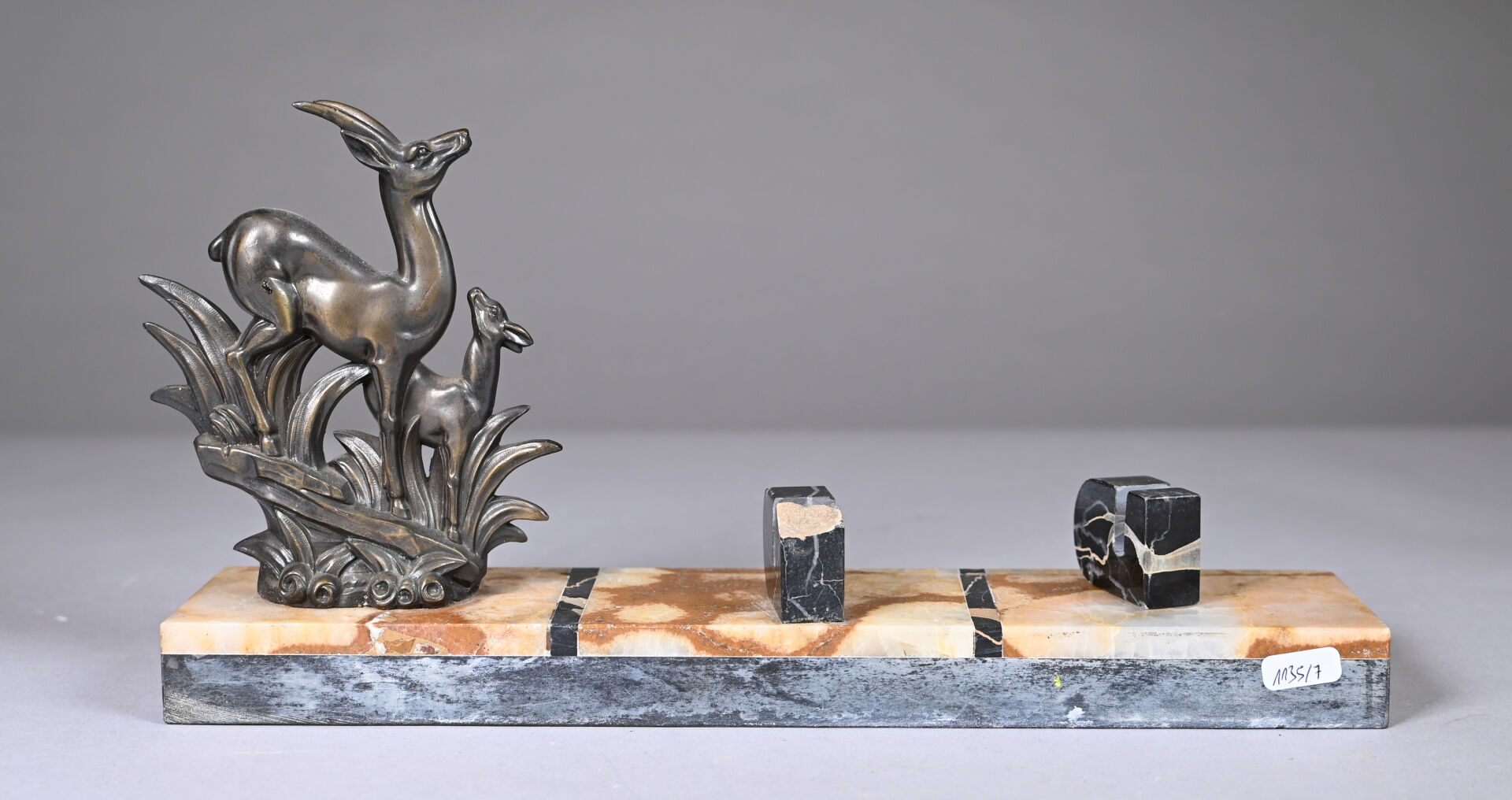 Ensemble de trois porte-menus en pierre dure et régule à décor de gazelles, oiseaux et motif géométriques (accidents, éclats)/ Epoque Art Déco. Long. : moyenne : 38 cm.
