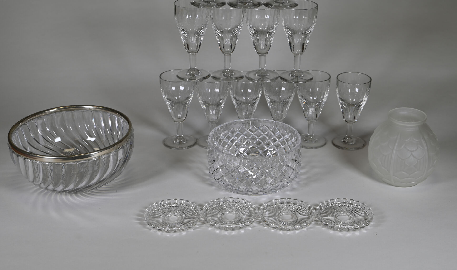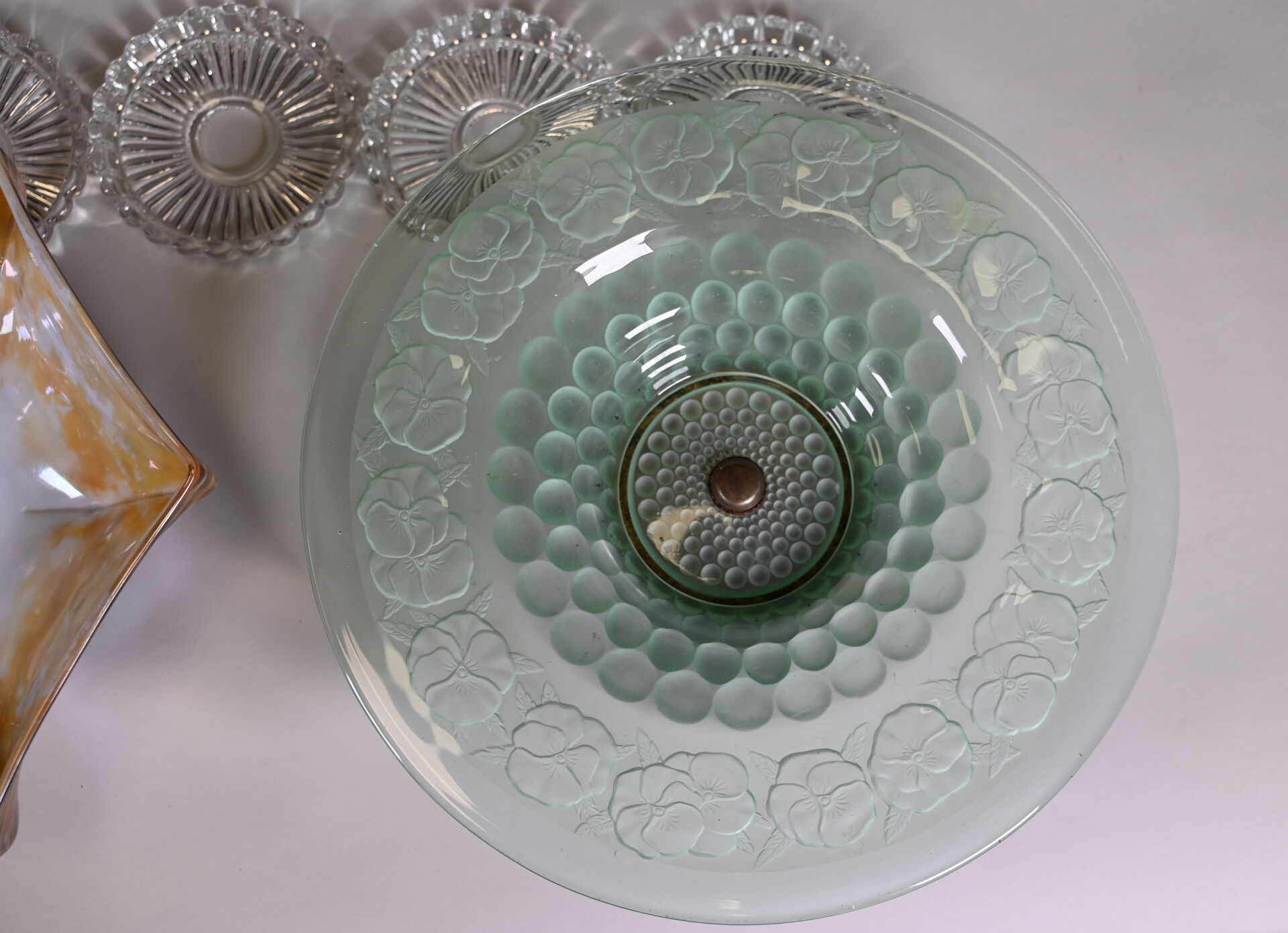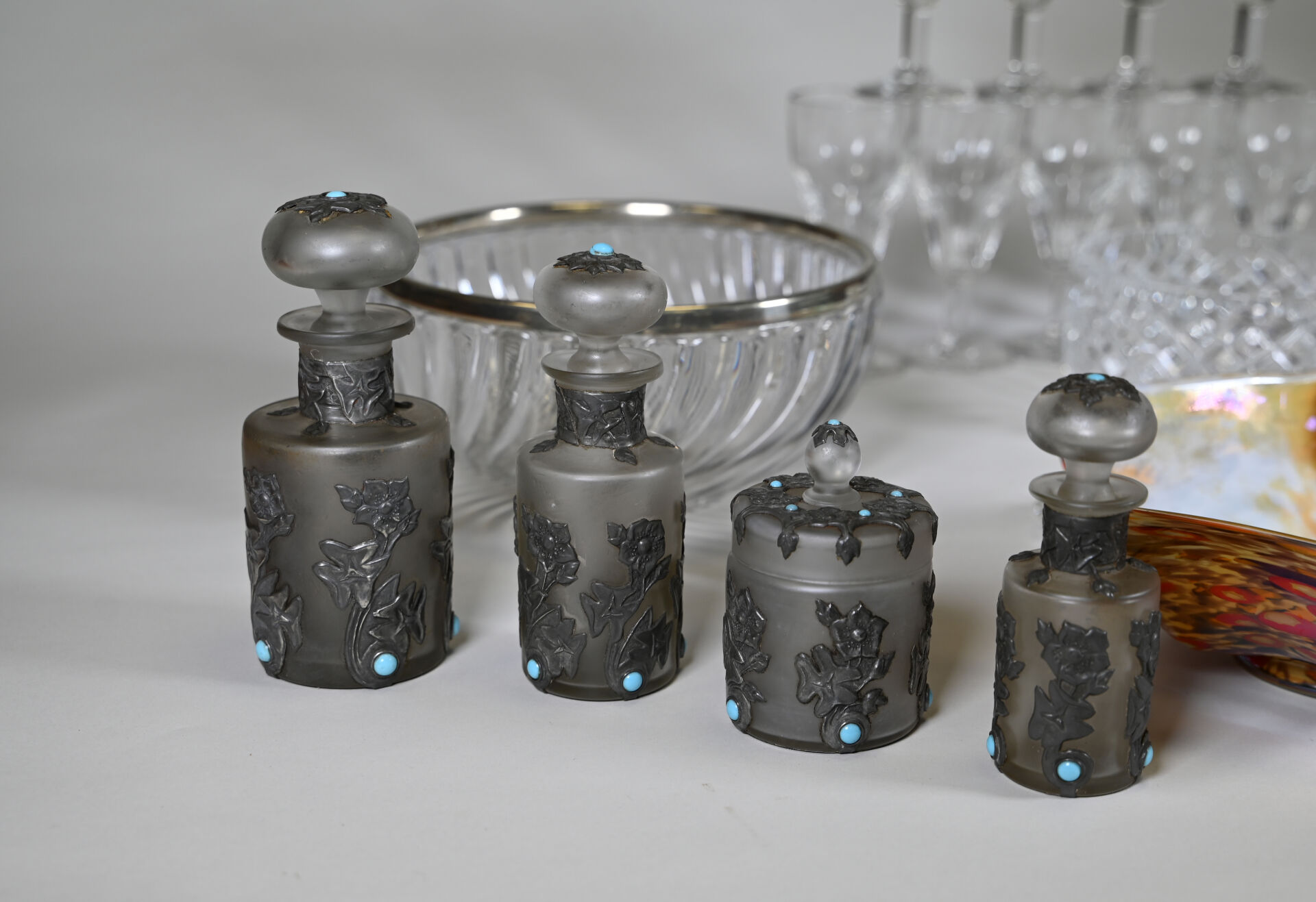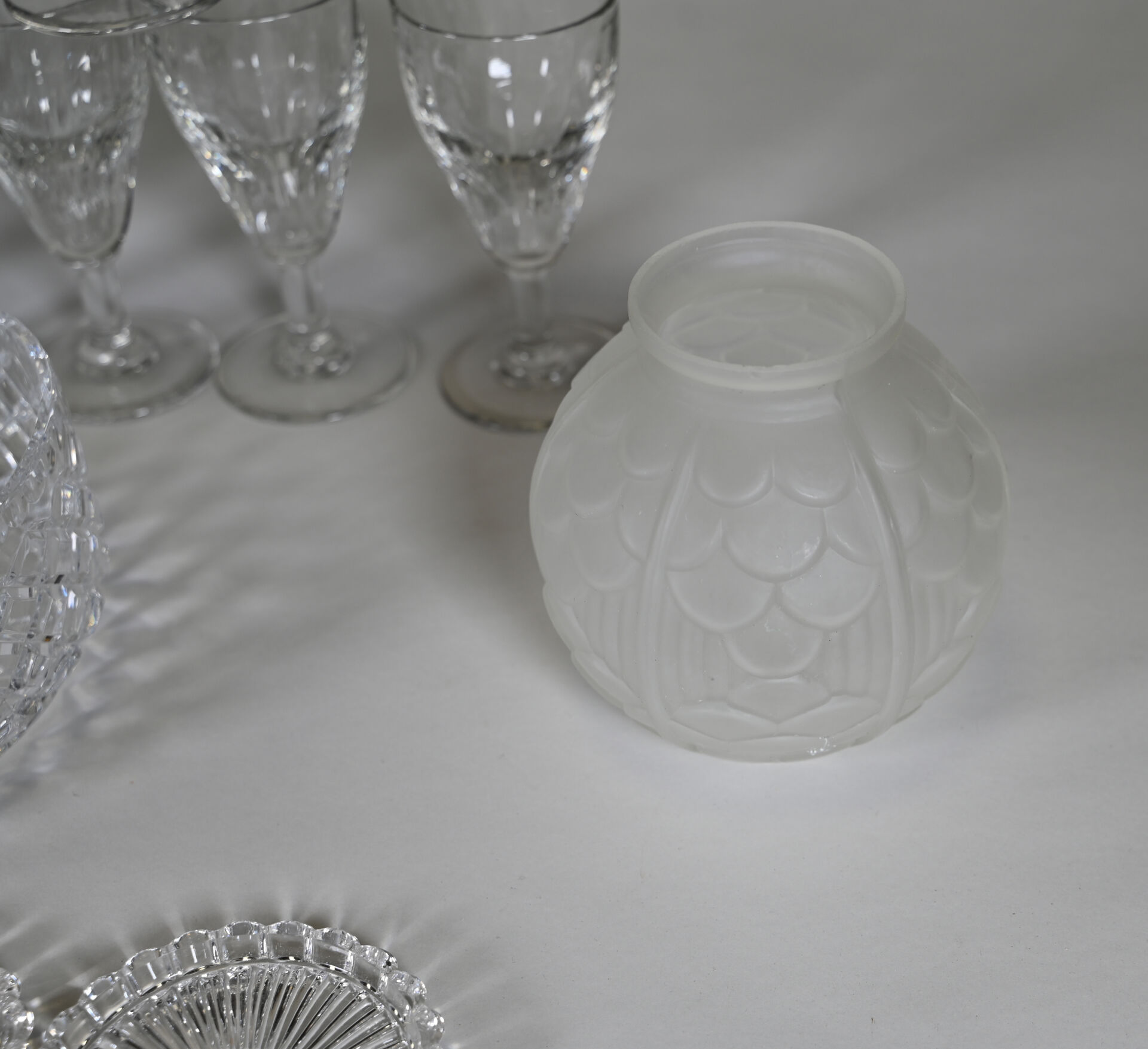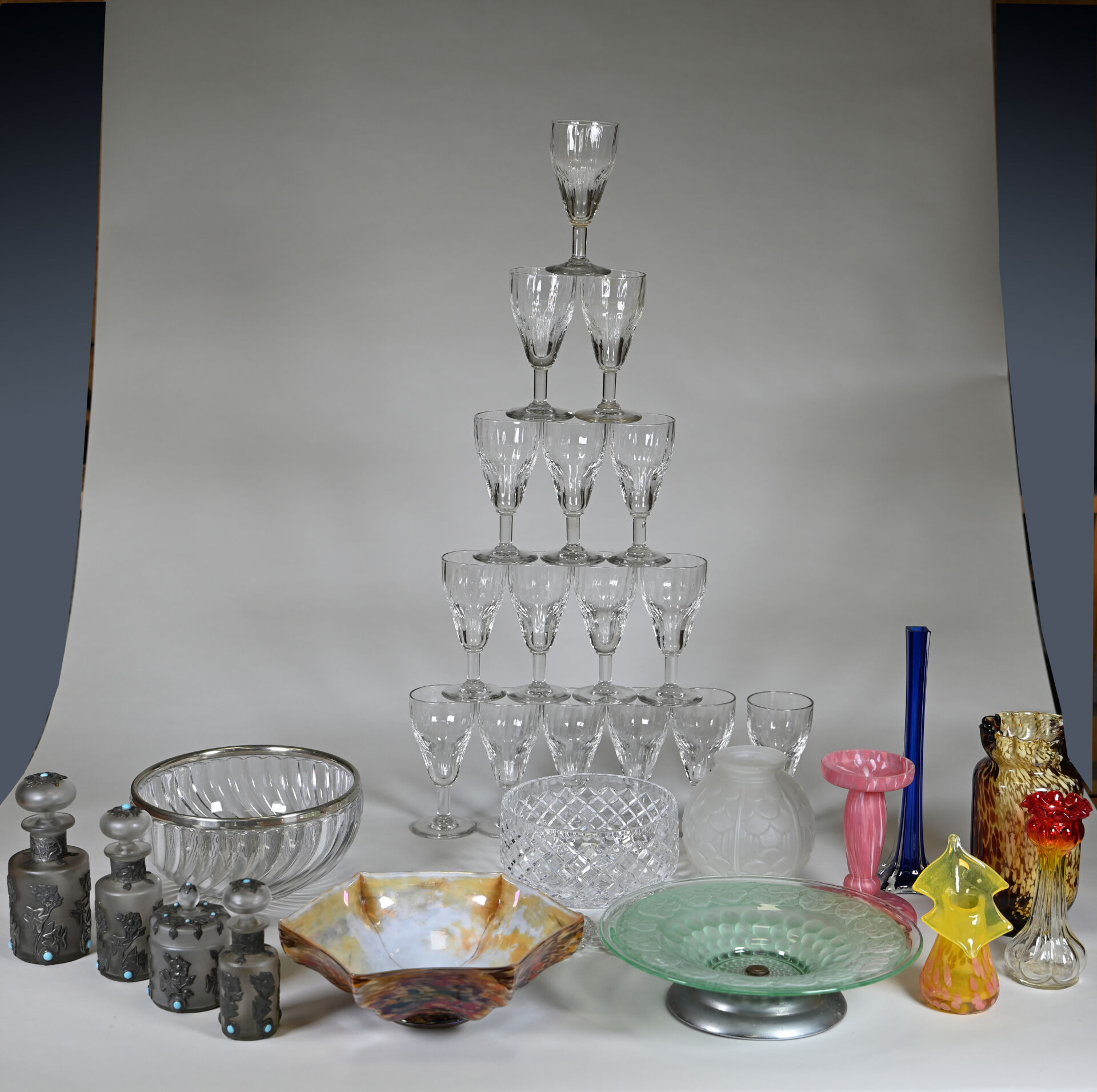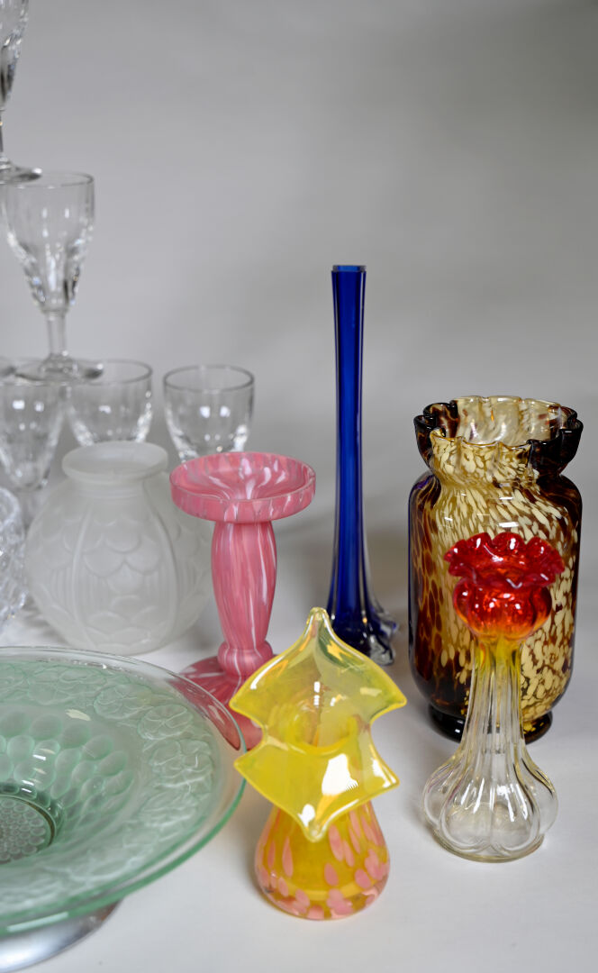 Ensemble de verrerie dont nécessaire de toilette en verre patiné gris à cabochons émaillés bleu, coupe en verre marmoréen, coupe en verre moulé vert à décor de pensées, soliflore en verre bleu, soliflore en verre rouge et jaune, globe en verre dépoli à décor Art déco et verre à pied en cristalo. 2 caisses.