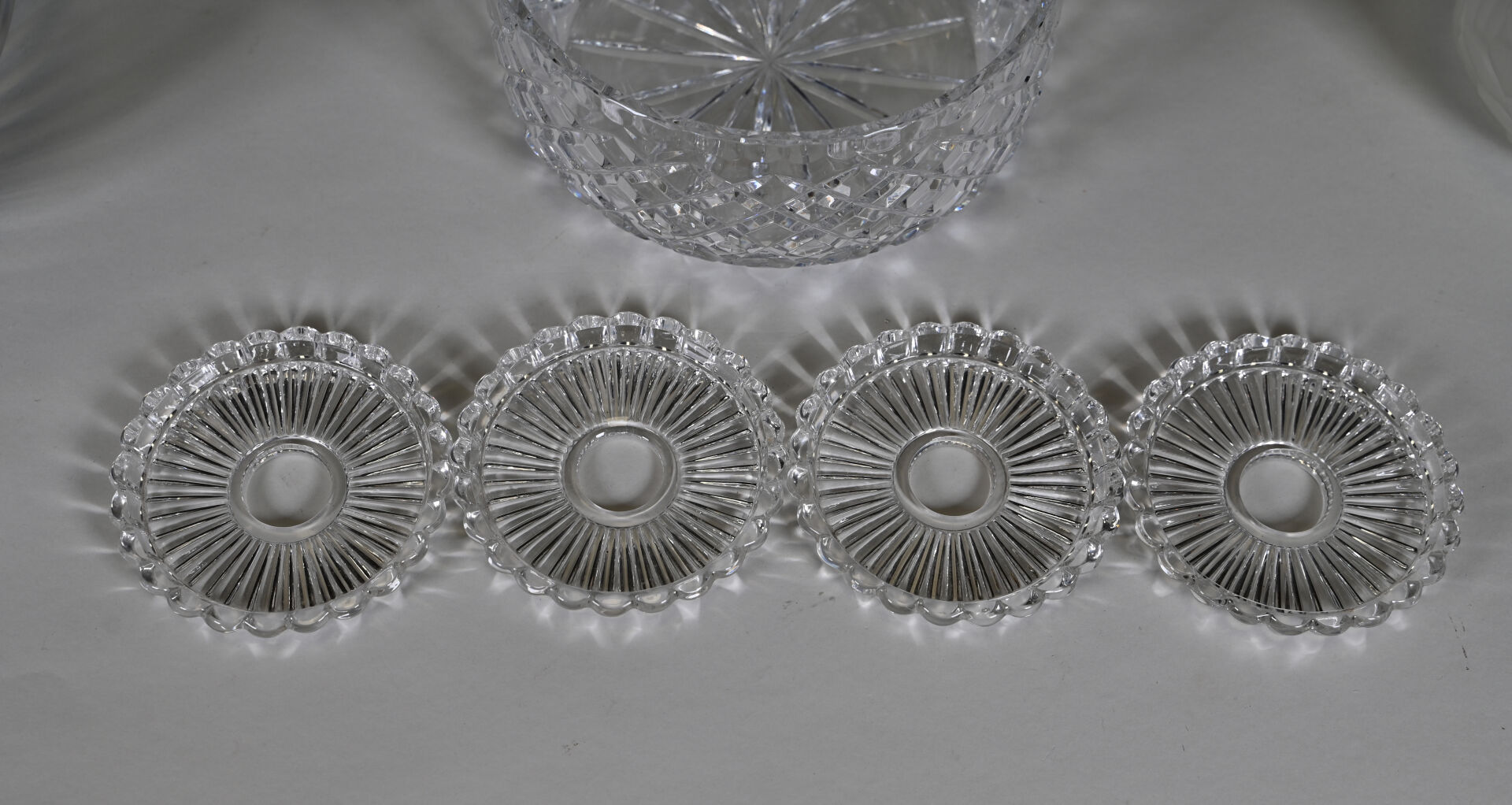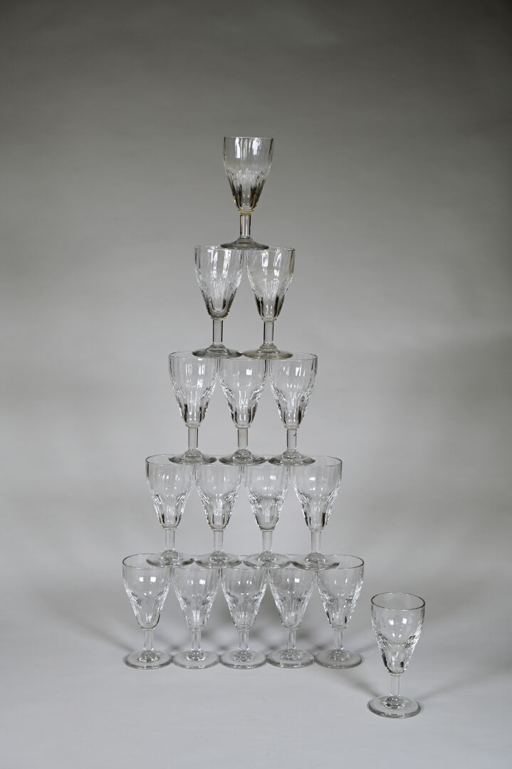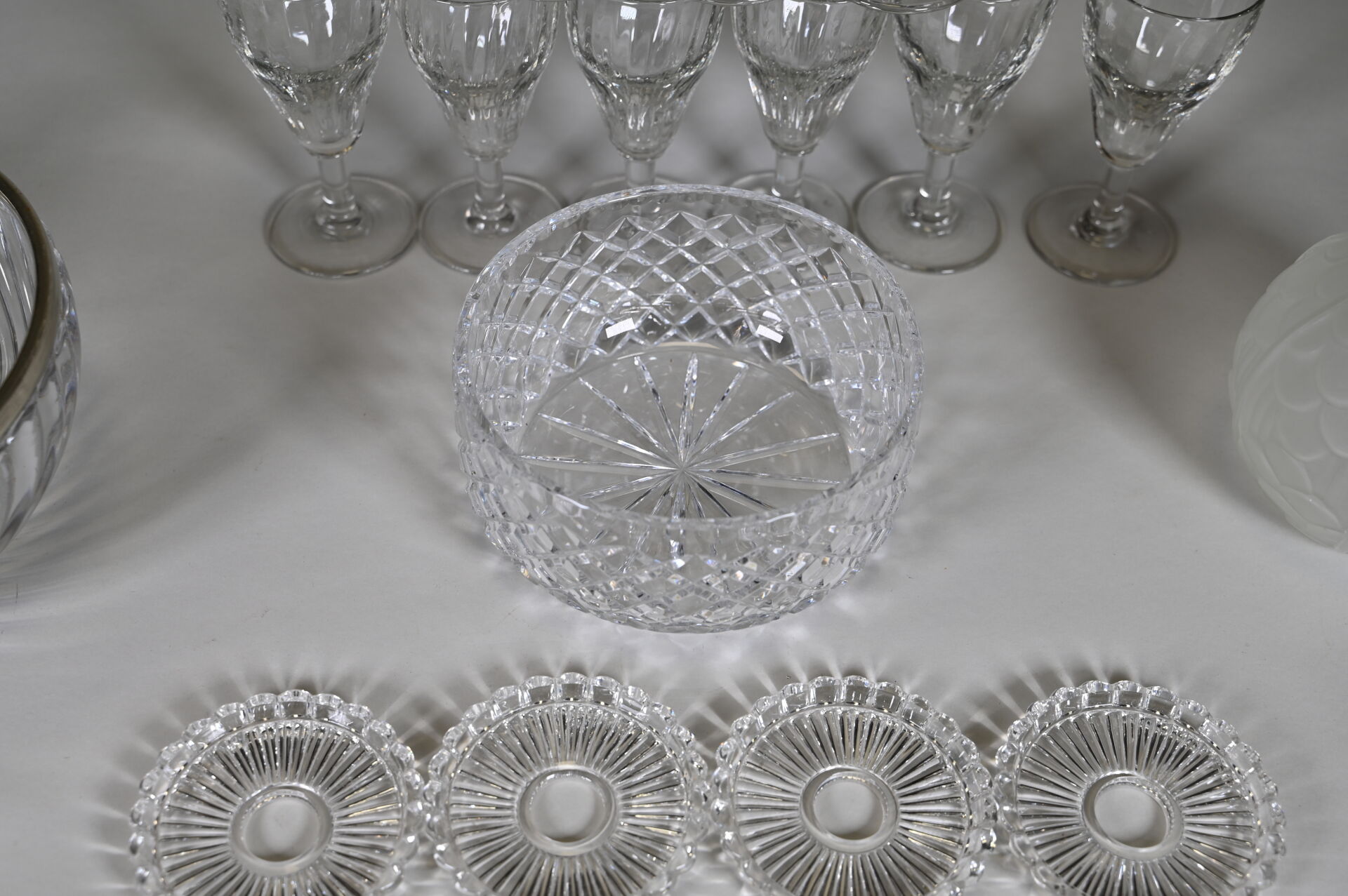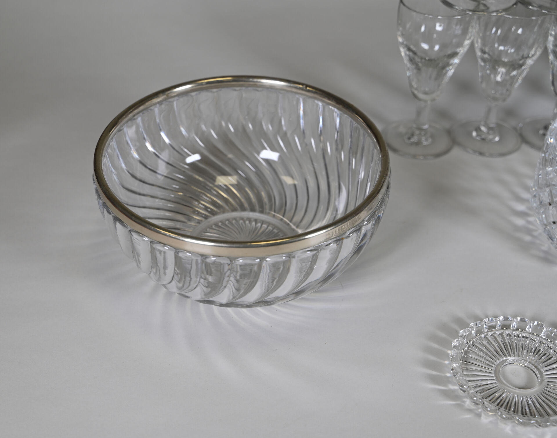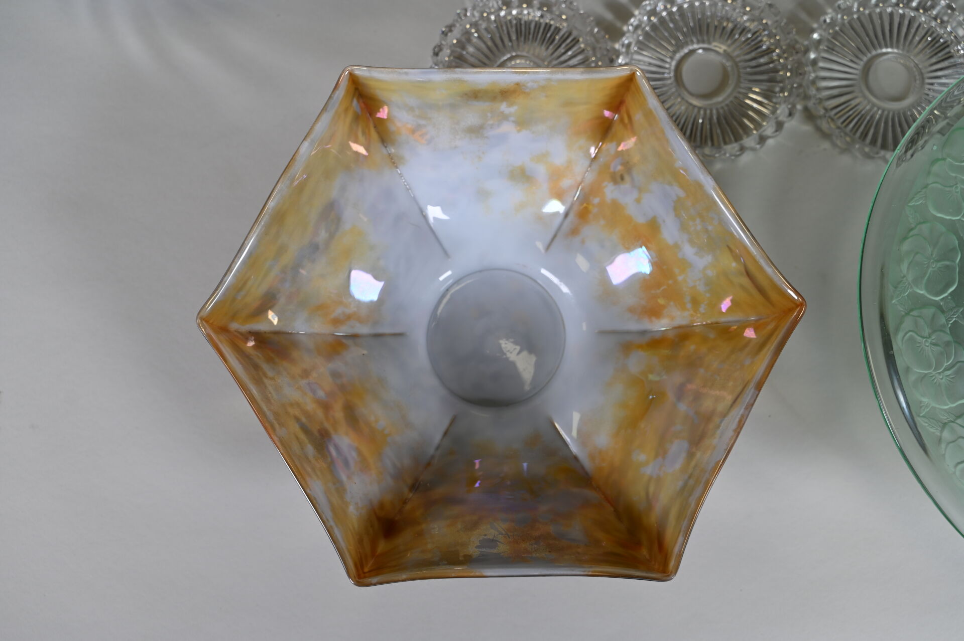 Ensemble de verrerie dont nécessaire de toilette en verre patiné gris à cabochons émaillés bleu, coupe en verre marmoréen, coupe en verre moulé vert à décor de pensées, soliflore en verre bleu, soliflore en verre rouge et jaune, globe en verre dépoli à décor Art déco et verre à pied en cristalo. 2 caisses.