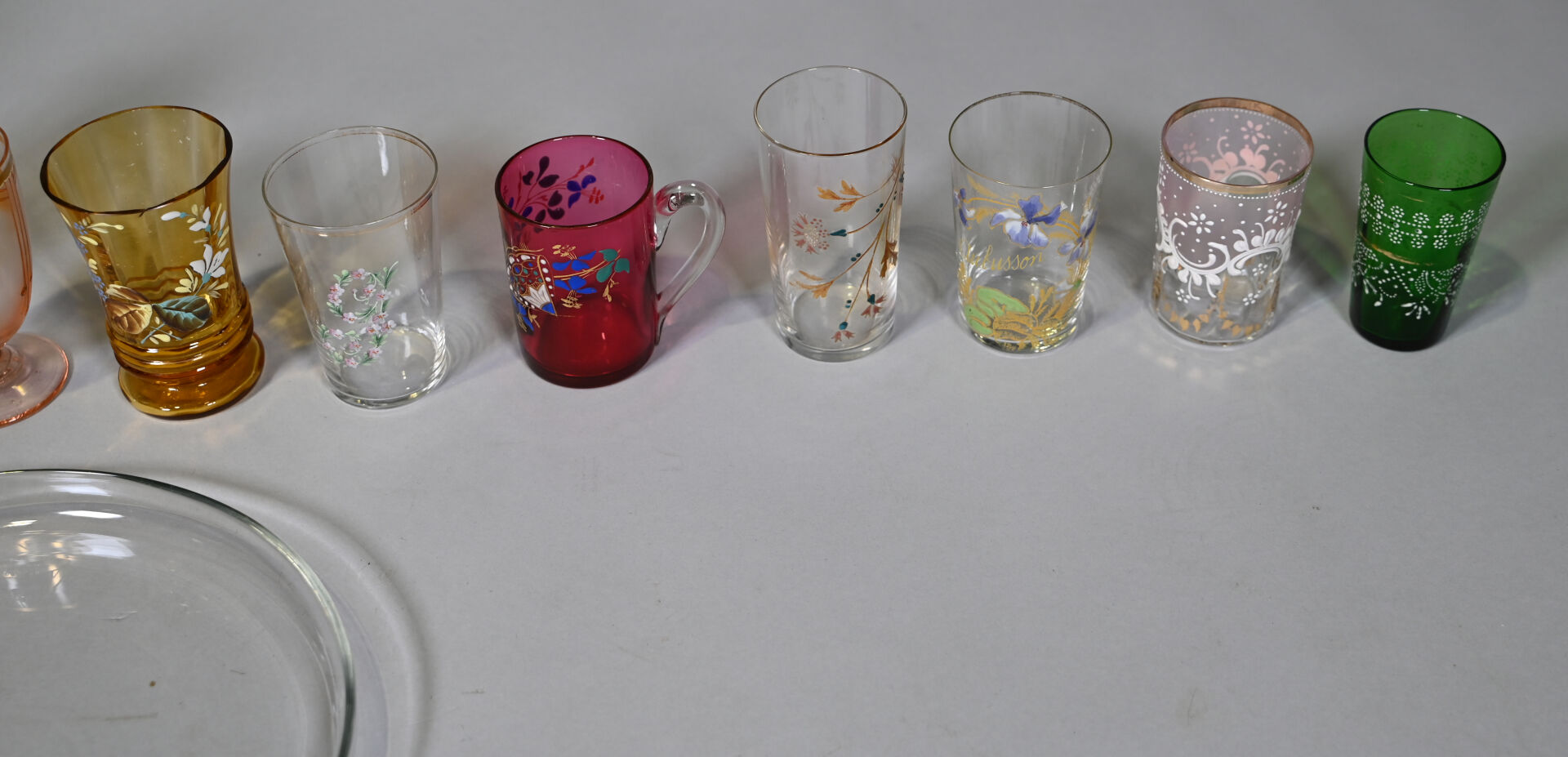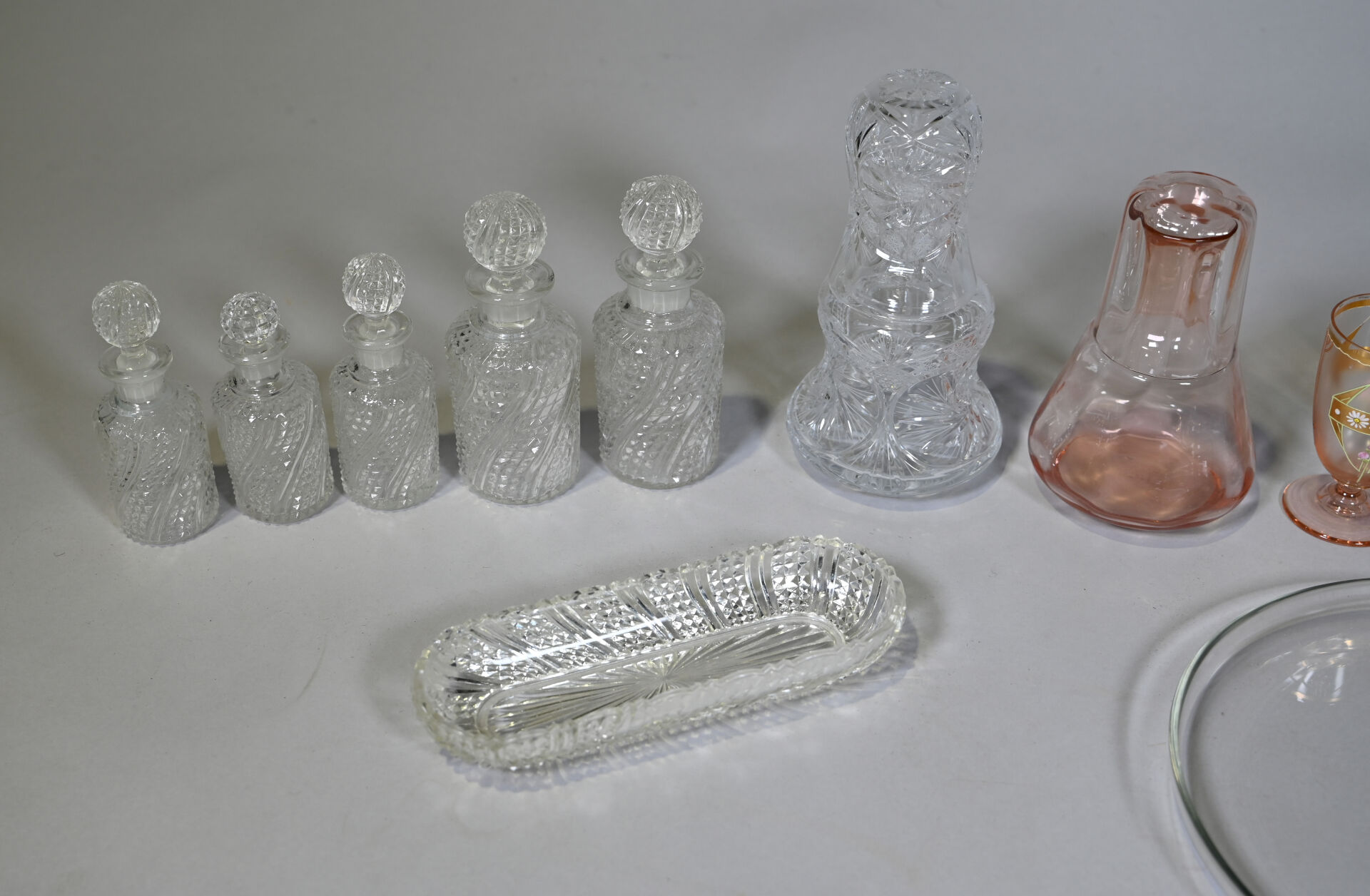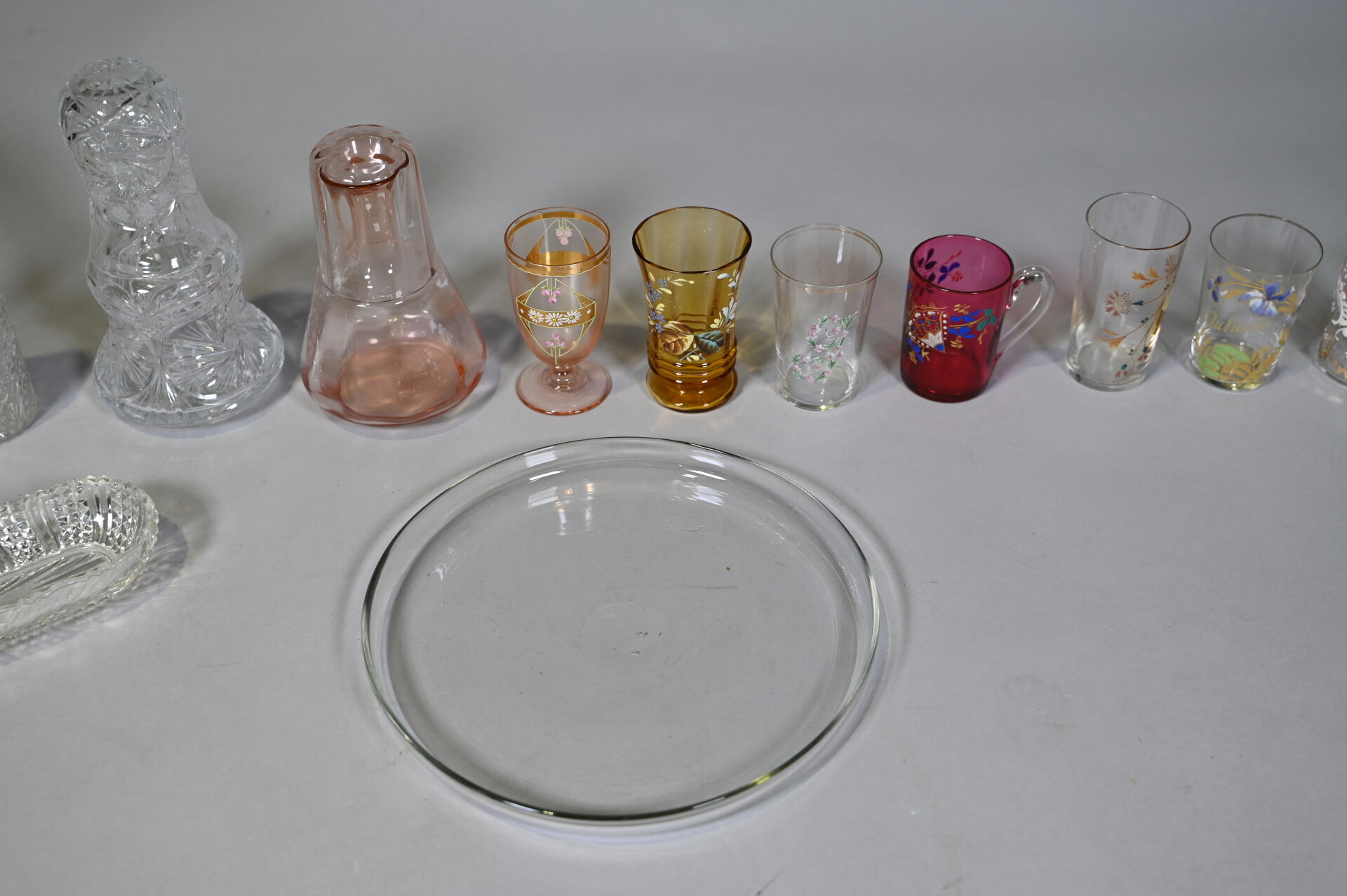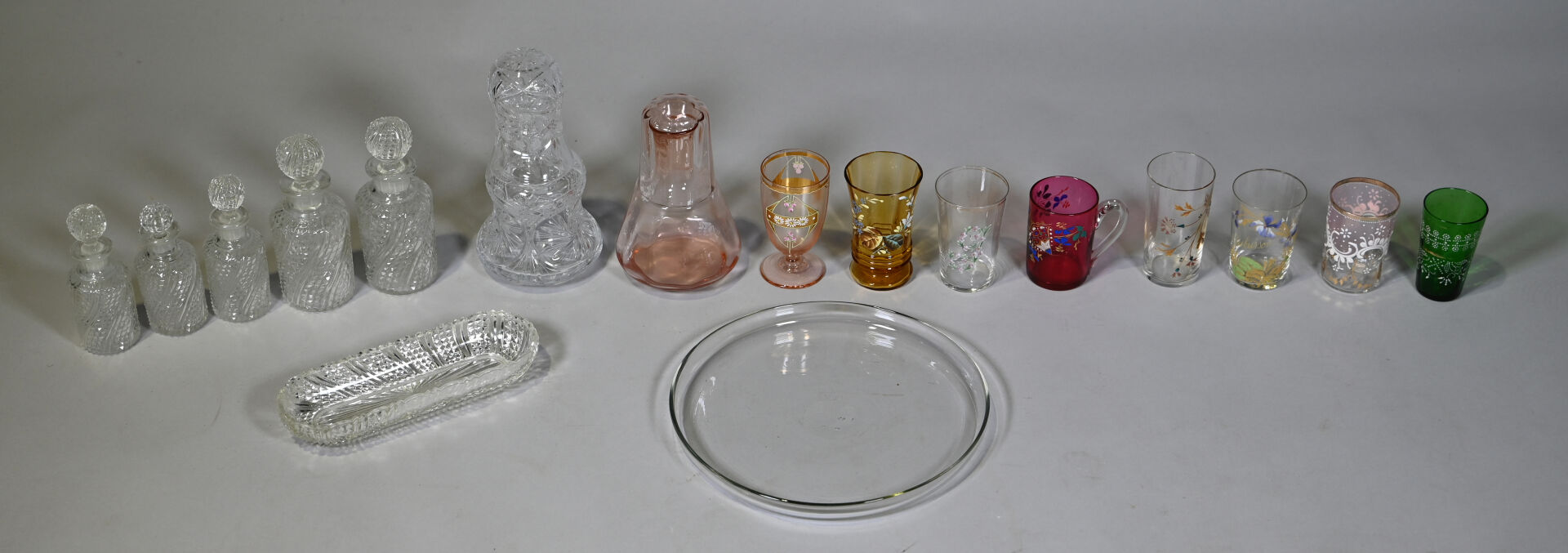 Ensemble de verrerie en majorité en verre clair et coloré dont service de toilette, plateau, service de nuit et gobelets. Quelques égrenures sur l’ensemble. 1 caisse.