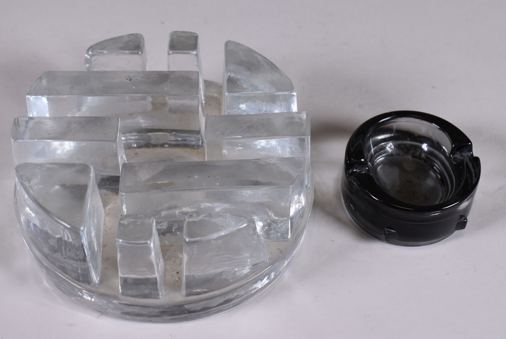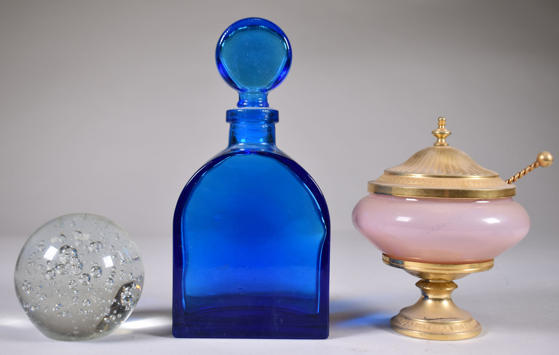 Ensemble de verrerie hétéroclyte soit un flacon et son bouchon en verre bleu, un porte documents en cristal moulé, un compotier en opaline rose, un cendrier en verre fumé noir, une sulfure à bulles. Haut. du flacon : 23 cm.