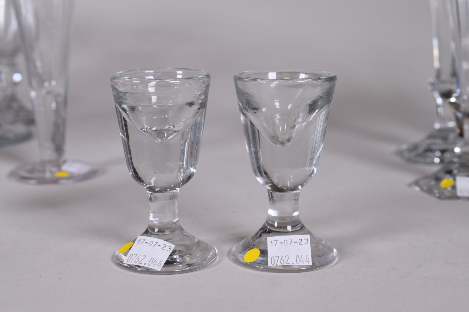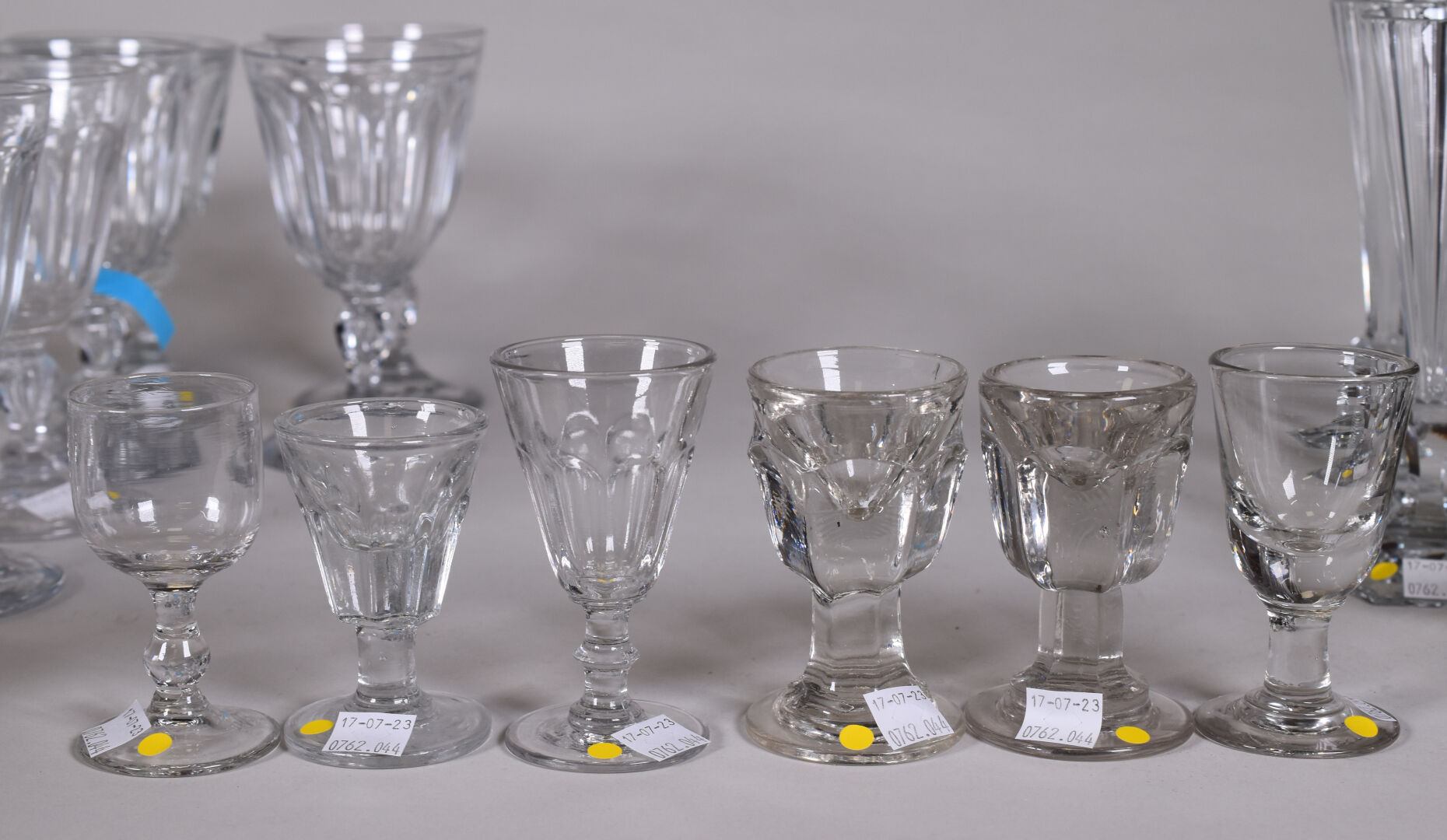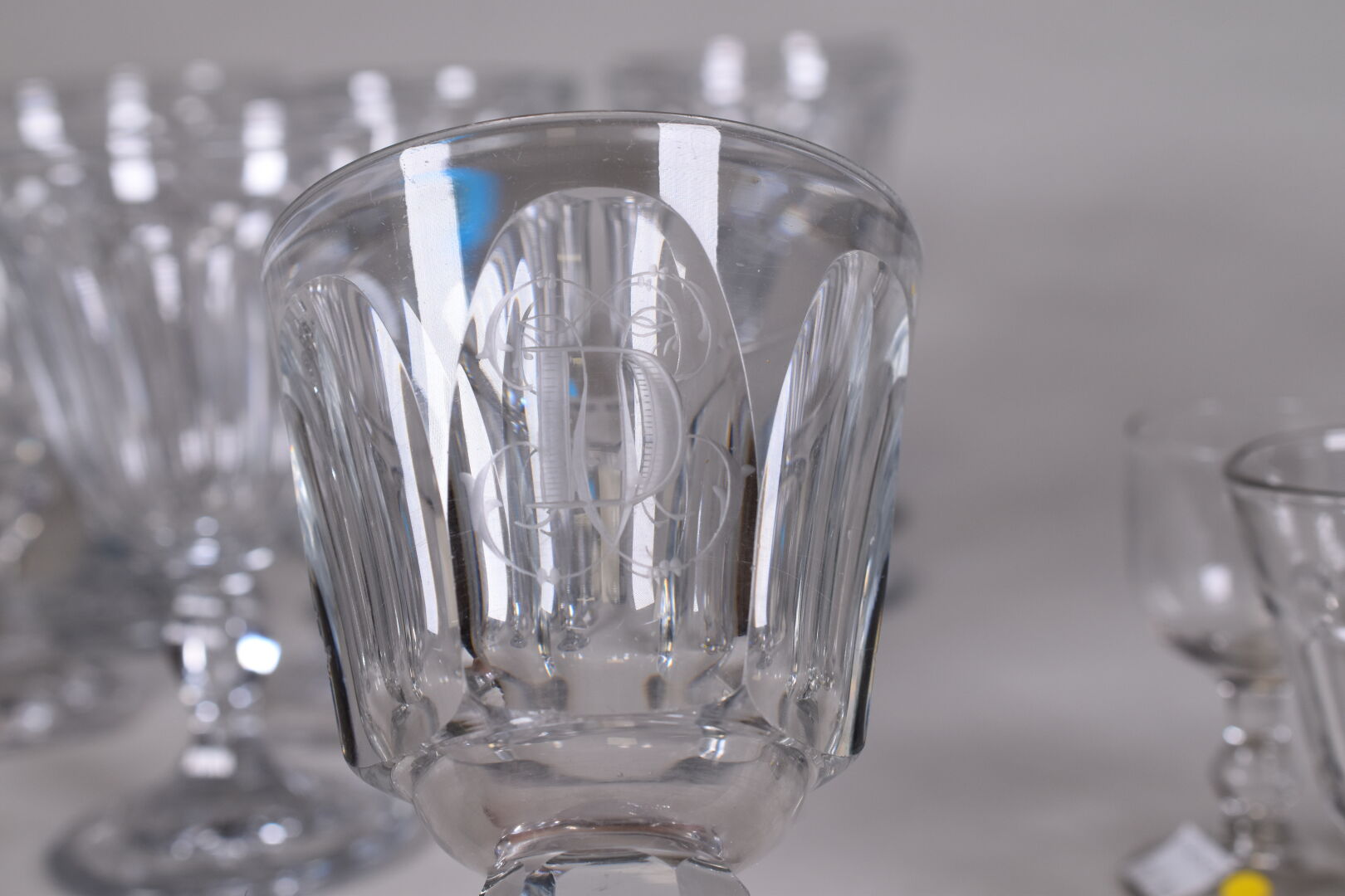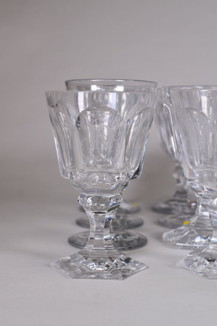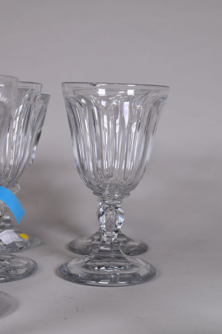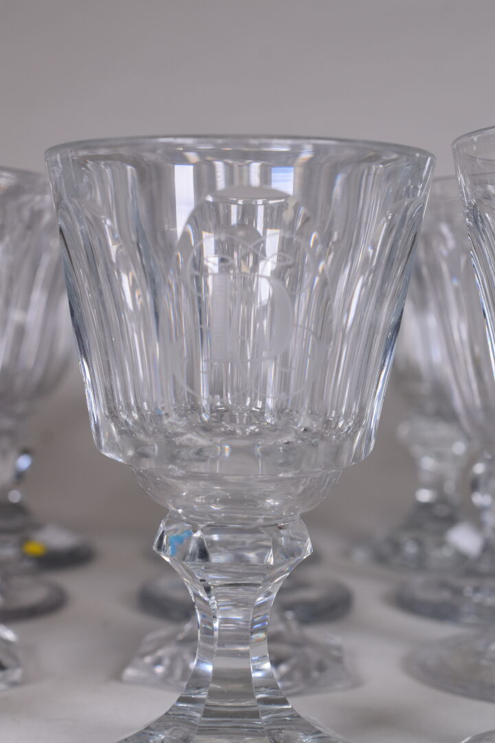 Ensemble de verres à pied, principalement en cristal dont une suite dans le goût de BACCARAT du modèle Harcourt, soit 12 verres à eau (éclats), et 12 autres verres.
