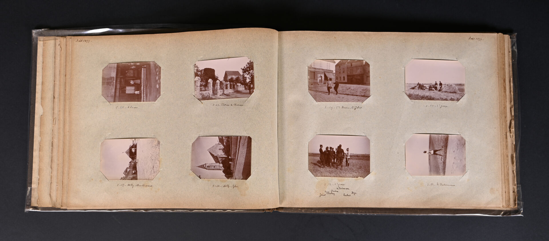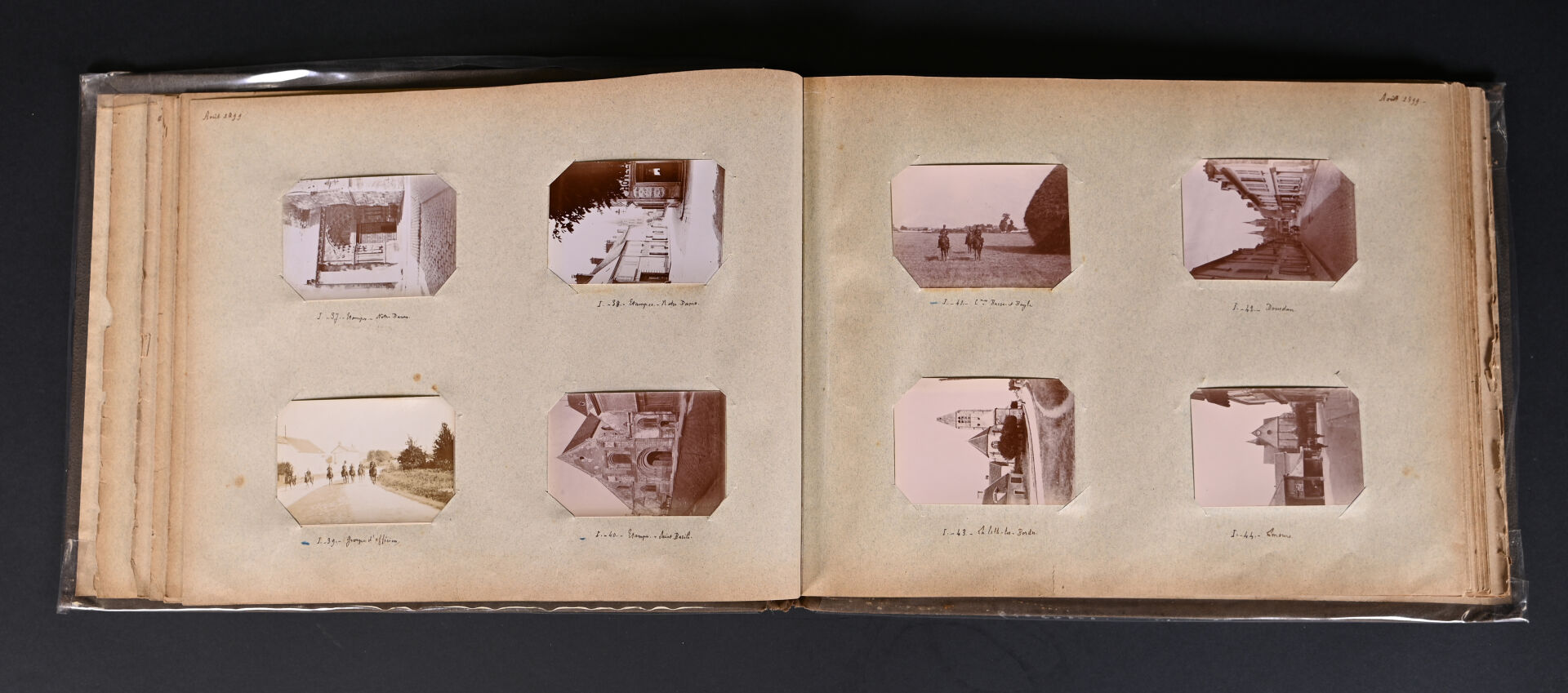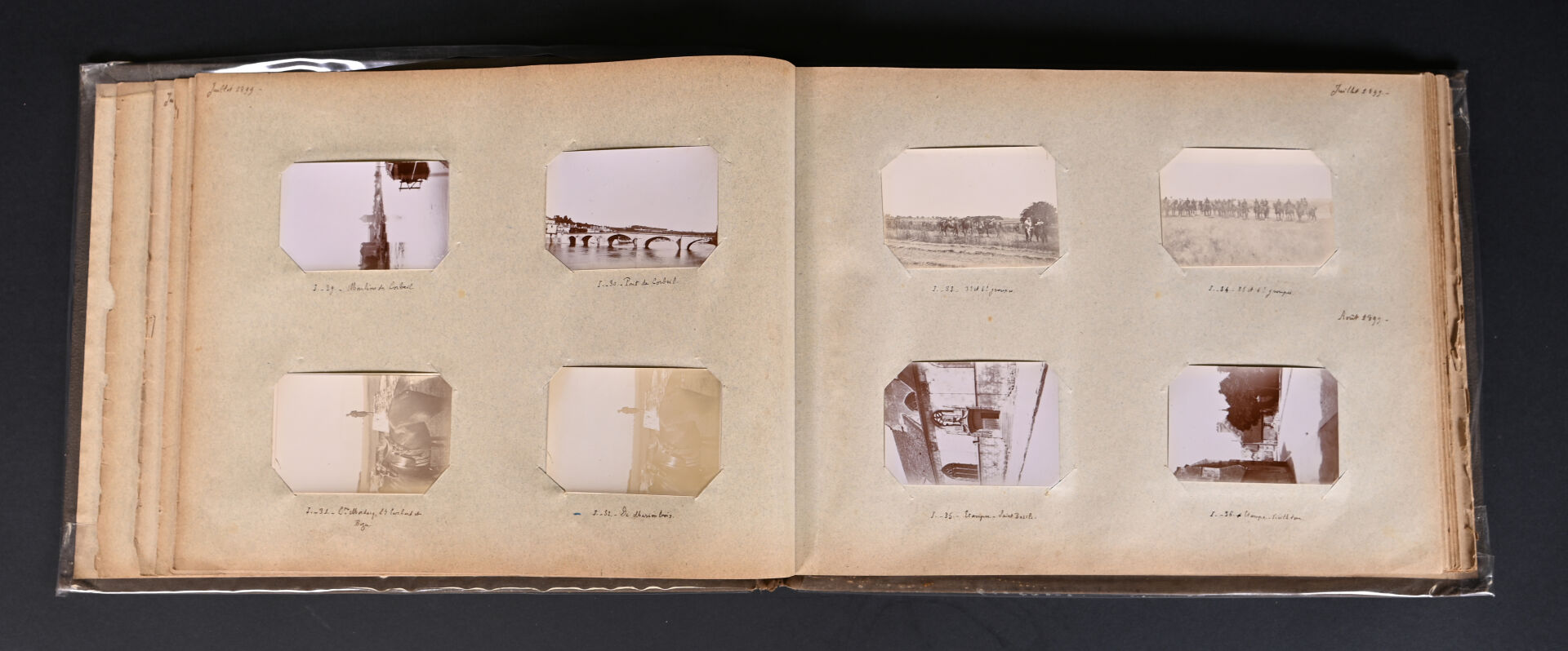 Ensemble d’environ 157 tirages photographiques miniature dans un album, sujets variés, France, étranger, militaires, portraits, paysages…. Vers 1900. Dim. moyennes : 5,2 x 7,3 cm.
