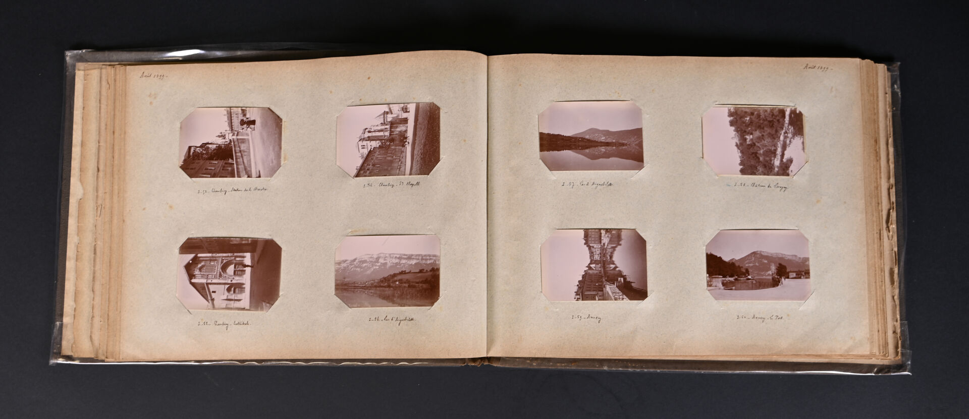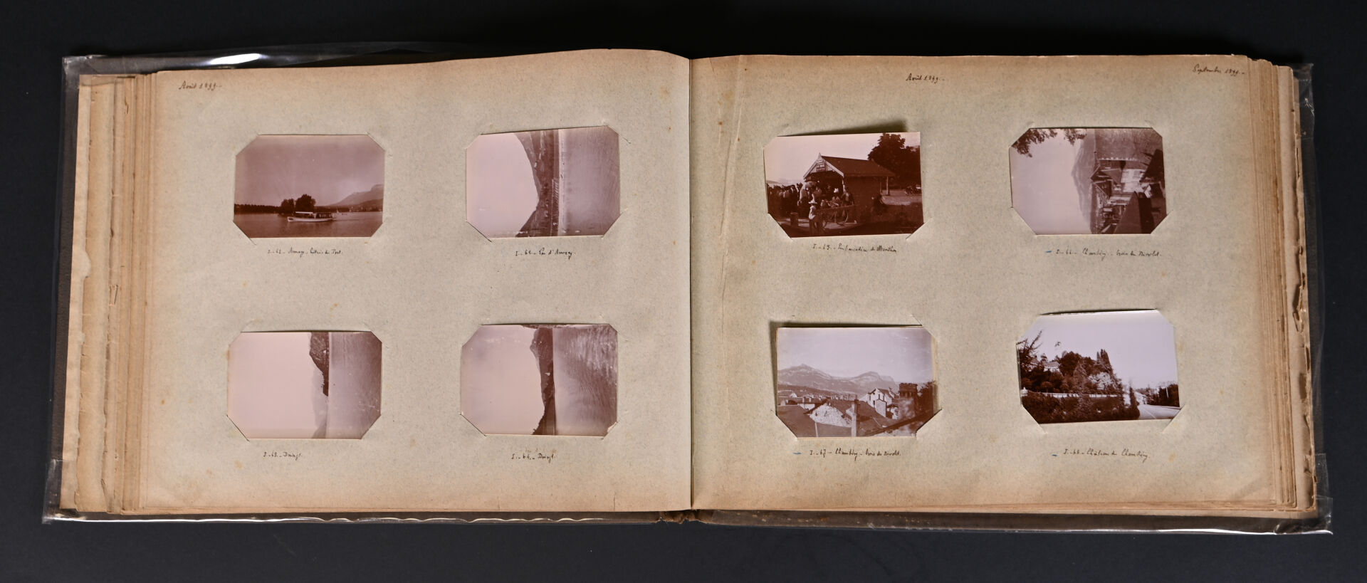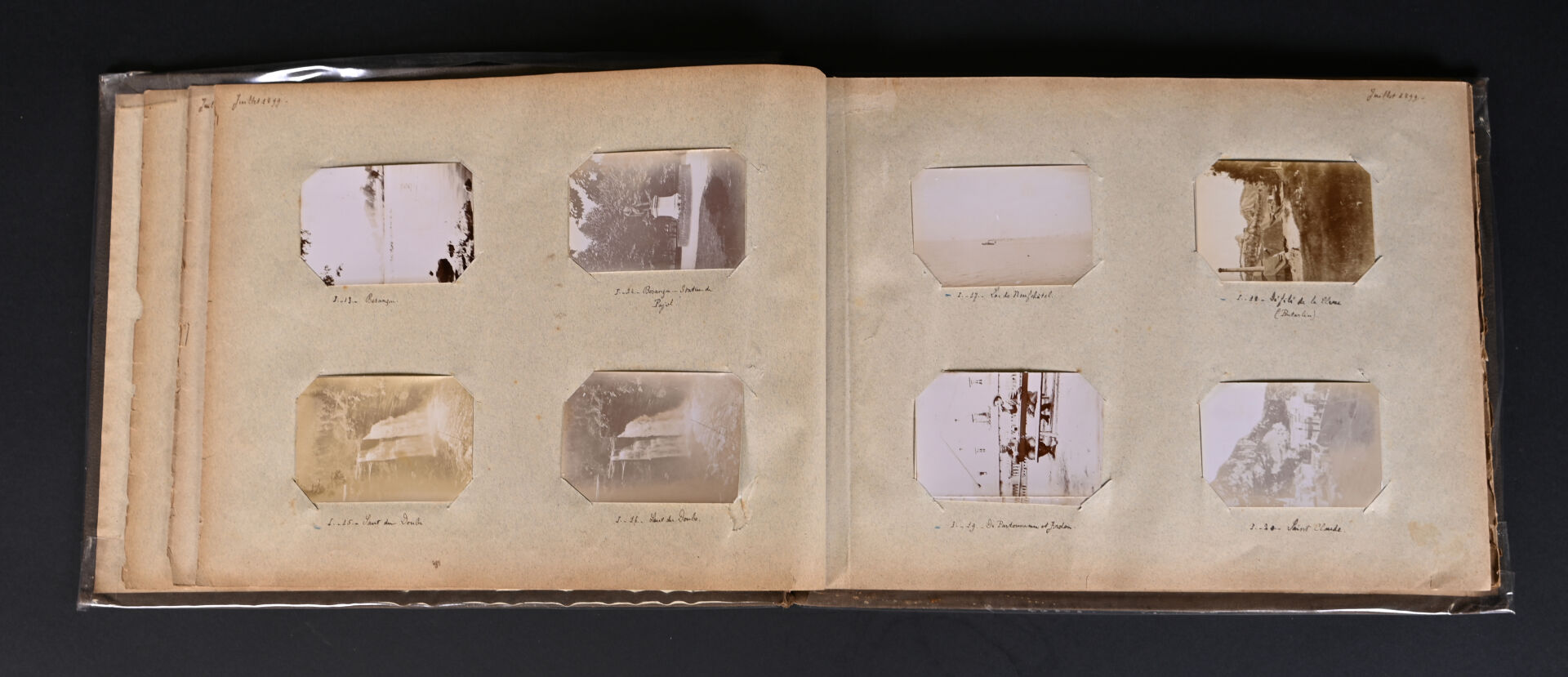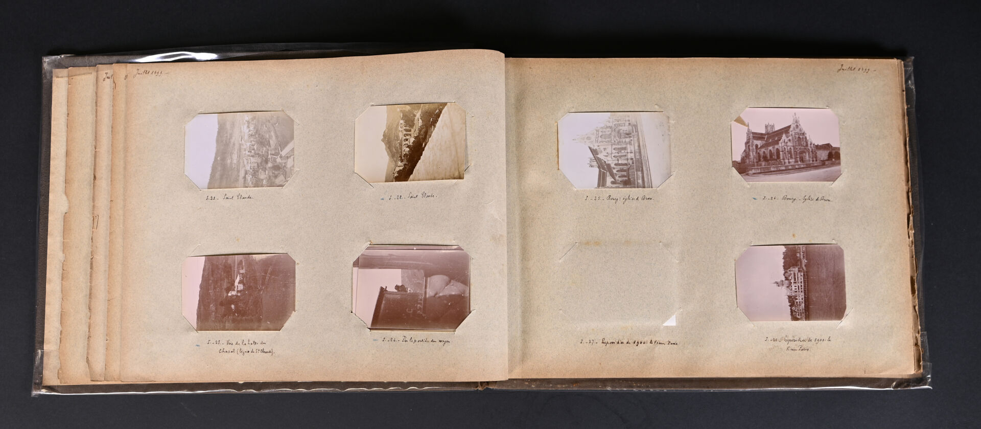 Ensemble d’environ 157 tirages photographiques miniature dans un album, sujets variés, France, étranger, militaires, portraits, paysages…. Vers 1900. Dim. moyennes : 5,2 x 7,3 cm.