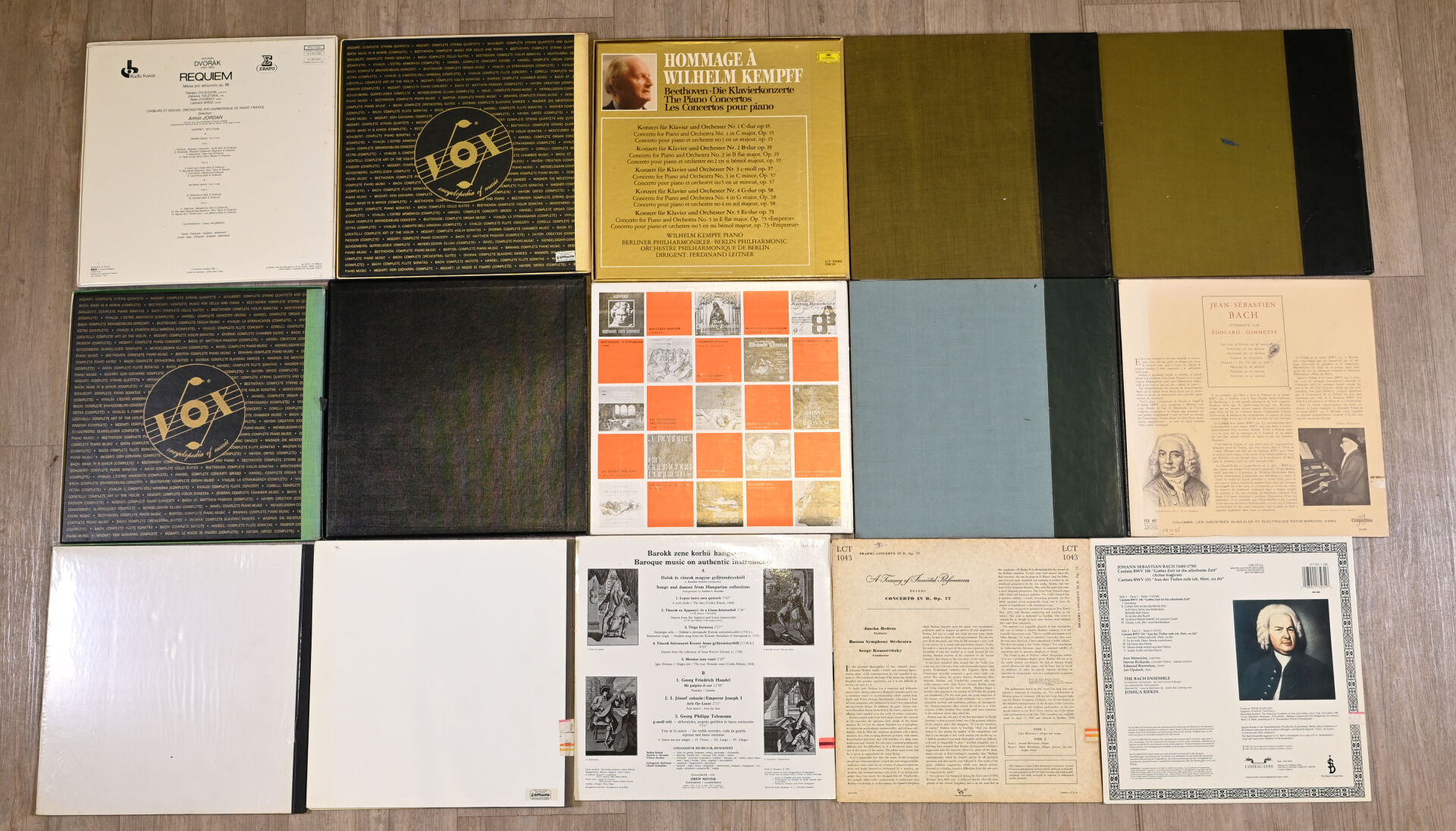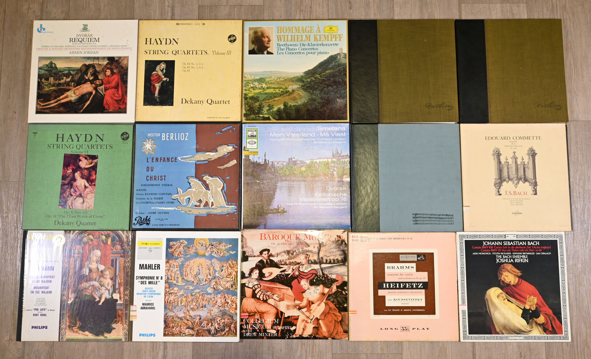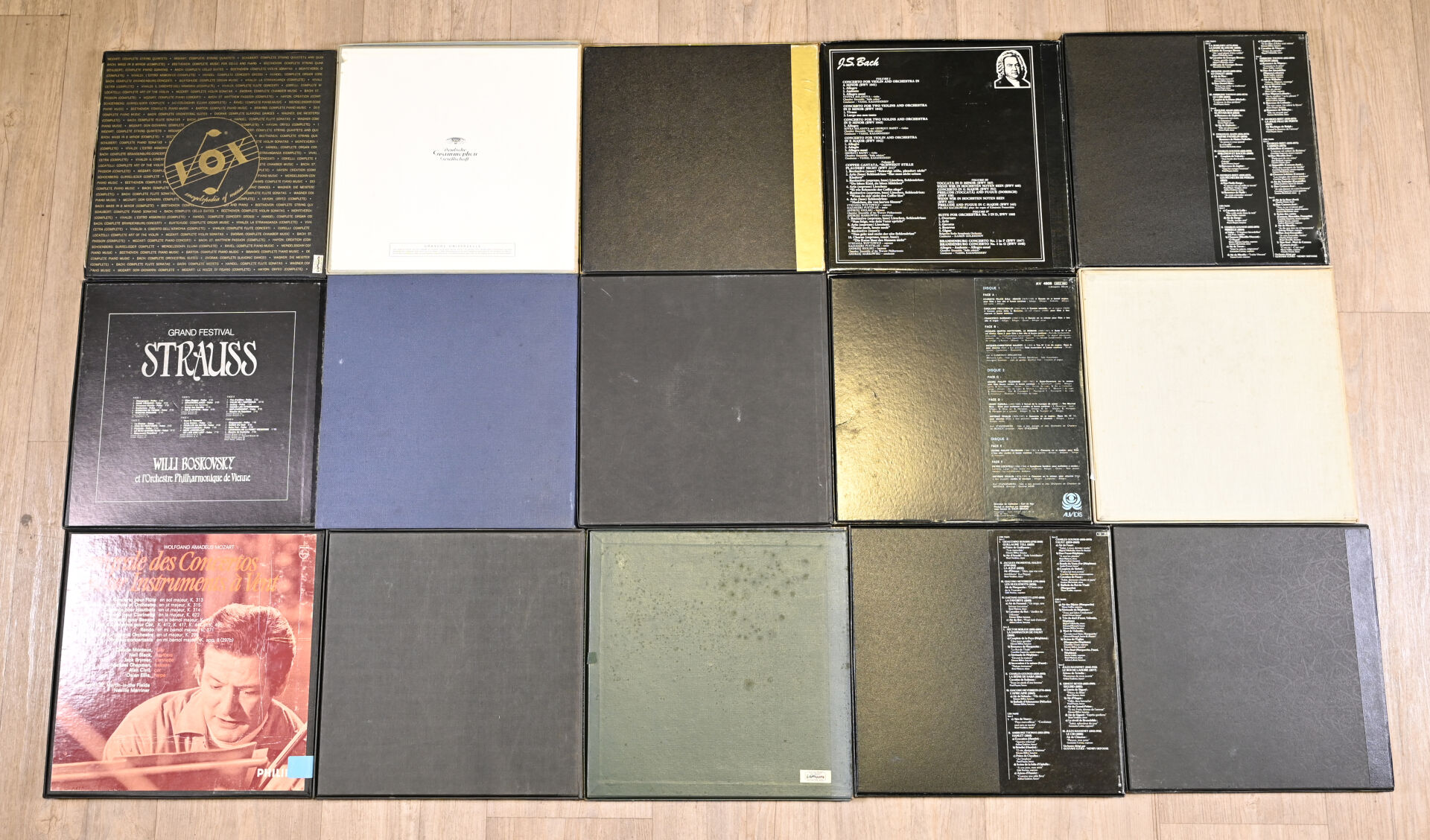 Ensemble d’environ 30 coffrets vinyles 33 tours de musique classique, dont BACH, HAYDN, VIVALDI, MAHLER, MOZART, BEETHOVEN, BERLIOZ et divers.