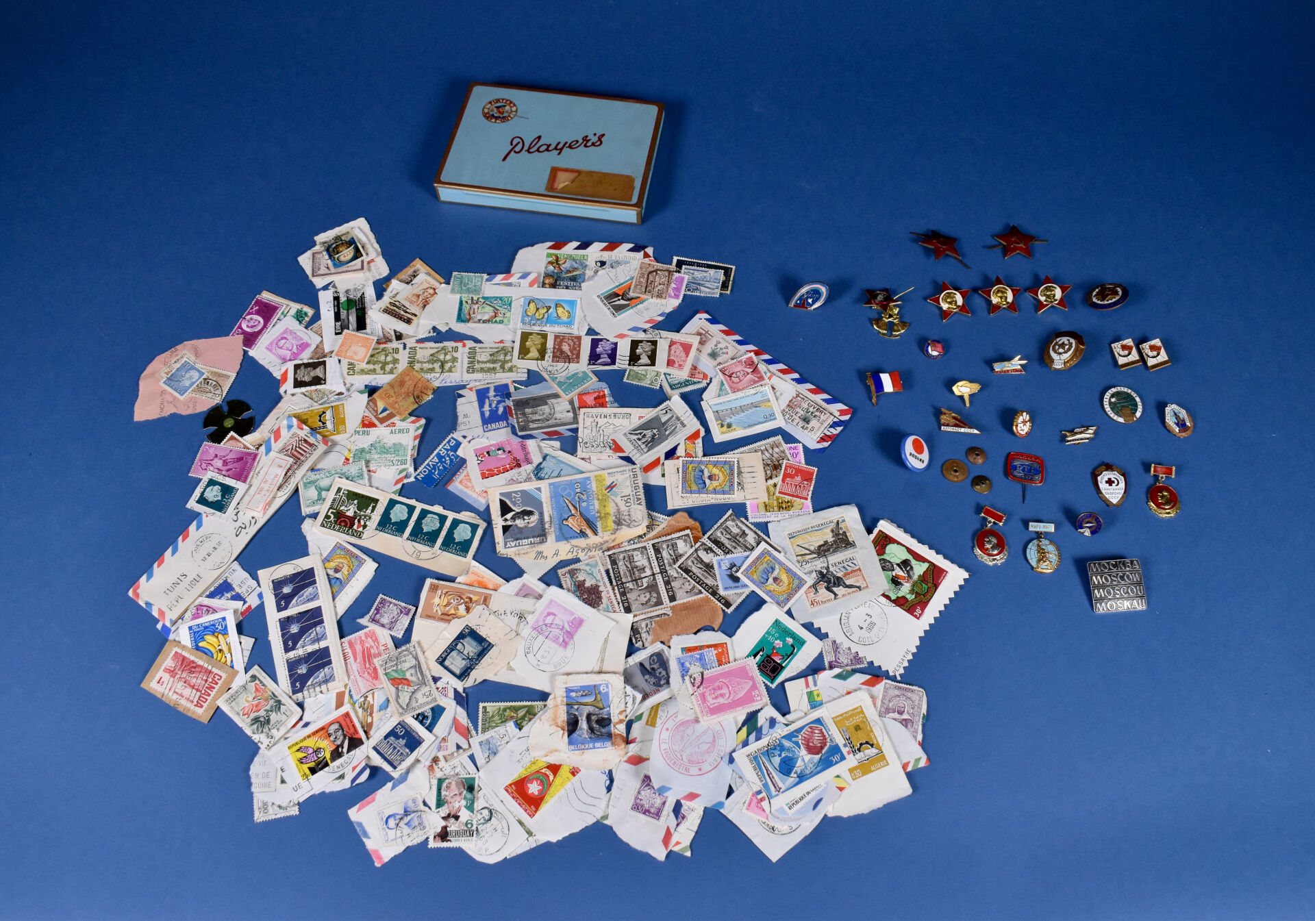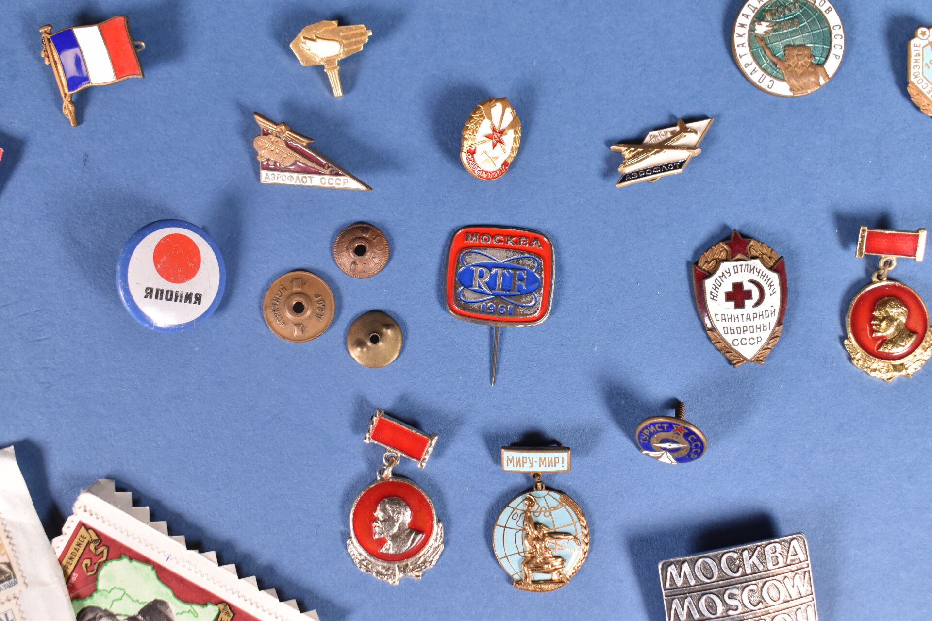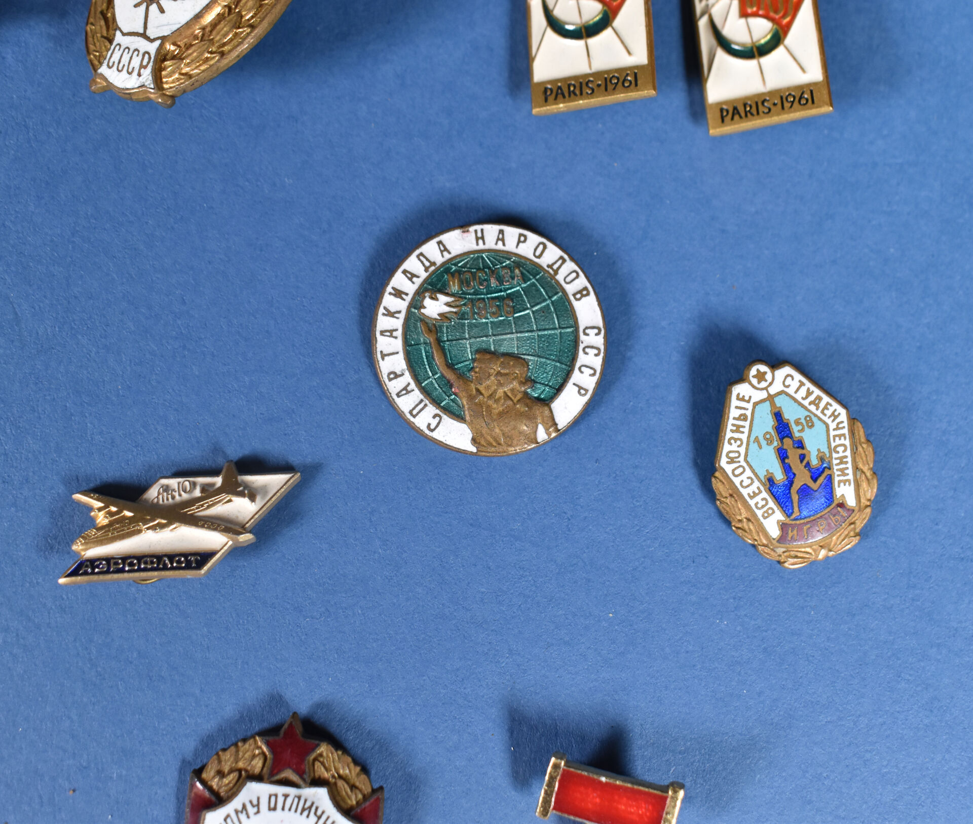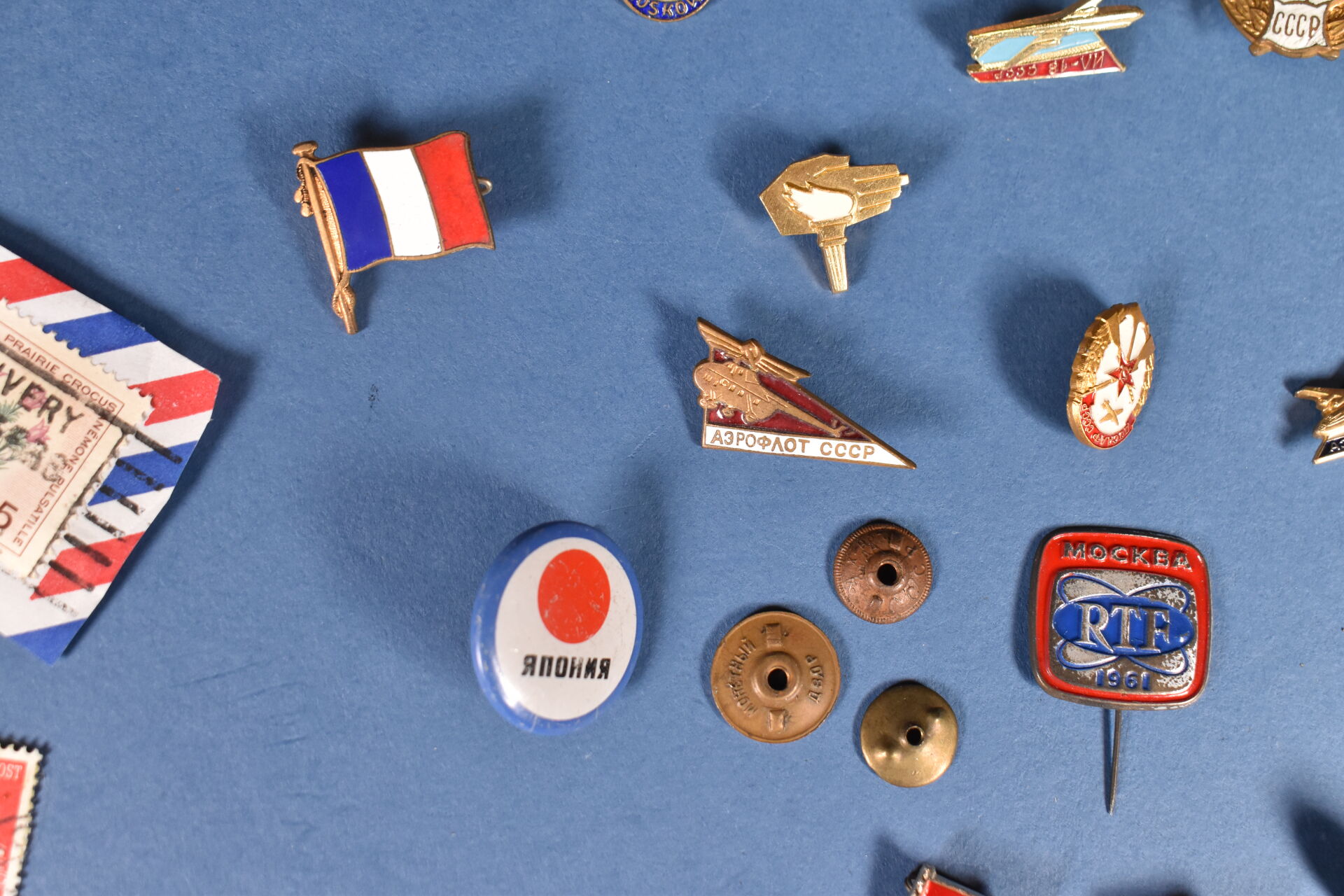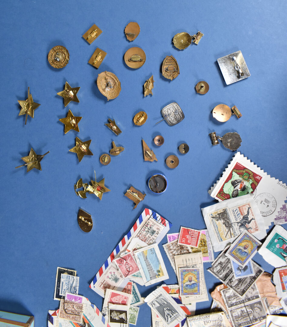 Ensemble d’insignes et de pin’s principalement URSS. On joint des timbres modernes.