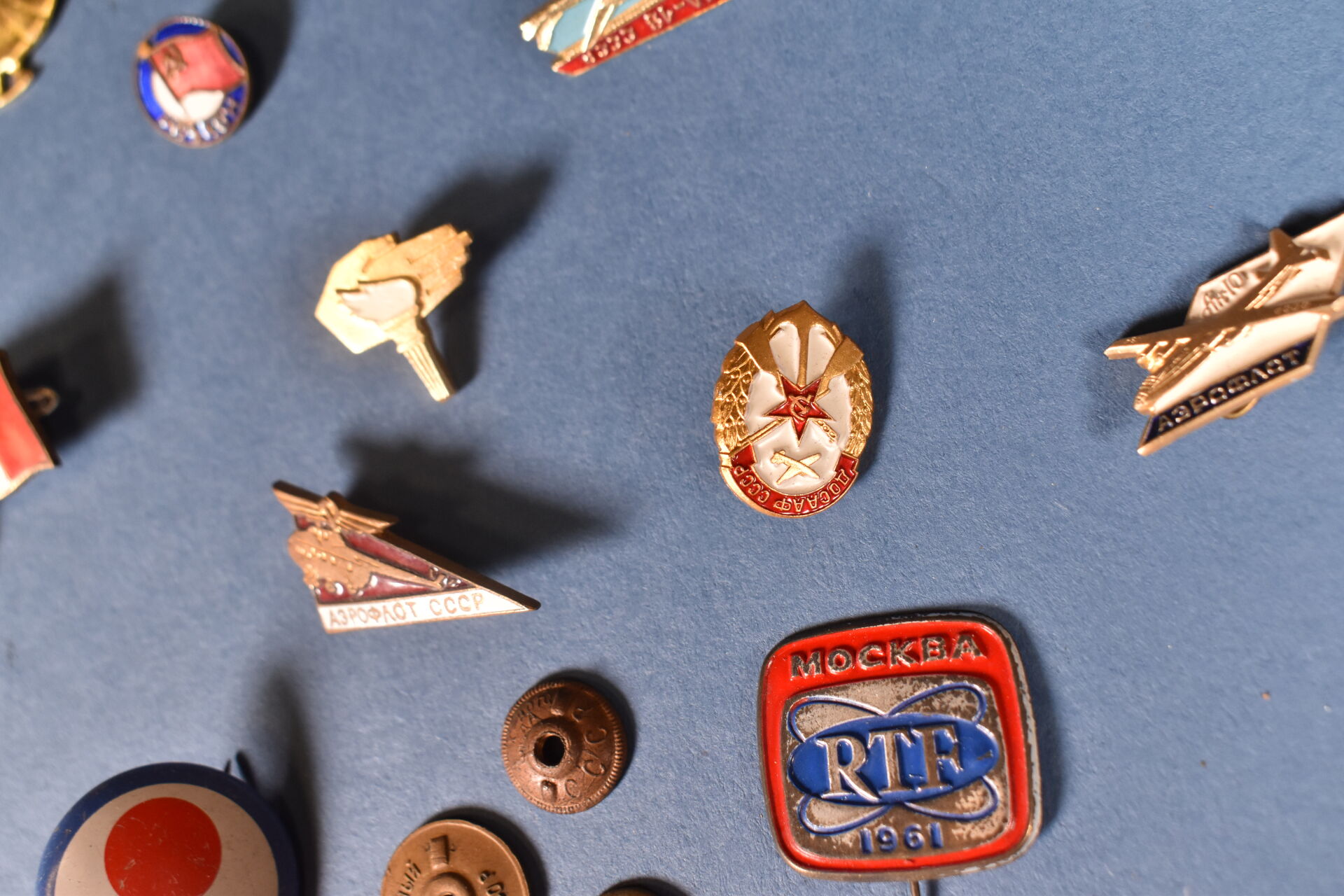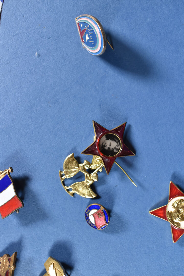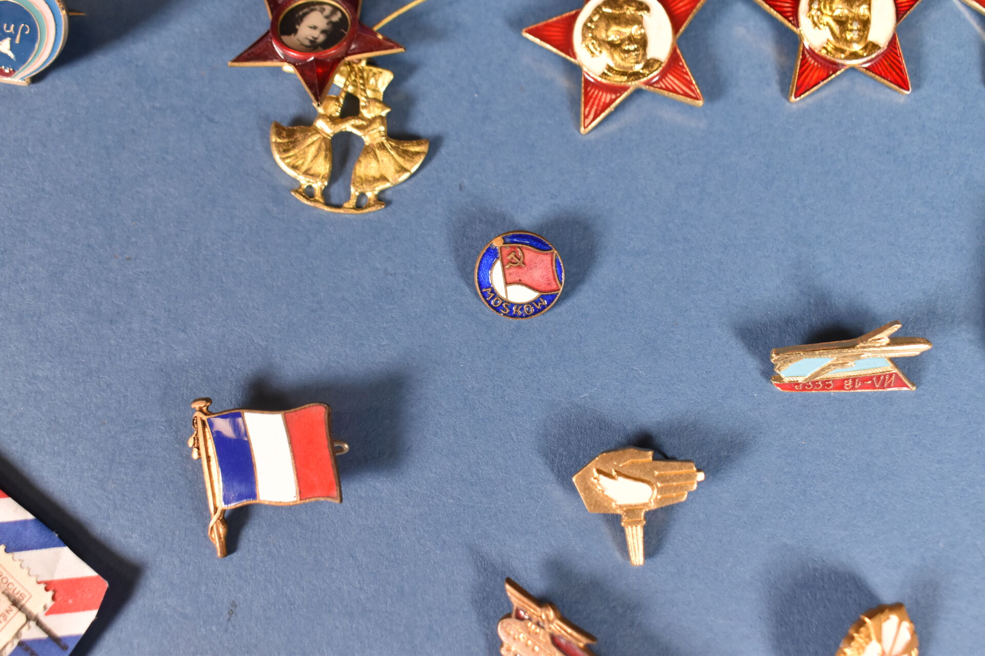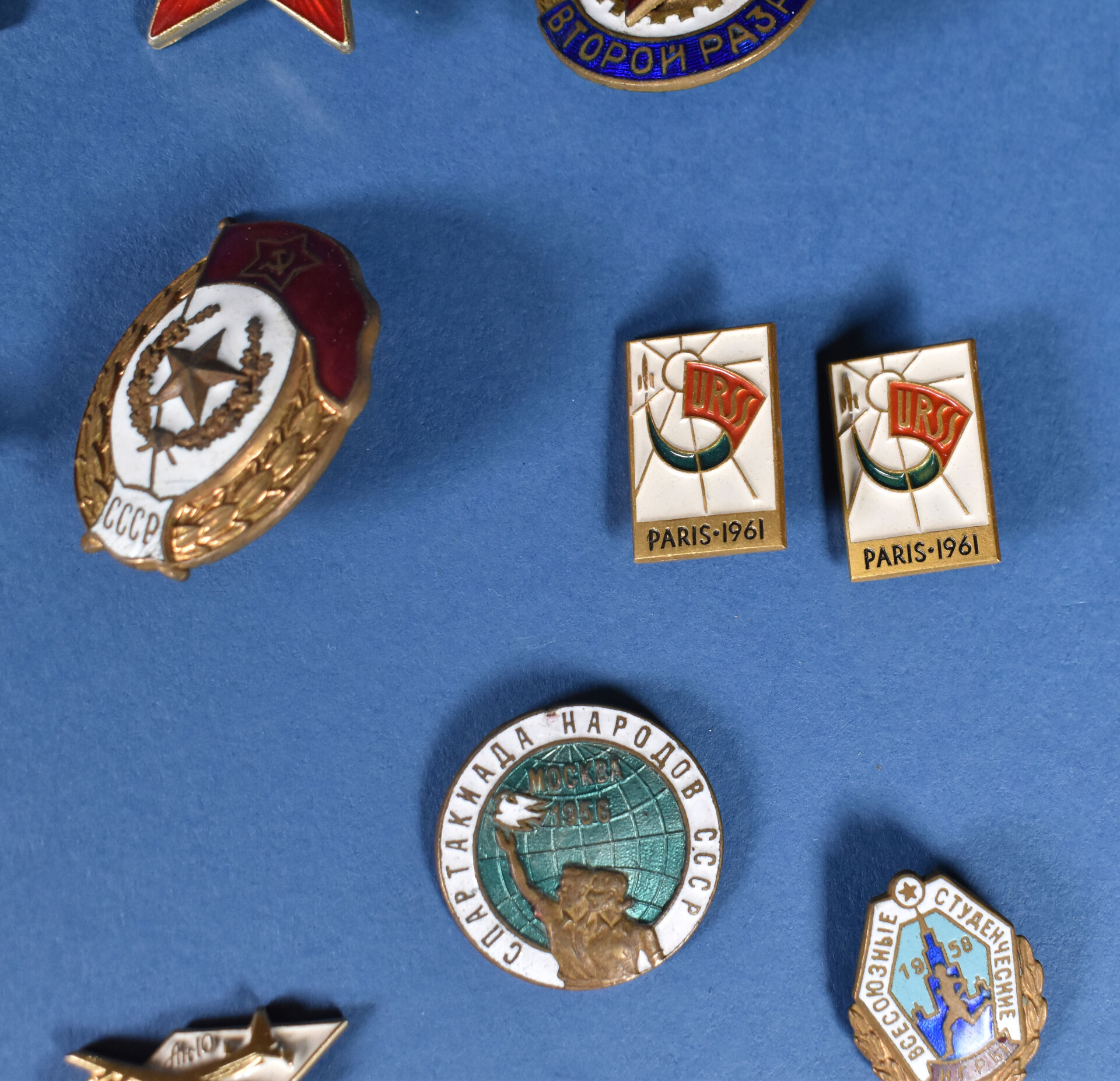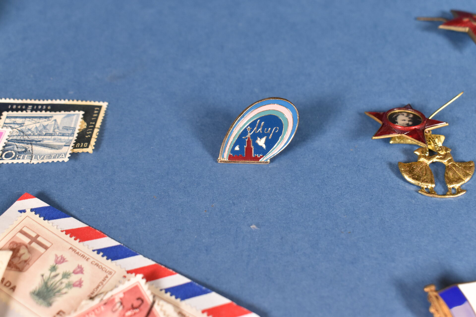 Ensemble d’insignes et de pin’s principalement URSS. On joint des timbres modernes.