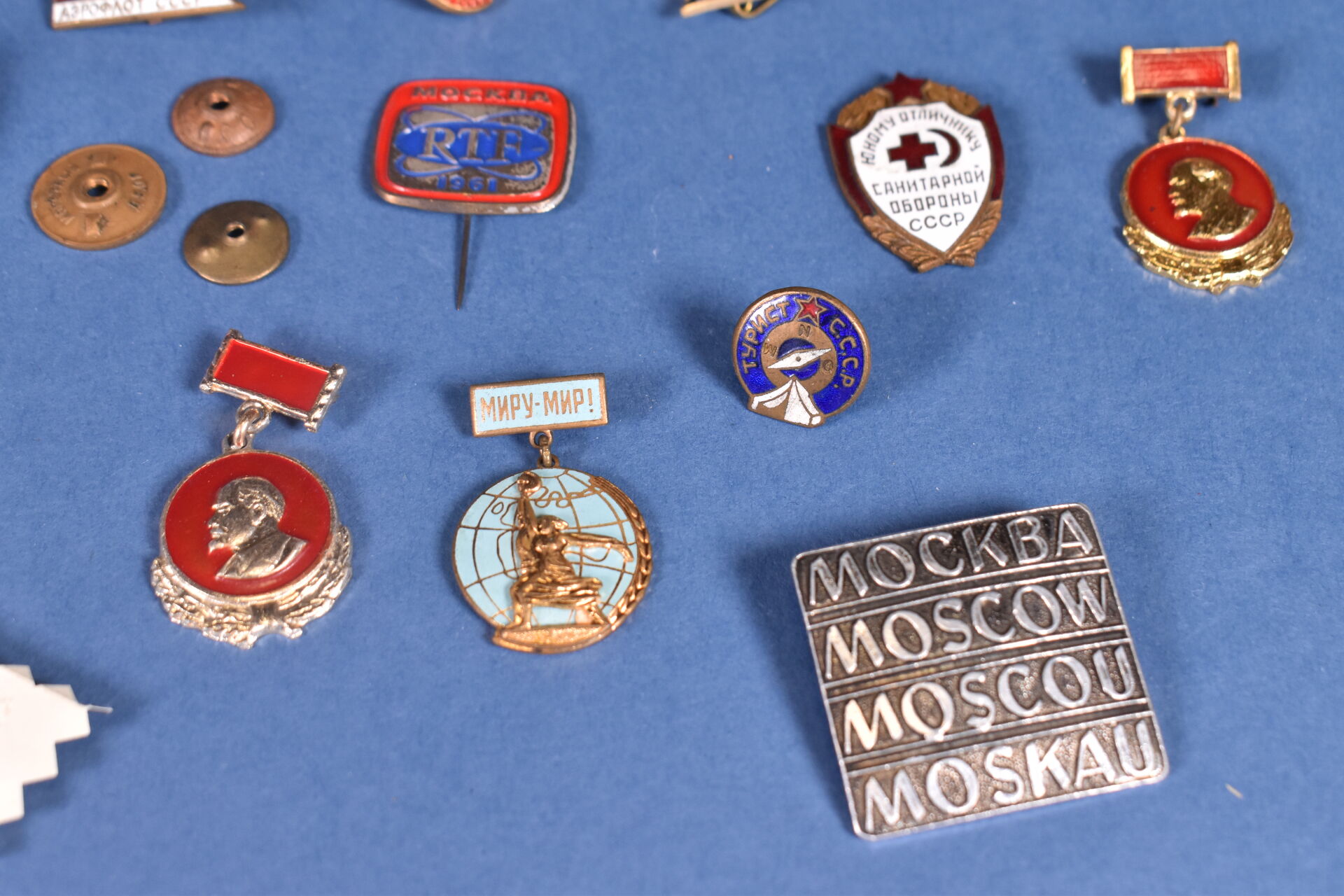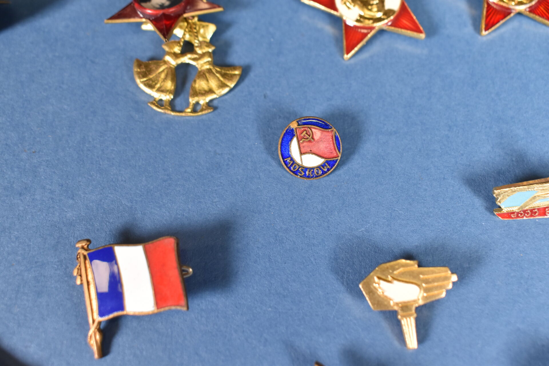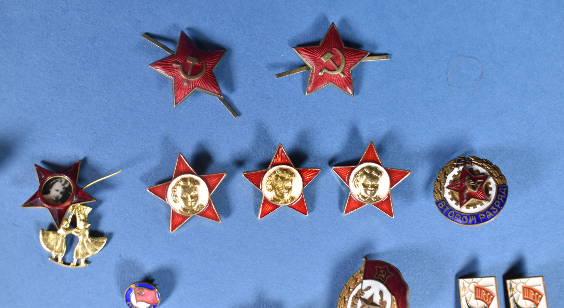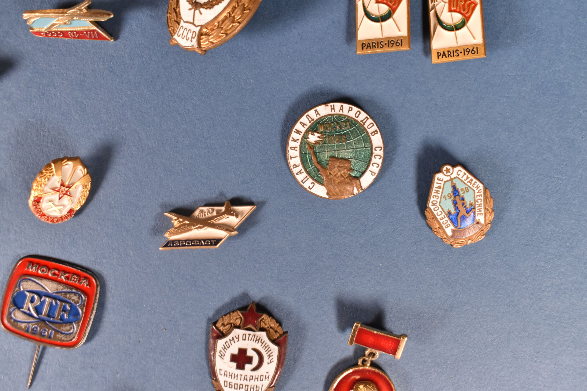 Ensemble d’insignes et de pin’s principalement URSS. On joint des timbres modernes.