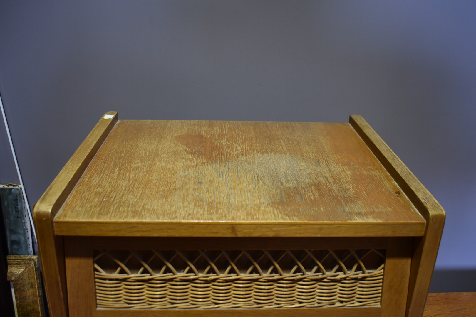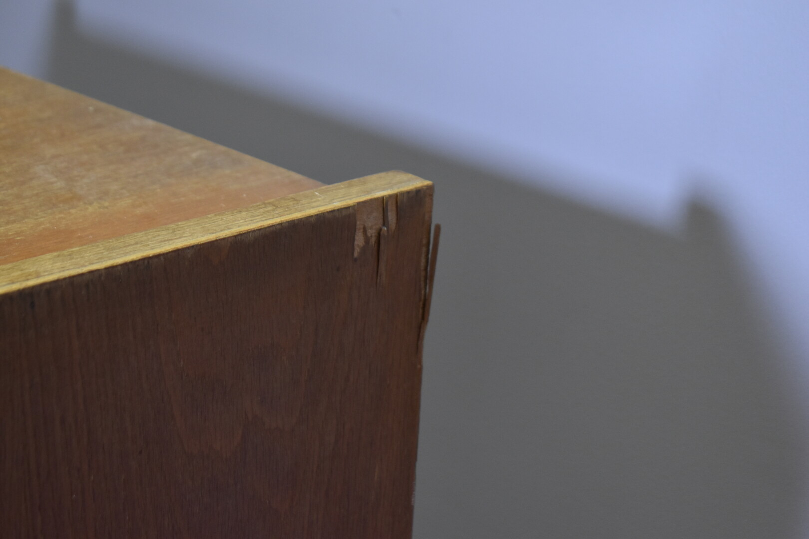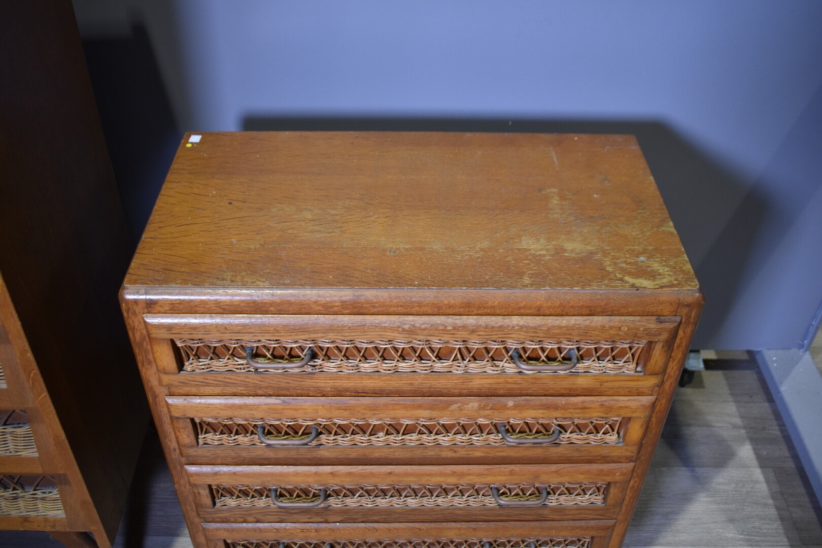 Ensemble en aggloméré plaqué de bois blond et rotin comprenant une commode ouvrant à 4 tiroirs et un chiffonier ouvrant à 6 tiroirs (usures, éclats, manques et taches). Milieu du XXe siècle. Dim. Commode : Haut. : 80,5 cm – Larg. : 76 cm – Prof. : 39 cm. Dim. chiffonier : Haut. : 126 cm – Larg. : 55 cm – Prof. : 42,5 cm.